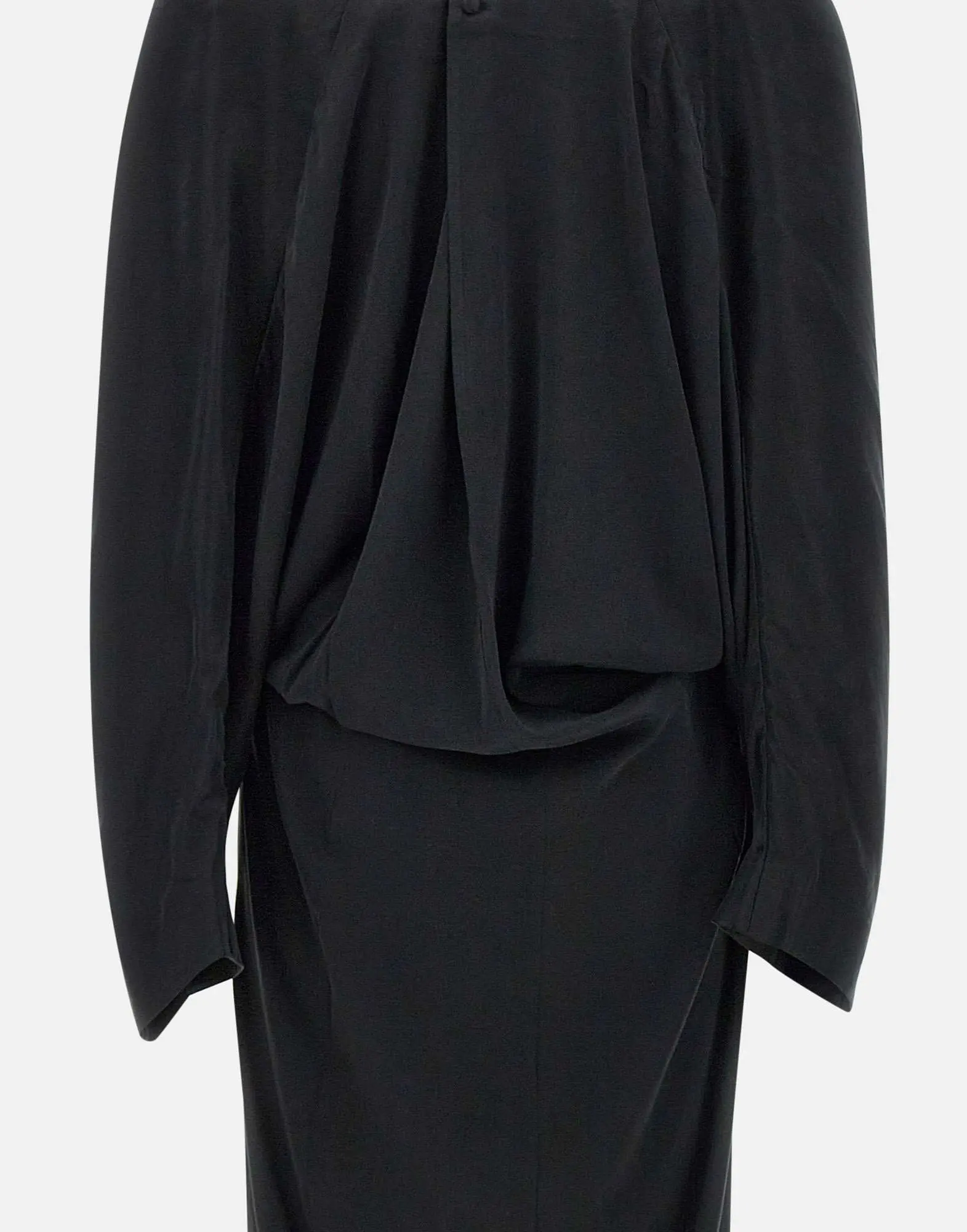 ‘Bat Sleeve Dress’ Remain Birger Christensen, black, Cupro and Viscose fabric, super soft, plunging neckline, bare shoulders, voluminous bat sleeves, maxi length, wide front slit for ease of movement, button fastening at back, relaxed fit