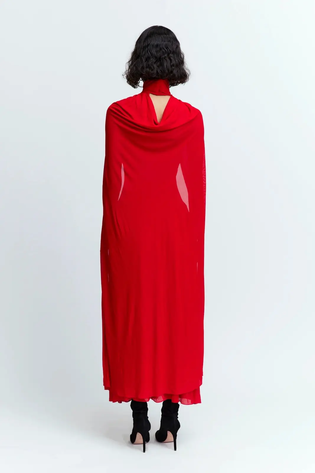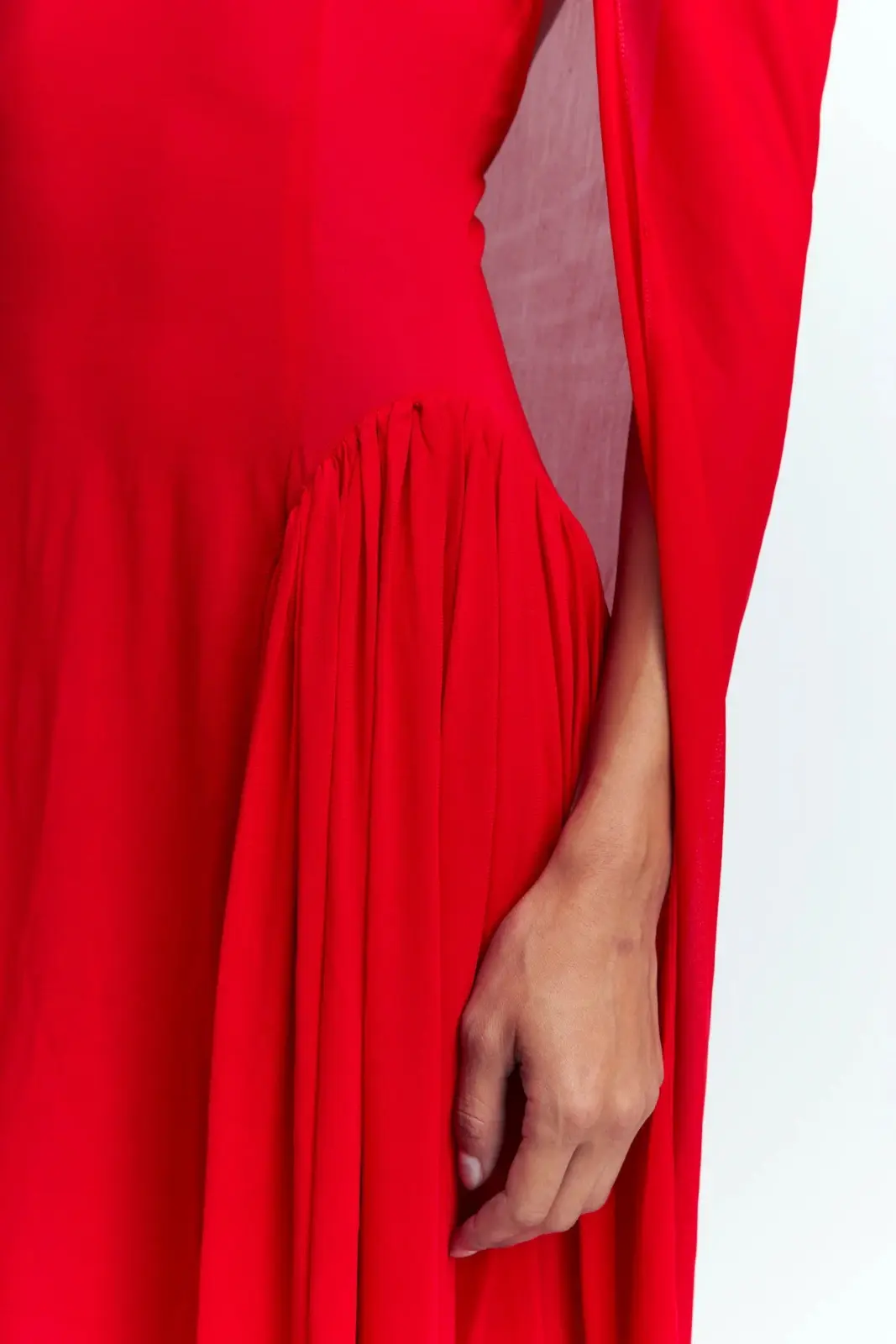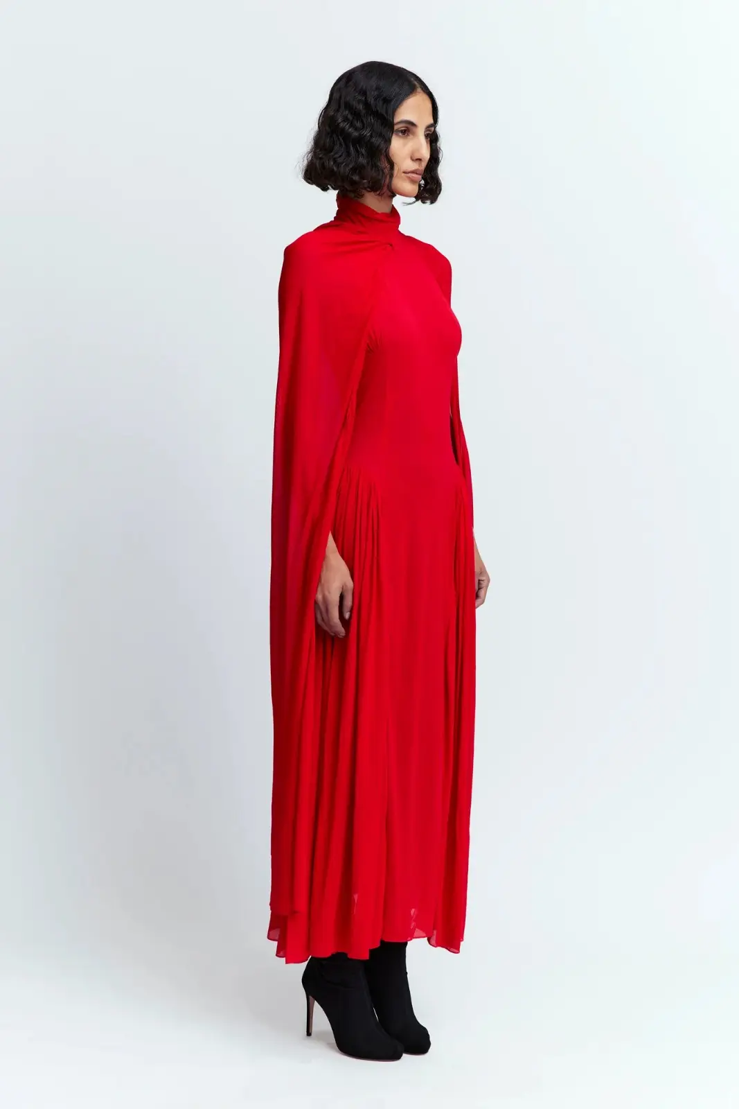 The Rao Midi Dress in red is a funnel neck midi dress with an attached cape. The dress features ruched detailing on the hips that fall into the skirt of the dress to create pleats. At the neckline, the cape is attached and it has arm holes where the arms are to be inserted to wear as sleeves. The Rao is designed to fit close to the body and can be fastened at the back with a zip
