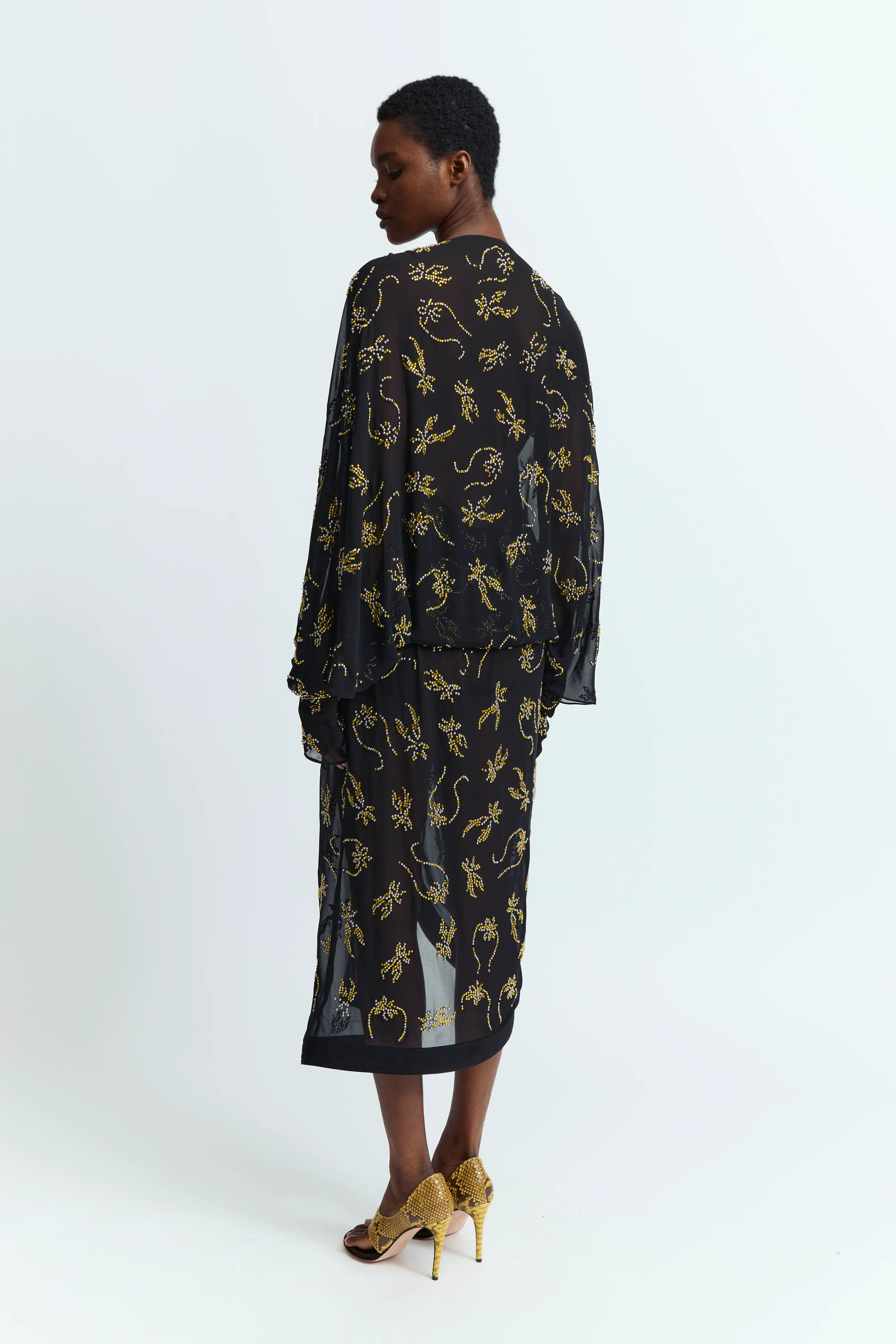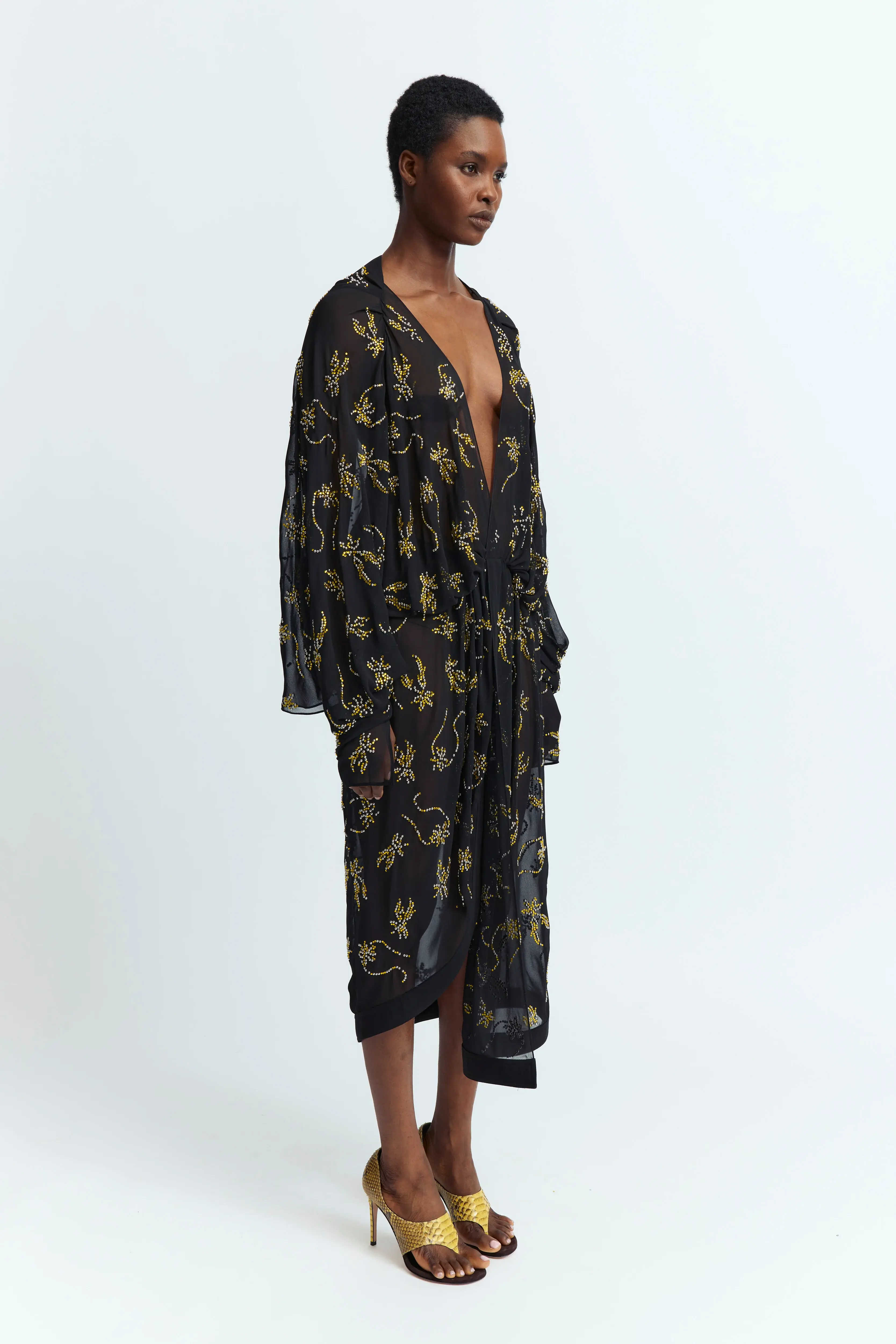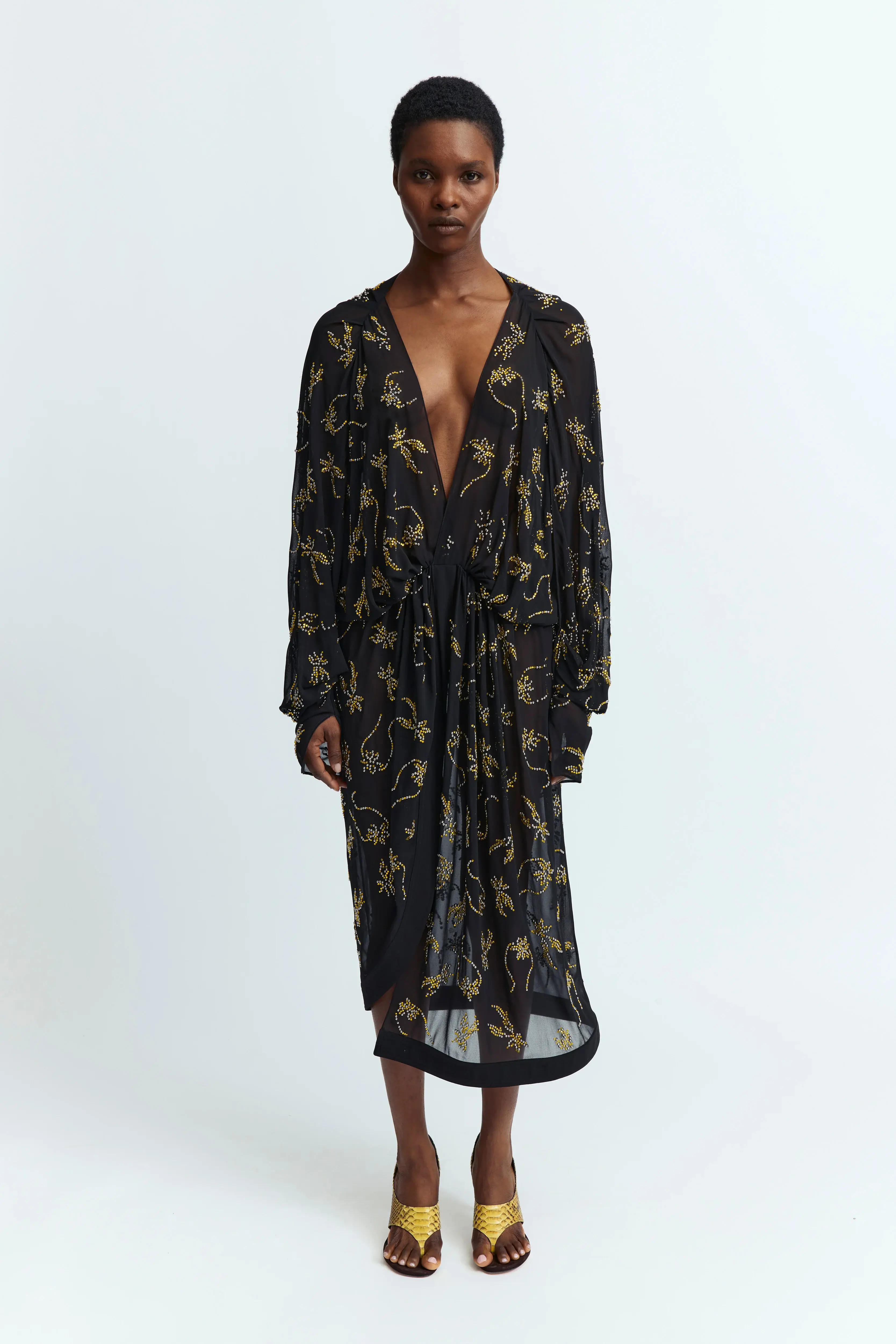 The Licia Dress in black features a deep plunge neckline, long sleeves, and cuffed wrists. Citrine-colored hotfix crystal embellishments in a custom floral pattern accent the design. Ruching along the waist adds subtle shape, while the loose fit and below-the-knee length create an effortlessly relaxed silhouette. A key design from the SS25 runway, this style defines the season’s statement look.