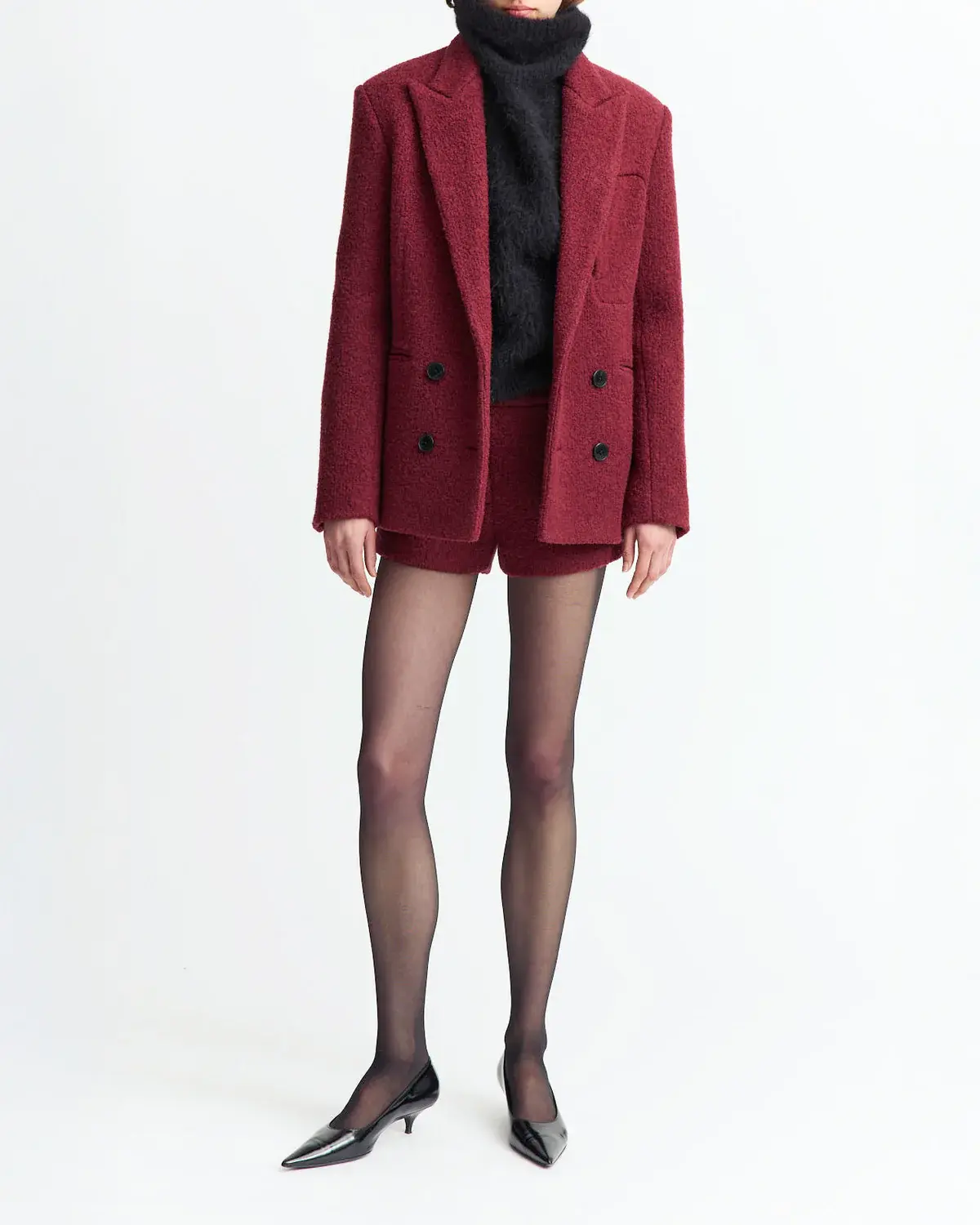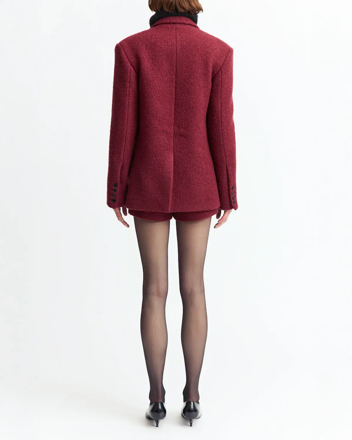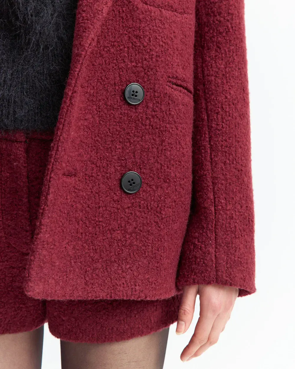 The Vale Jacket is a tailored double-breasted blazer cut from rich burgundy bouclé, offering soft texture with a structured finish.