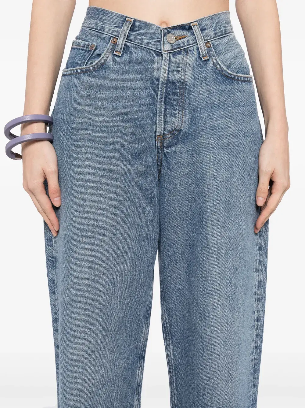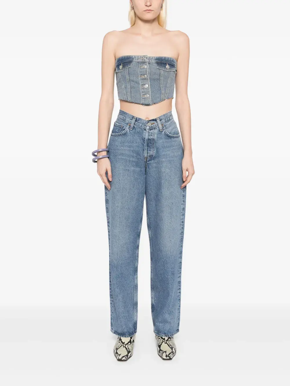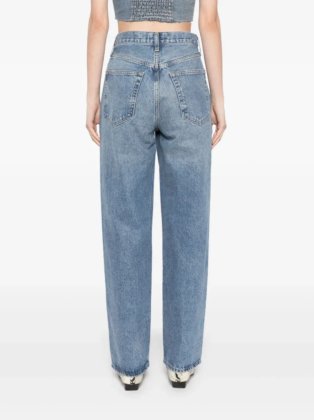fairway blue regenerative cotton blend denim concealed zip-fly and button fastening contrast stitching whiskering effect at the thighs belt loops classic five pockets full-length straight leg
