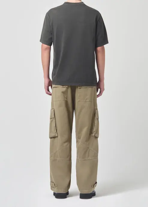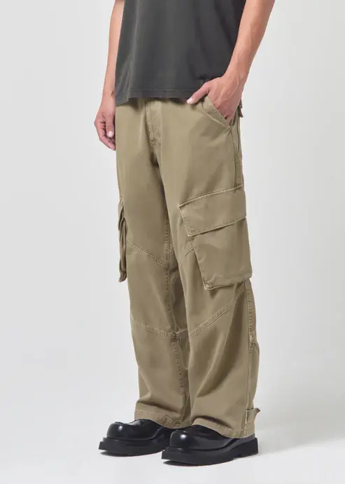 Utility inspired cargo with added dimension, exaggerated pockets and an adjustable leg opening tab.