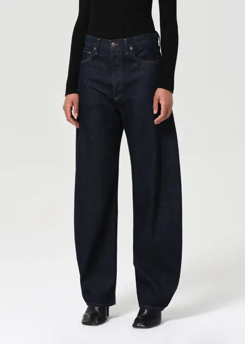 The Luna Pieced Jean is defined by its dramatic, curved leg and high-rise waist, bringing sculptural volume to a classic silhouette. Cut in a dark, clean rinse and crafted from soft, weightless denim, this standout shape is finished with subtle seaming details. Style with a tucked-in top to highlight the unique lines.