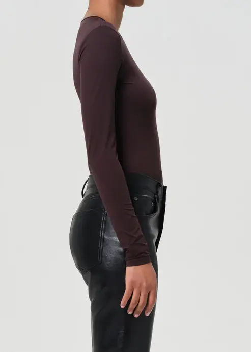 The Aura Long Sleeve Bodysuit in Chocolate is a dark brown crewneck made from a lightweight, second-skin fabric. Its sleek, form-fitting design offers a smooth silhouette, perfect for layering or wearing on its own.