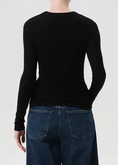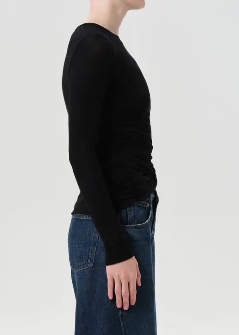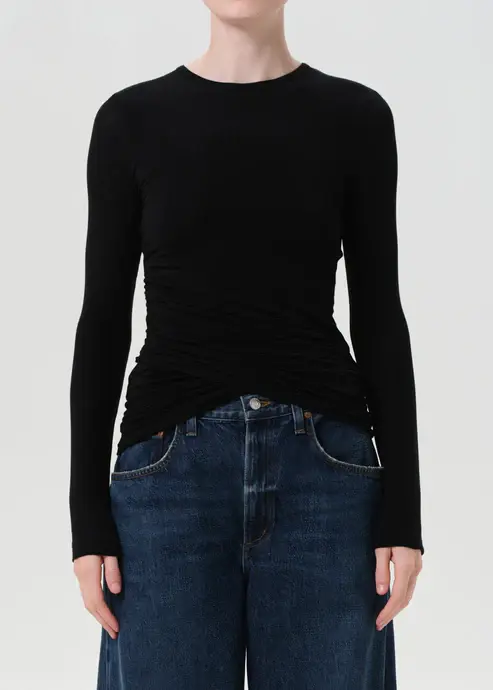 The Eve Twist Tee is a long sleeve crewneck with subtle front twist detailing at the hem for a softly draped effect. Form-fitting and flexible with a refined feel. Style it with high-rise denim or layered under jackets for a sleek, everyday base.