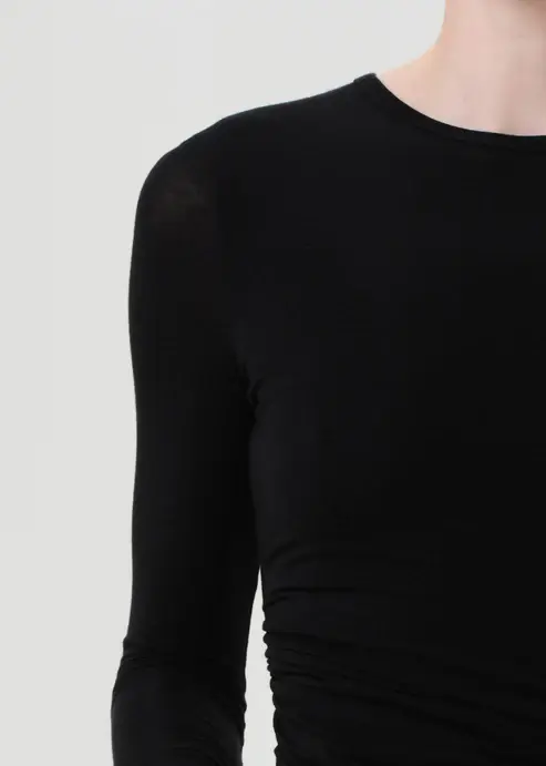 Looks Like: True black long sleeve crewneck tee with front twist detailing at the hem line