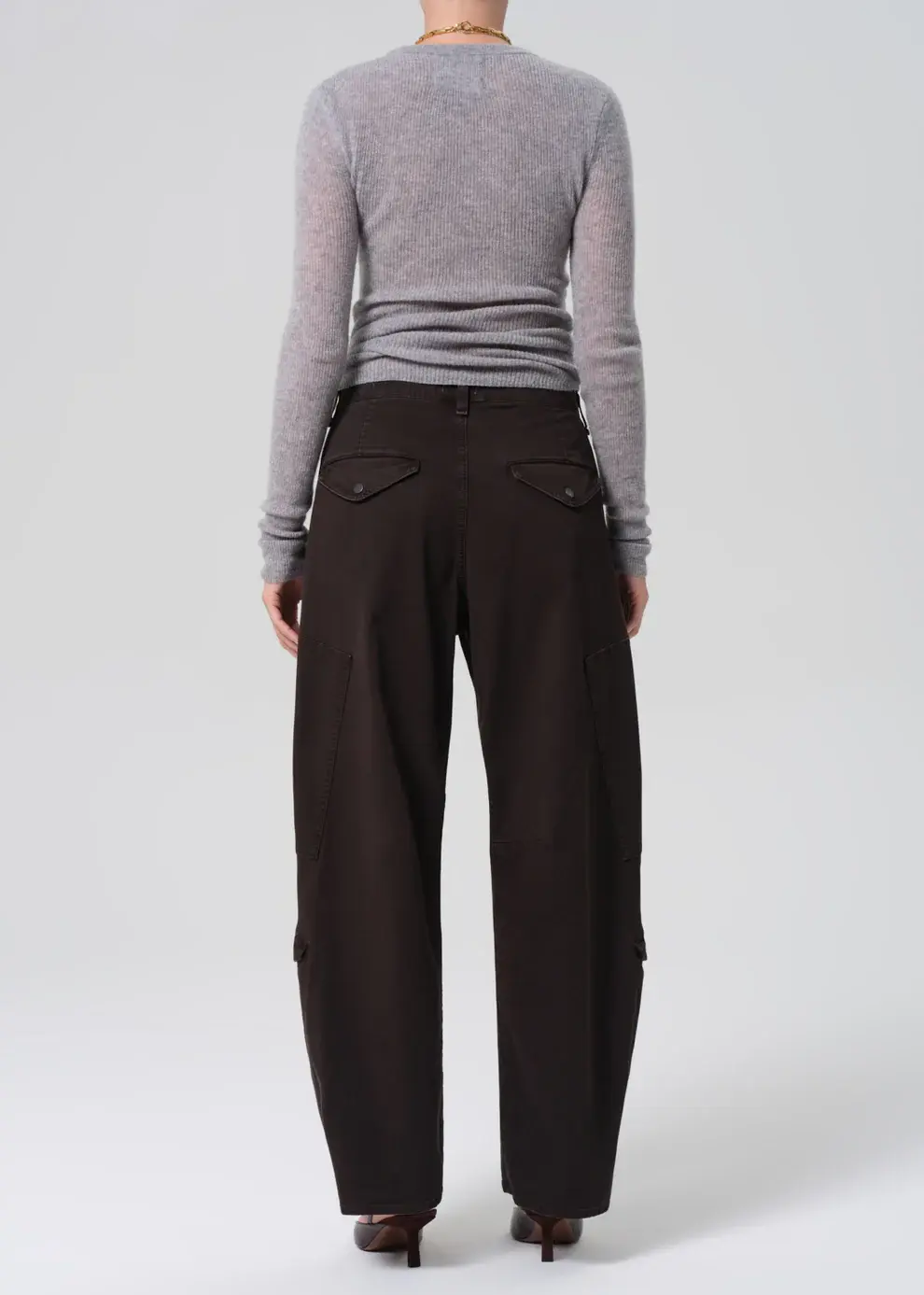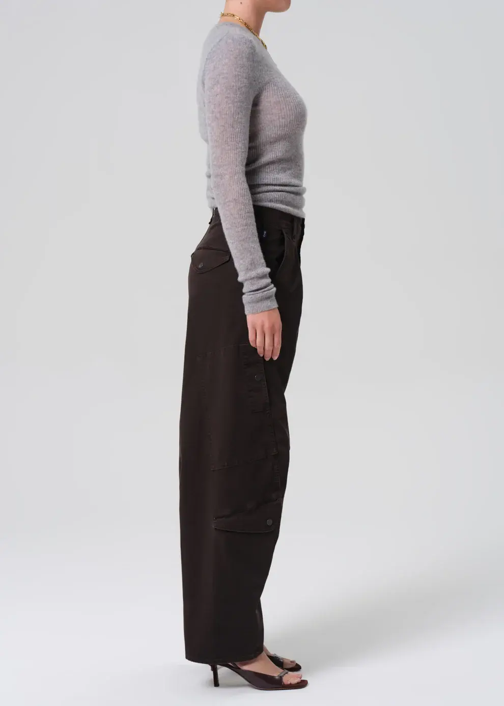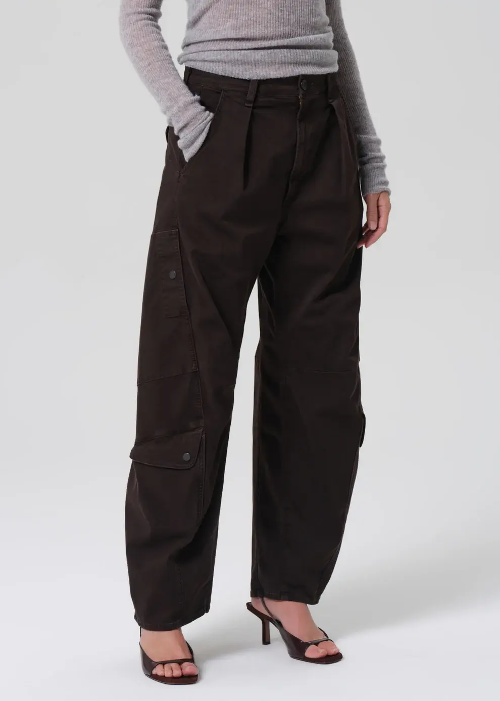 Looks Like: Dark brown cargo pant with pleat detailing and side pockets