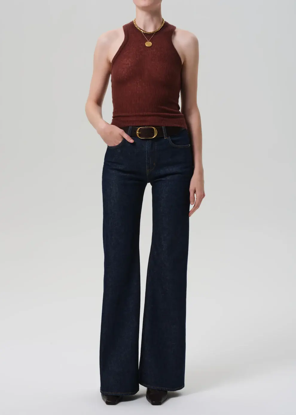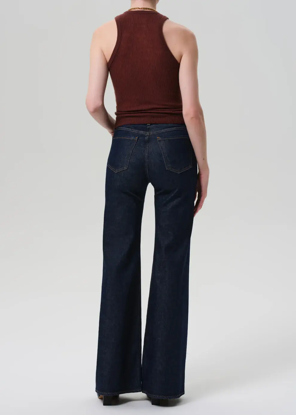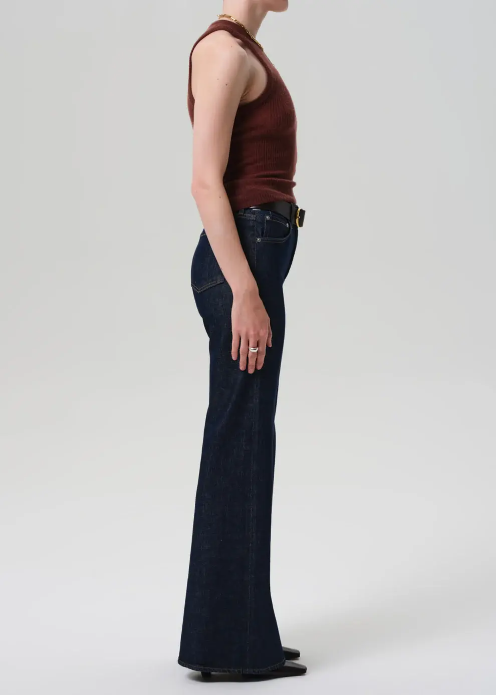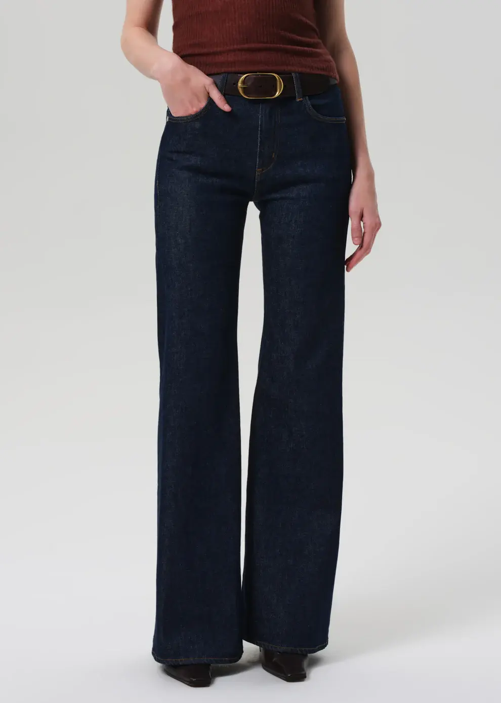 The Kimberly is a high-rise flare inspired by classic '70s silhouettes, designed to elongate the leg and contour the waist. Crafted from comfort stretch denim with a super soft hand, it offers lasting shape and all-day ease. The Helia wash—a clean, dark indigo rinse—adds a polished, versatile finish. Style with slim knits or structured shirting for a clean look.