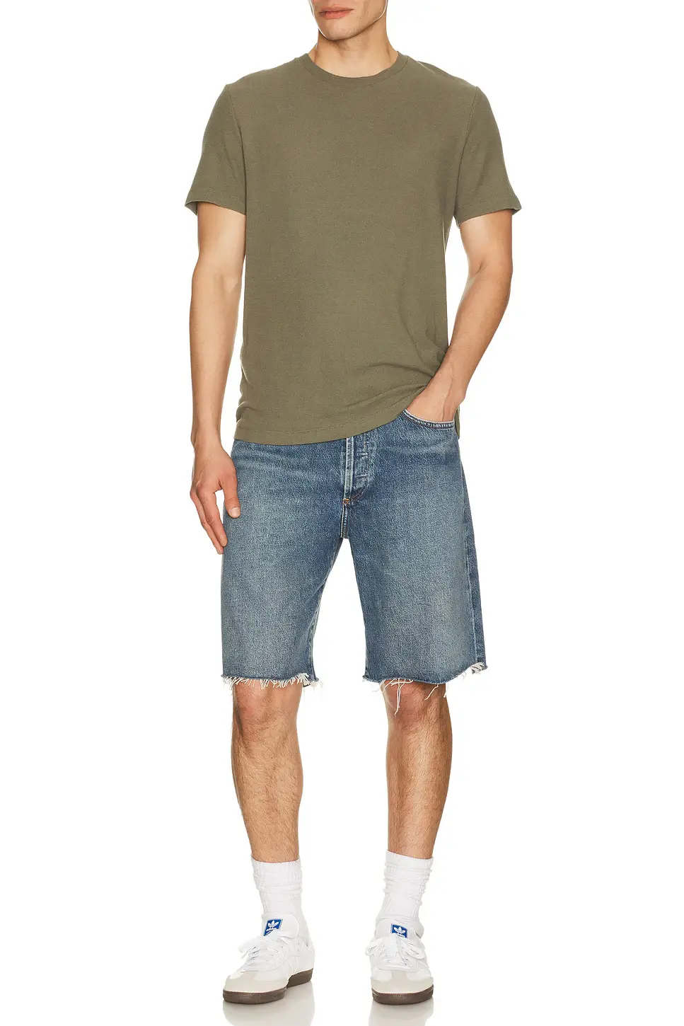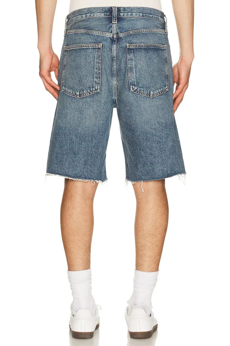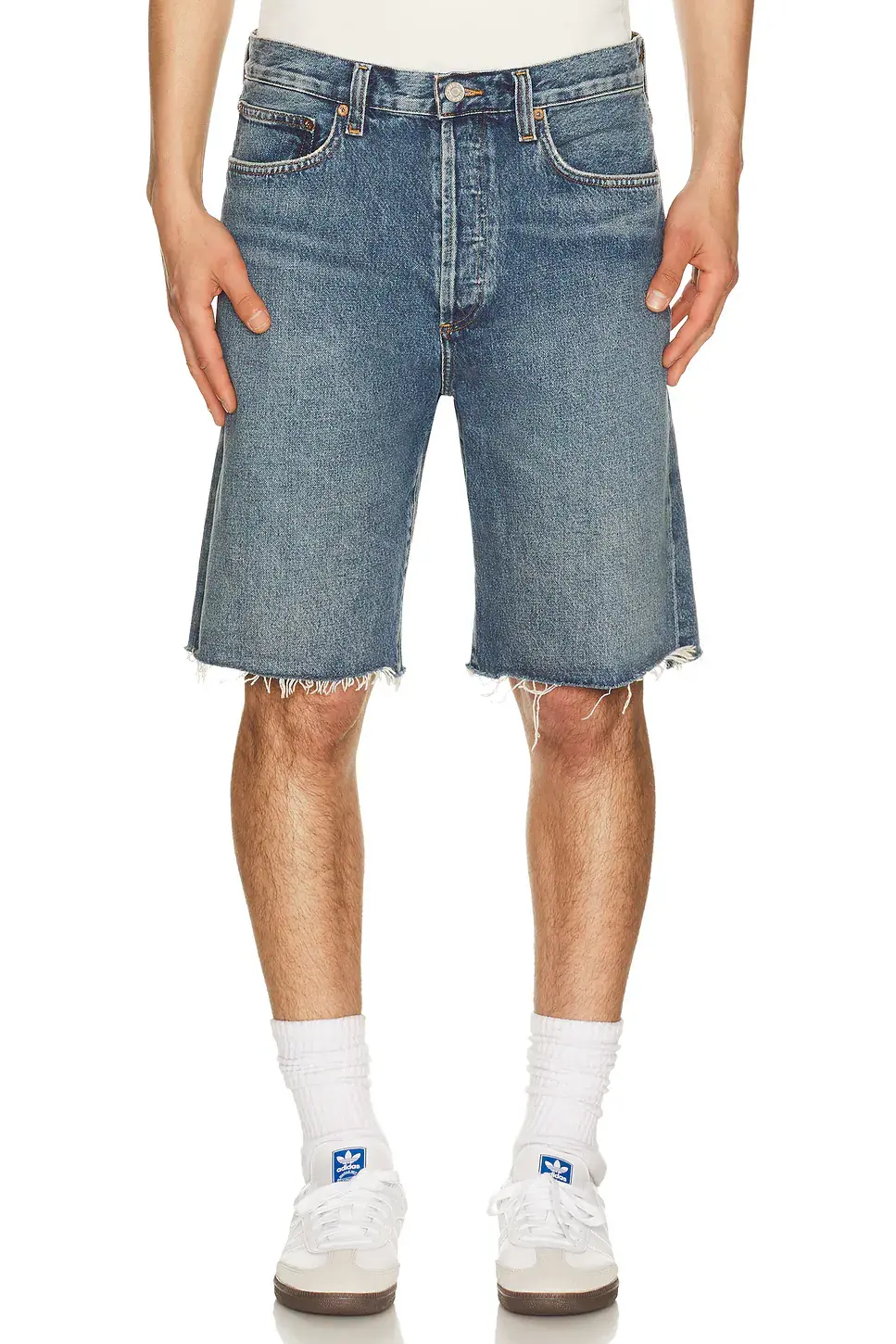 100% cotton Machine wash Button fly closure 5-pocket styling Midweight rigid denim with raw cut hem Shorts measure approx 53 cm in length Made in Turkey
