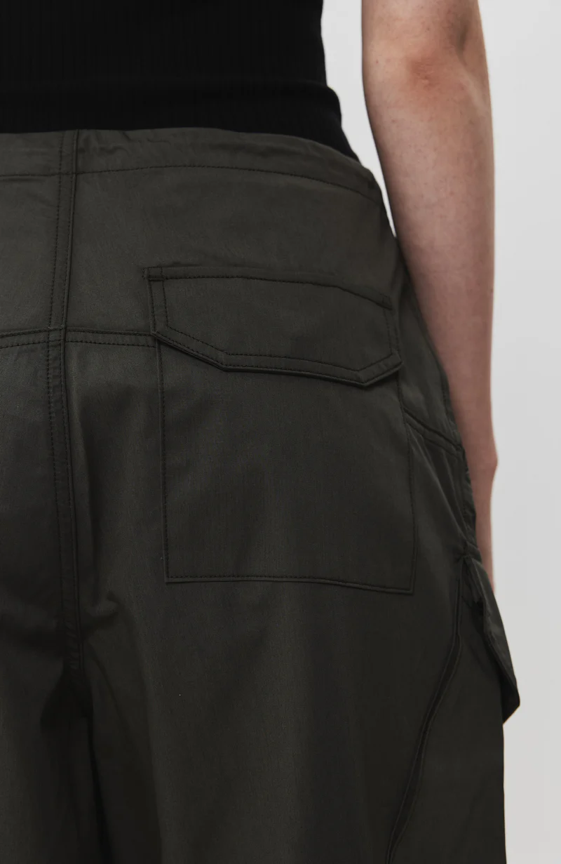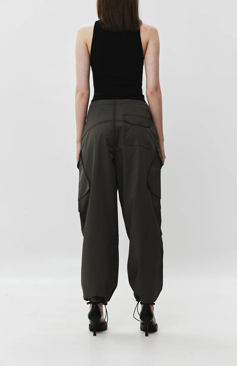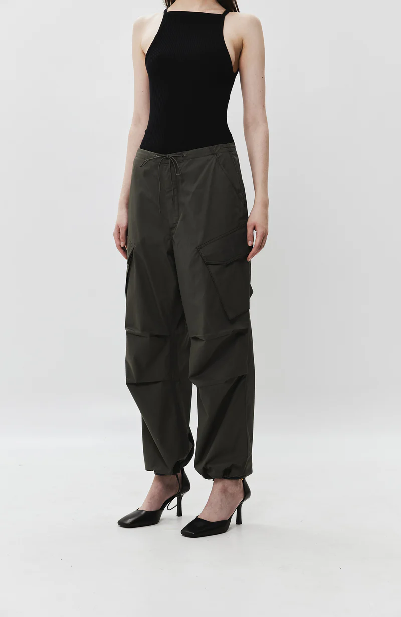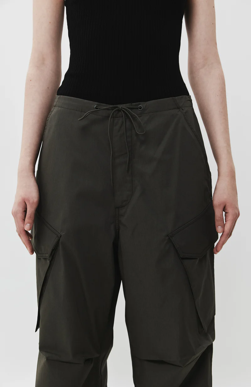 Cargo pants are being integrated into women's wardrobe with flowy silhouette, drawstring regulated waisband and bottom hems, as well as classic spacious pockets on the sides and flap-pockets on the back.