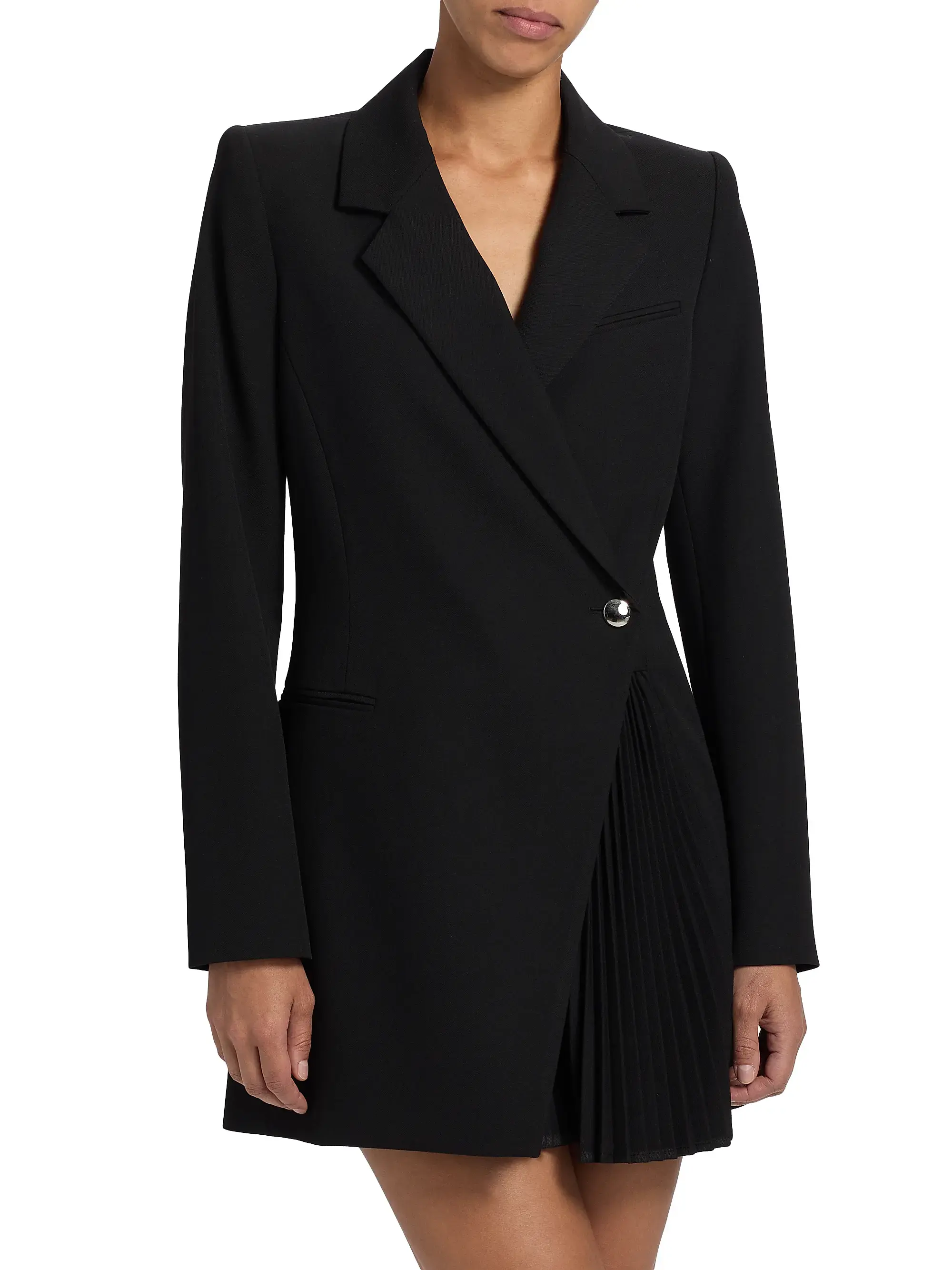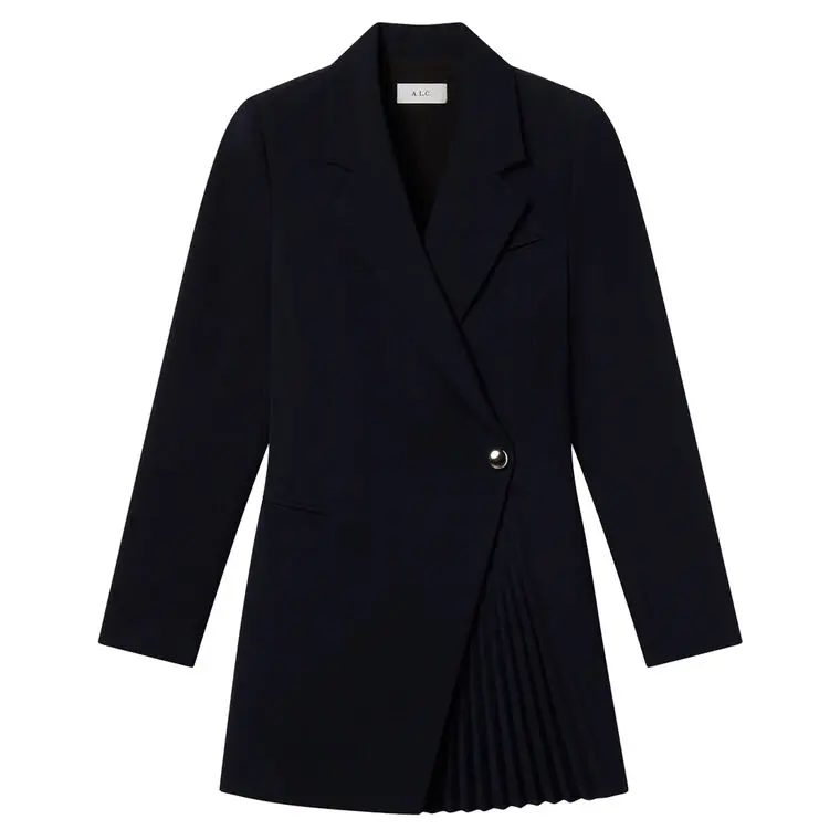 The Callen Dress is crafted from a transitional blend suiting fabric in a navy hue. This mini silhouette takes inspiration from classic tailoring and features a crossover closure, contrasted by a pleated skirt detail. Fully lined. Button closure.
