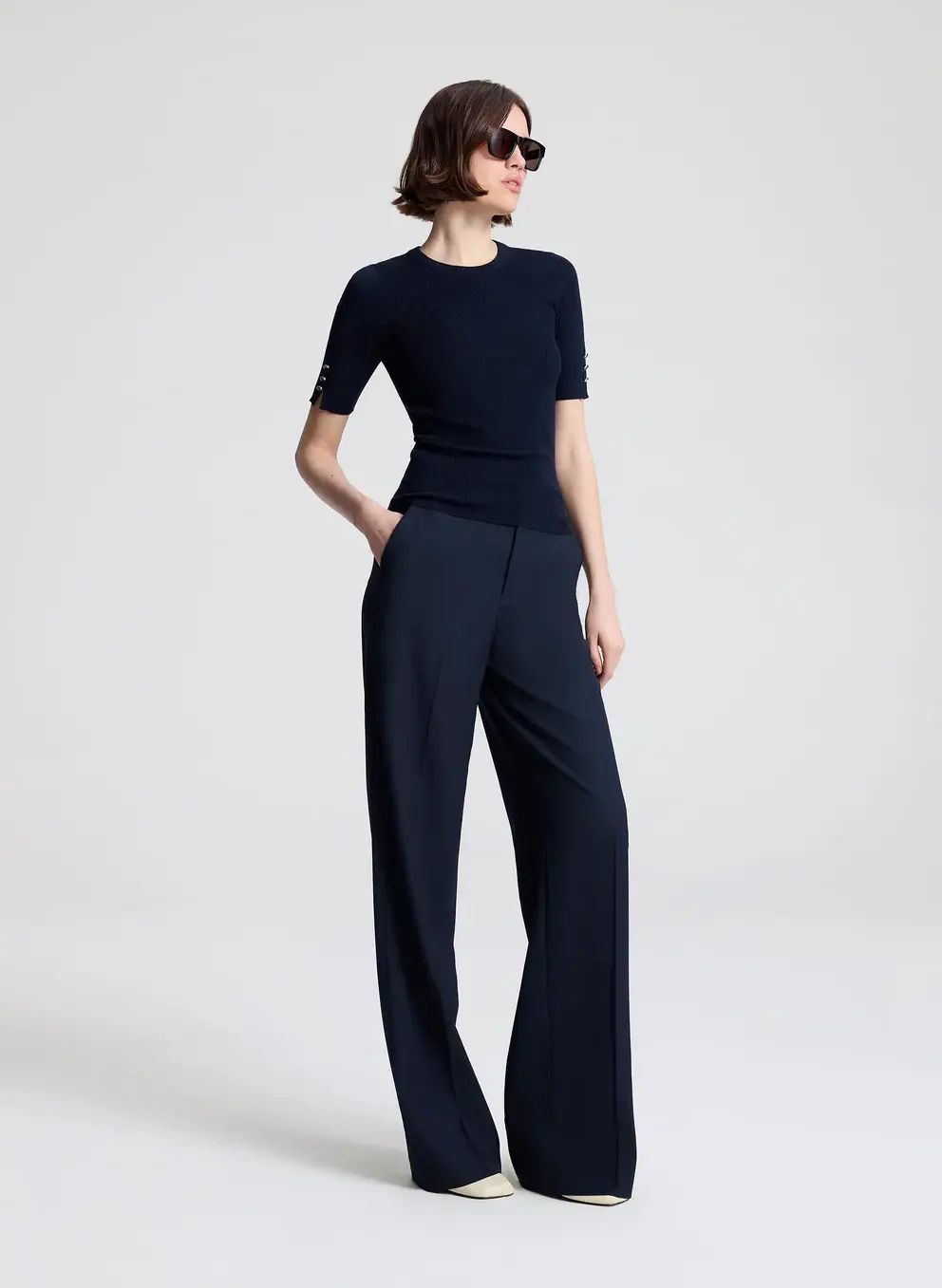 A knitted tee crafted from luxe stretch Italian merino wool. This ribbed knit features mid-length sleeves with refined slit-and-button detailing at the arm. Shop Tops.