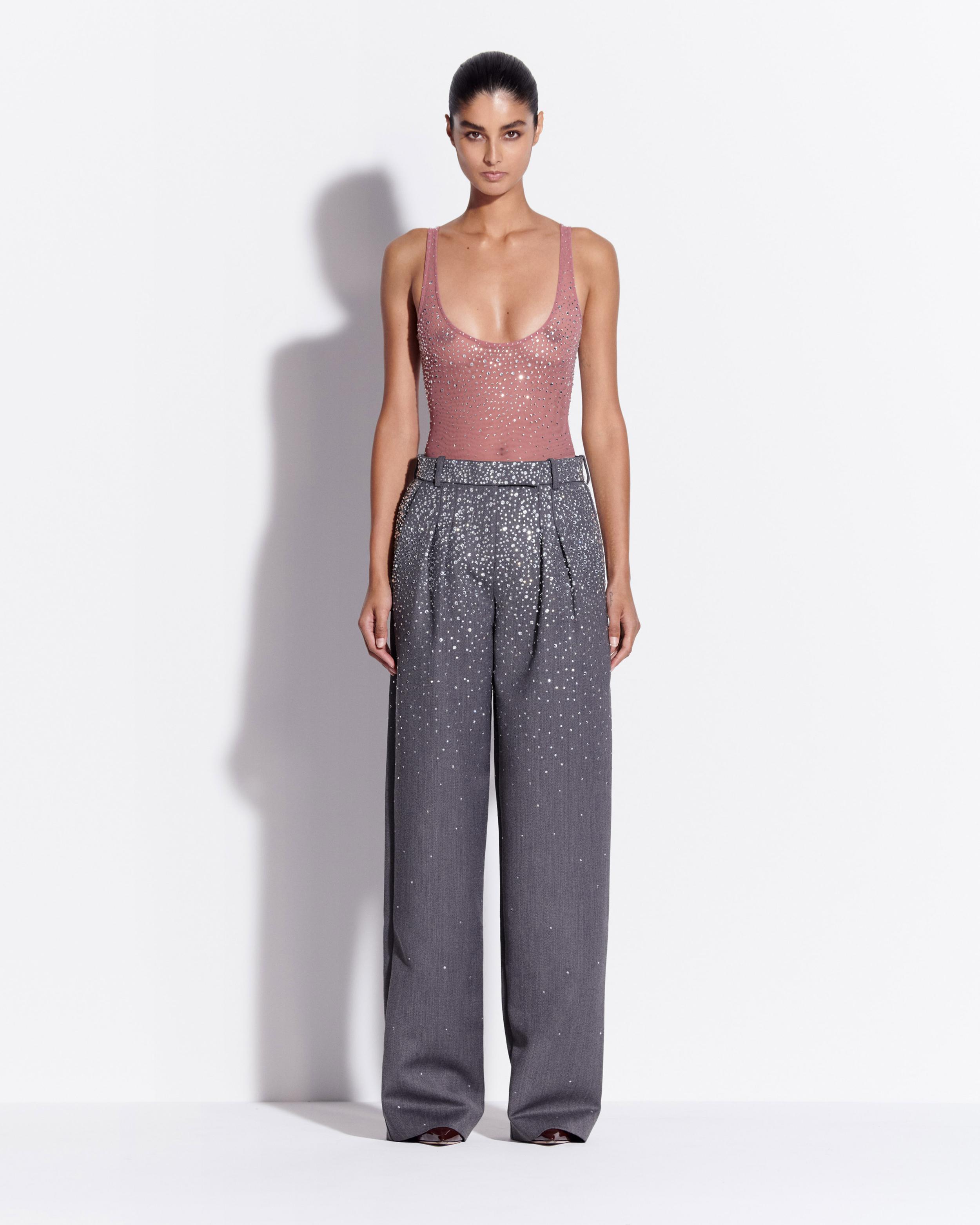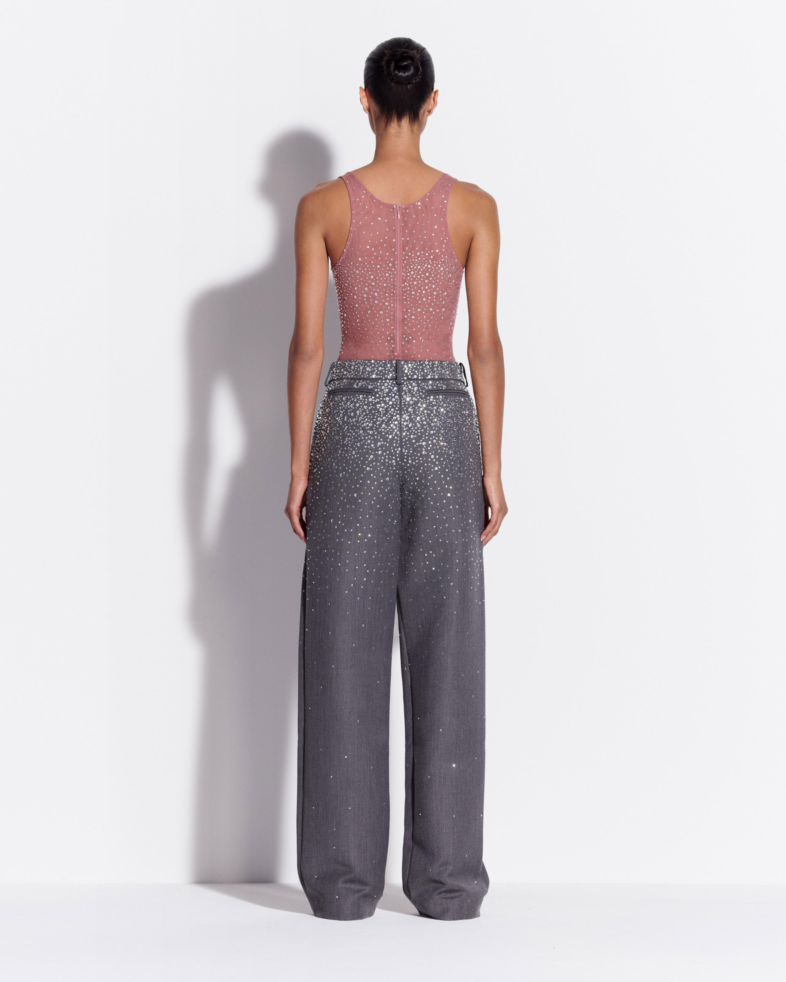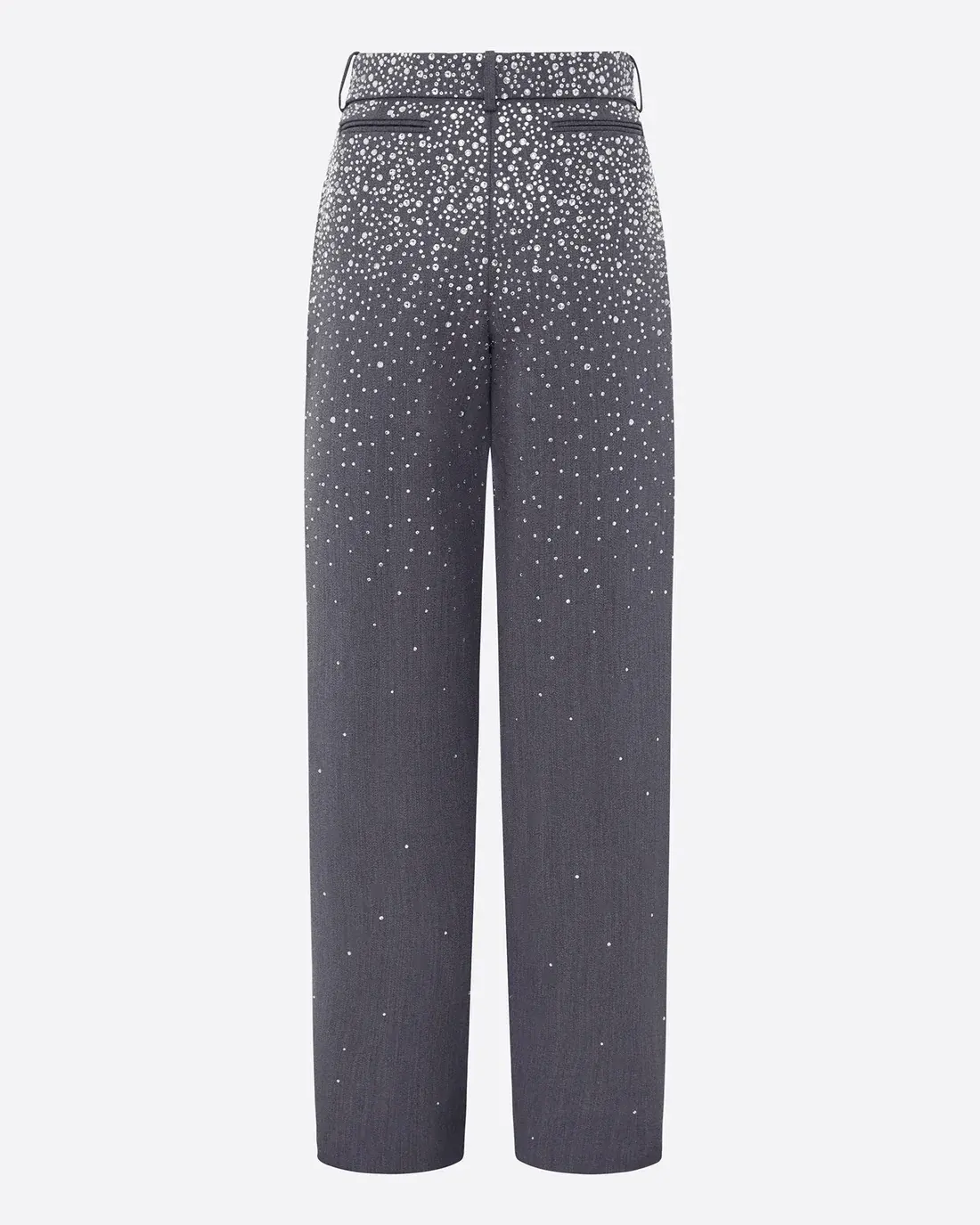 Wide leg, tailored trouser with gradated crystals from the waist down.
