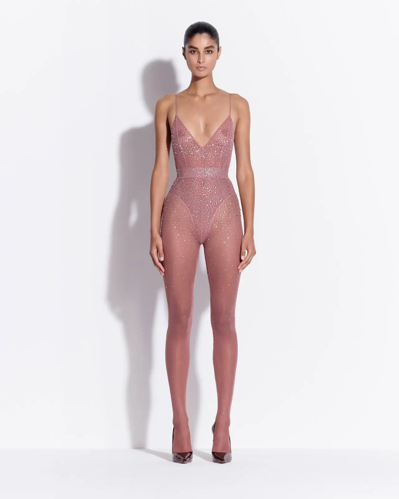 • Crystal embellishments • Transparent, unlined • Concealed zip closure • Model wears UK 4, height 180cm • 88% Polyamide / 12% Elastane • Dry clean only