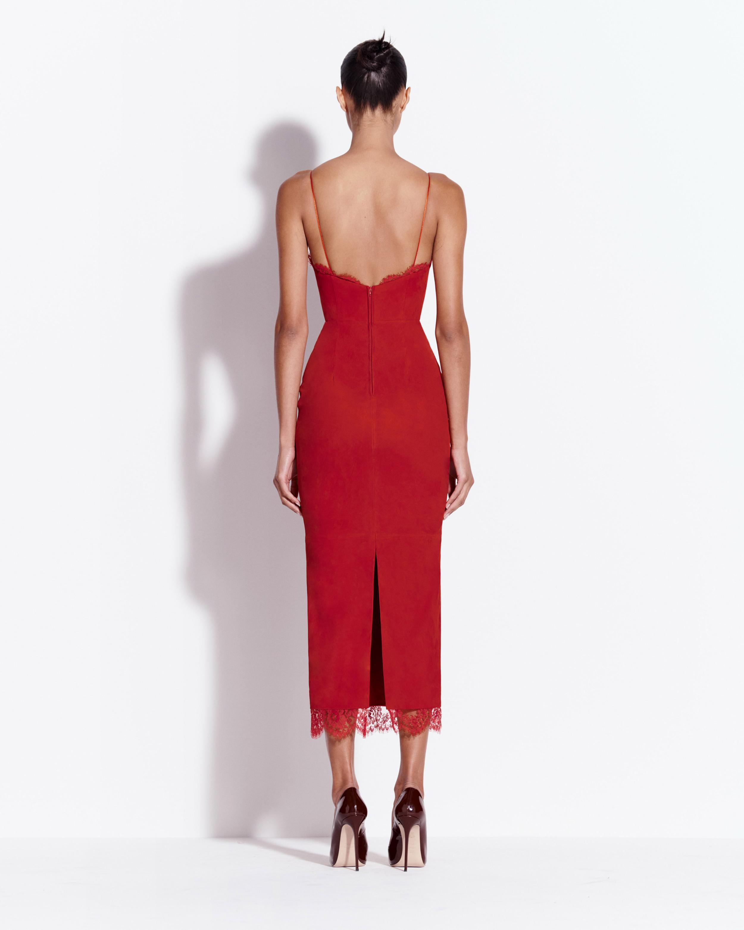 • French lace trim • V neckline • Thin rouleau straps • Concealed zip closure • Model wears UK 4, height 180cm • Metis Suede - 100% Goat Leather • Specialist leather cleaning only