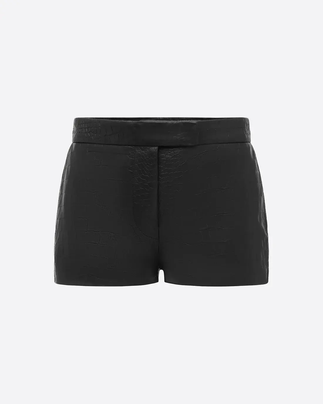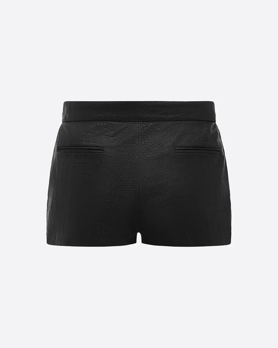 • Crocodile print embossing • Micro mini length • Side pockets, back welt pockets • Fly front zip closure • 100% Nappa Lamb Leather