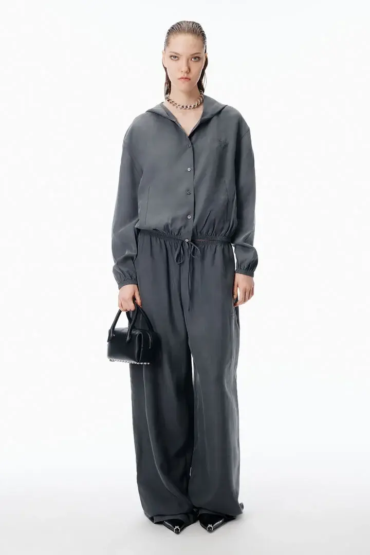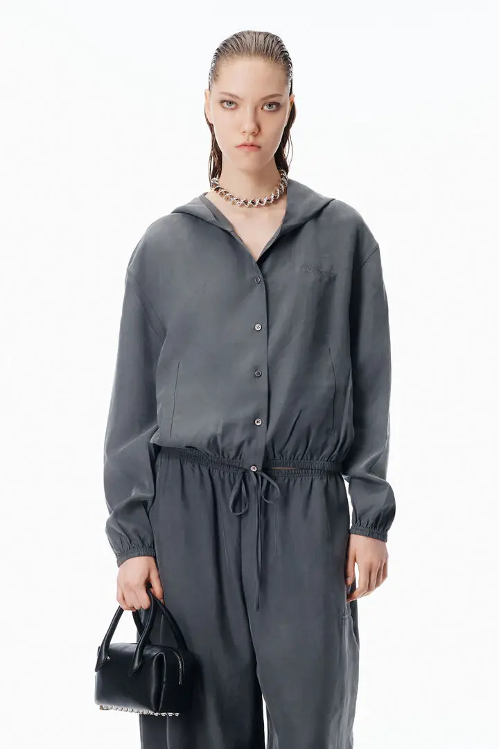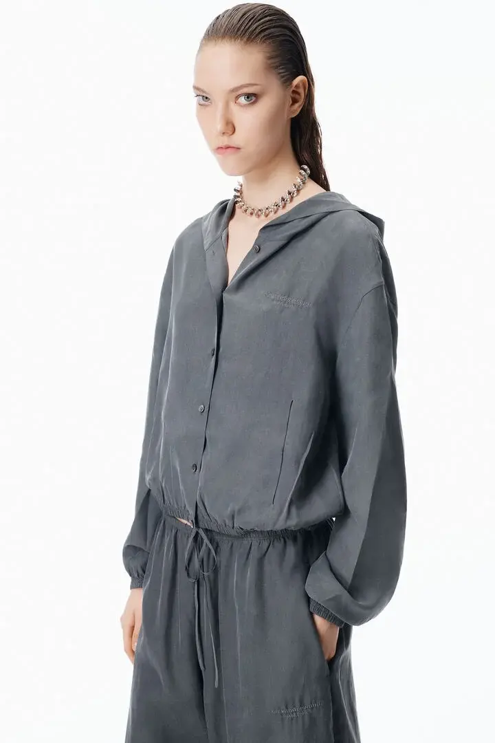 Thunder grey Drawcord hood Front button placket Slash pockets Elasticated hem Body composition: 100% silk Model is 5'11" and Wears a Size S Made in China