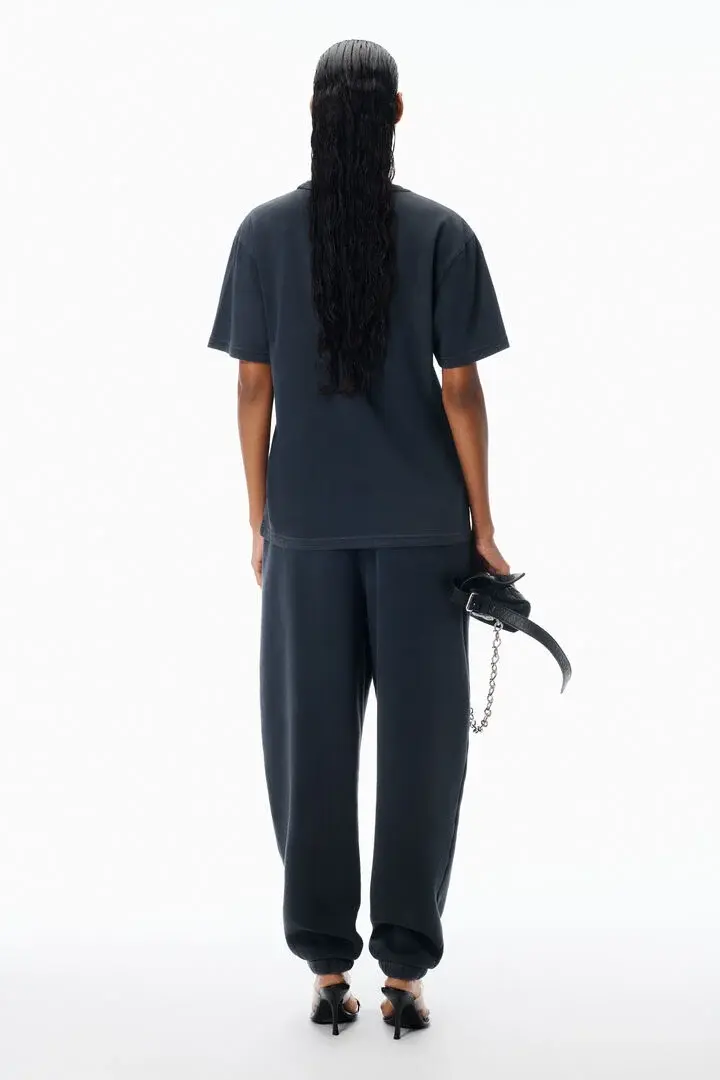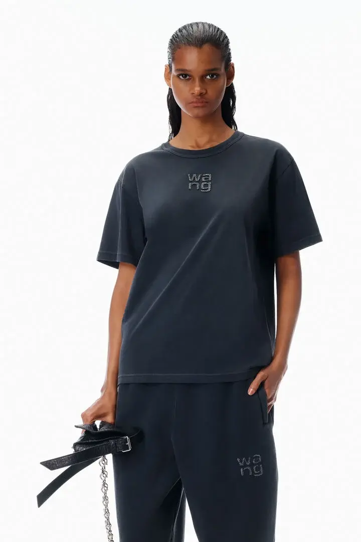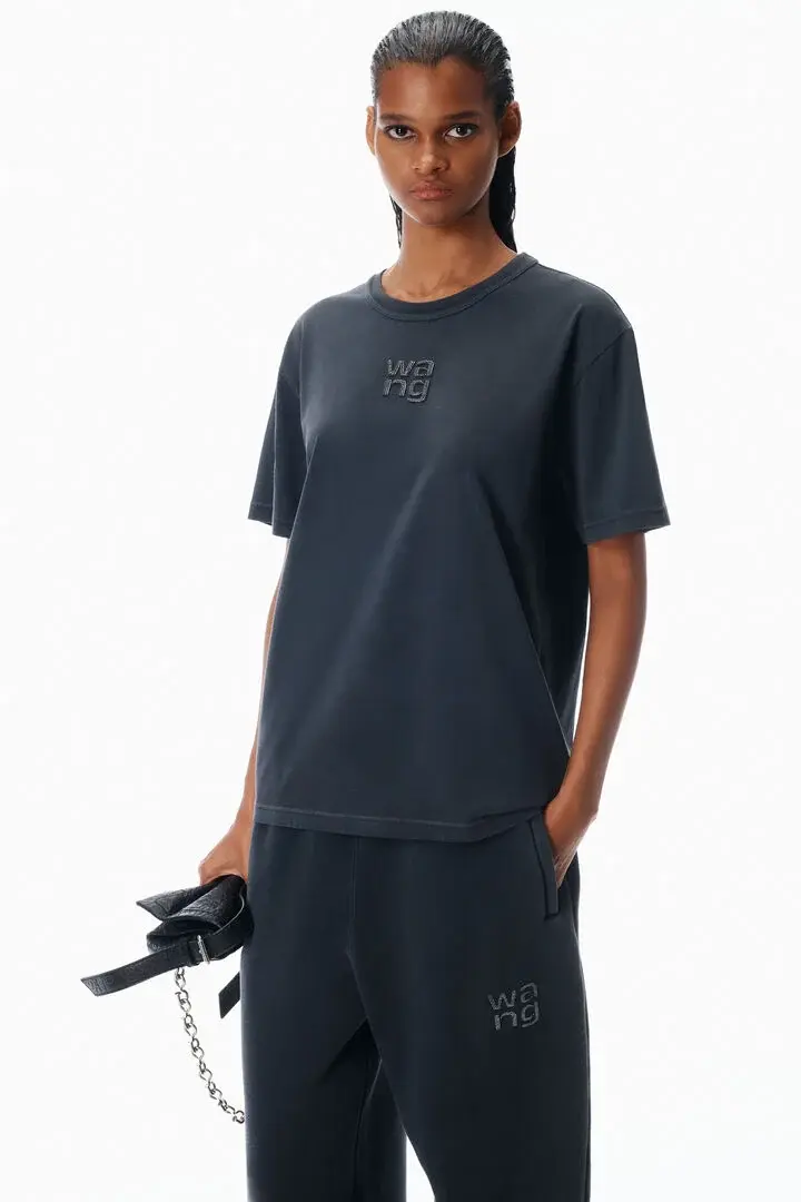 Relaxed short sleeve tee in washed organic cotton jersey. Designed with a ribbed crewneck and a medium-stacked embossed ‘WANG’ logo at the chest, finished with tonal crystal hotfix detailing.