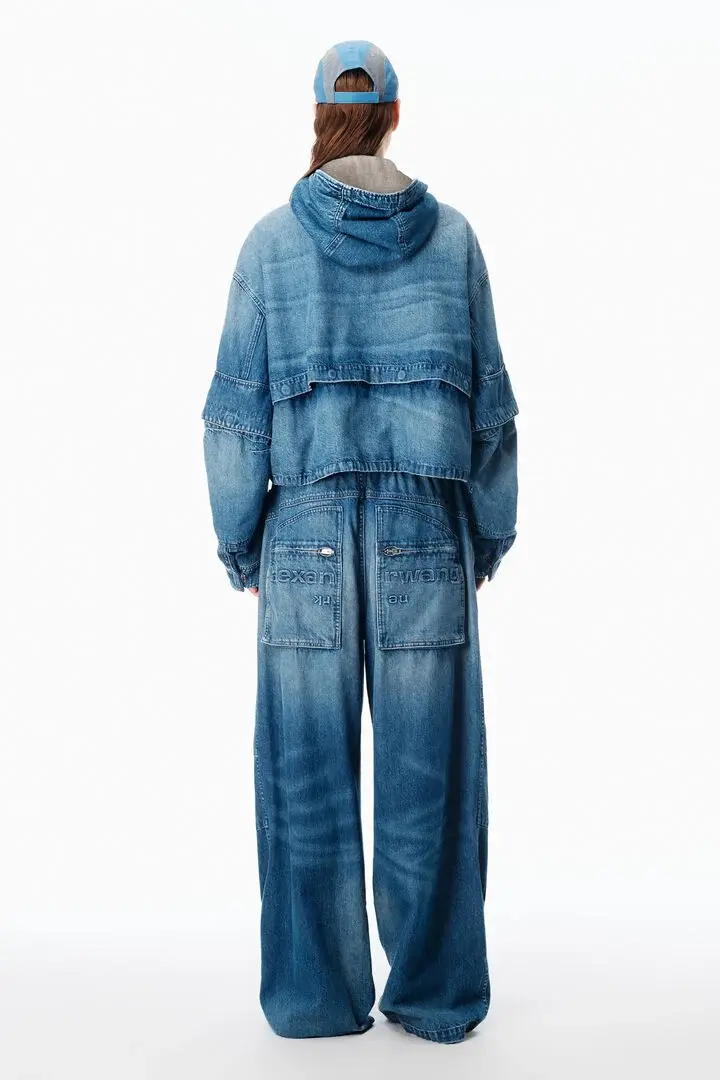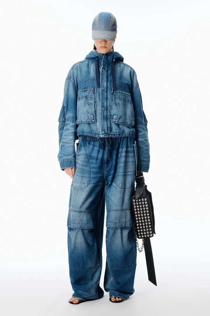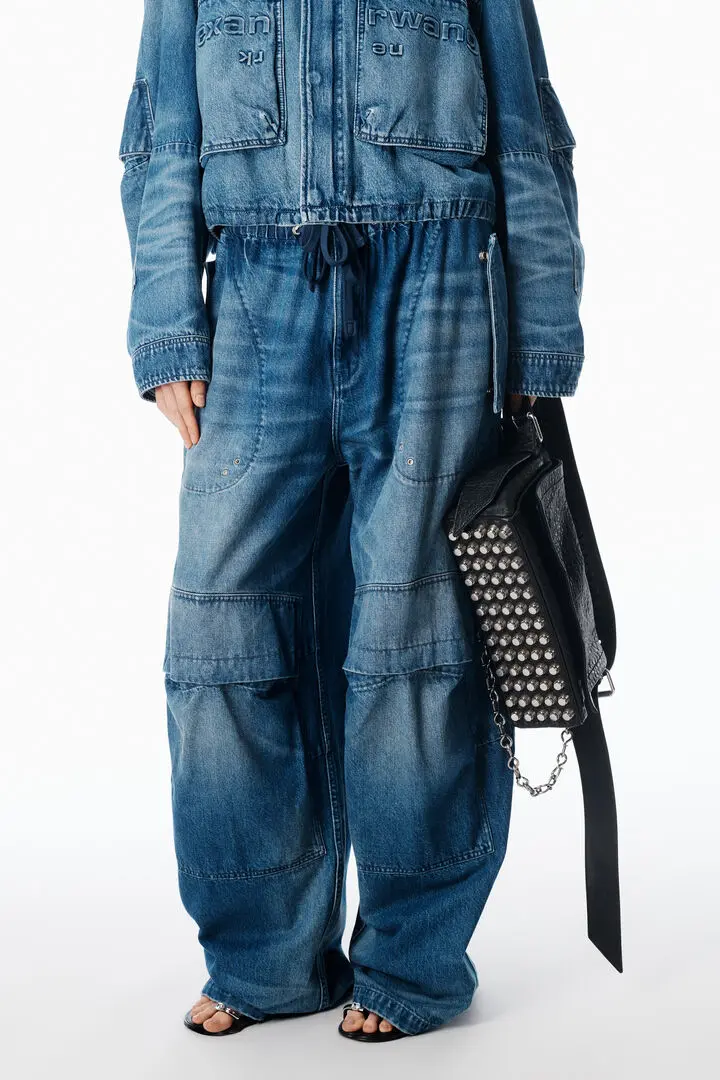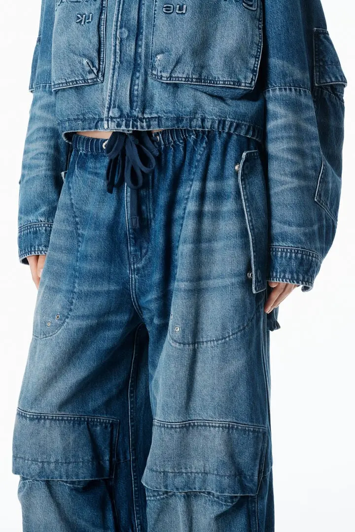 Tinted medium indigo denim reworked into an oversized cargo silhouette. Detailed with adjustable waist tabs, drawcord hems, and articulated snap pockets for a utilitarian finish.
