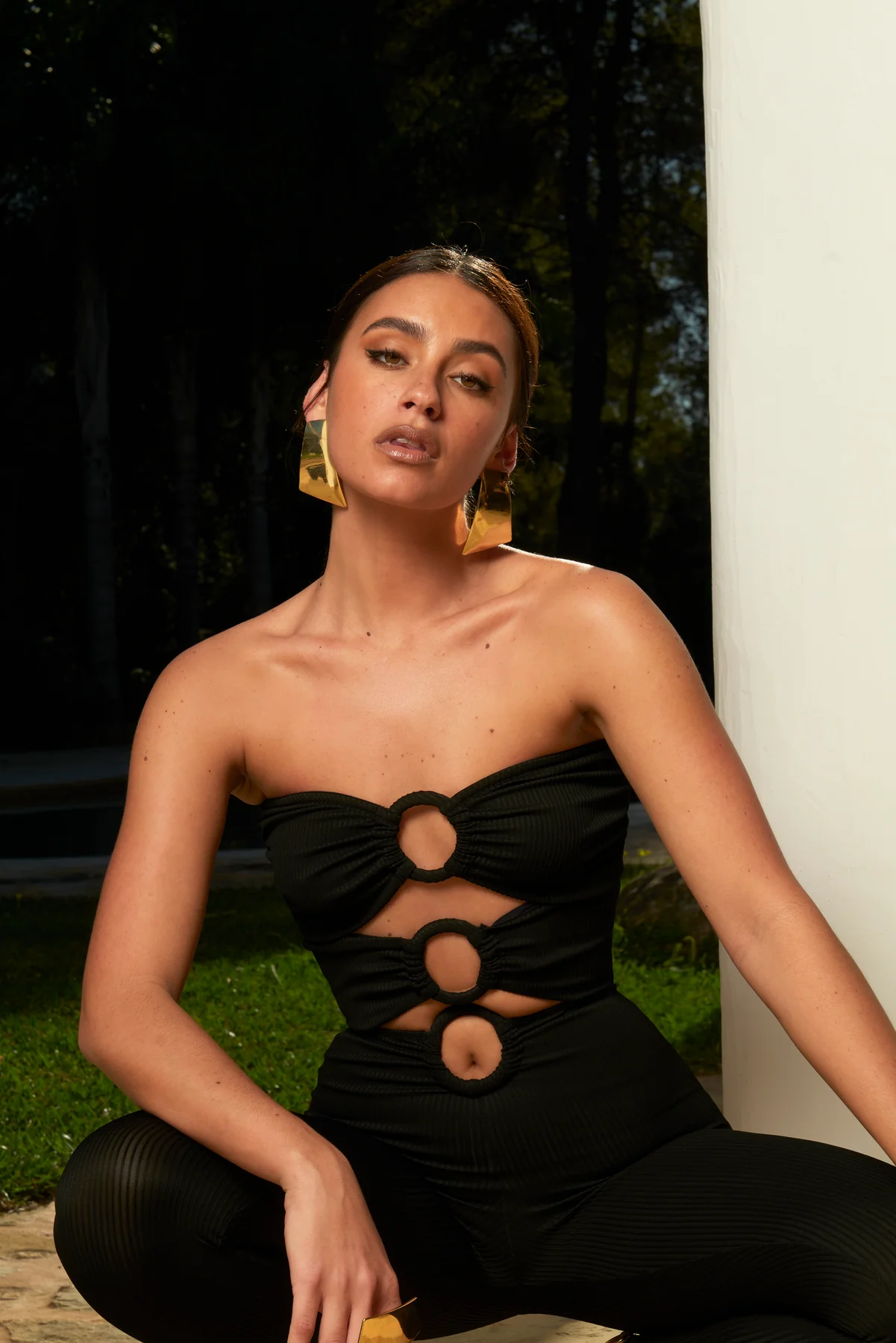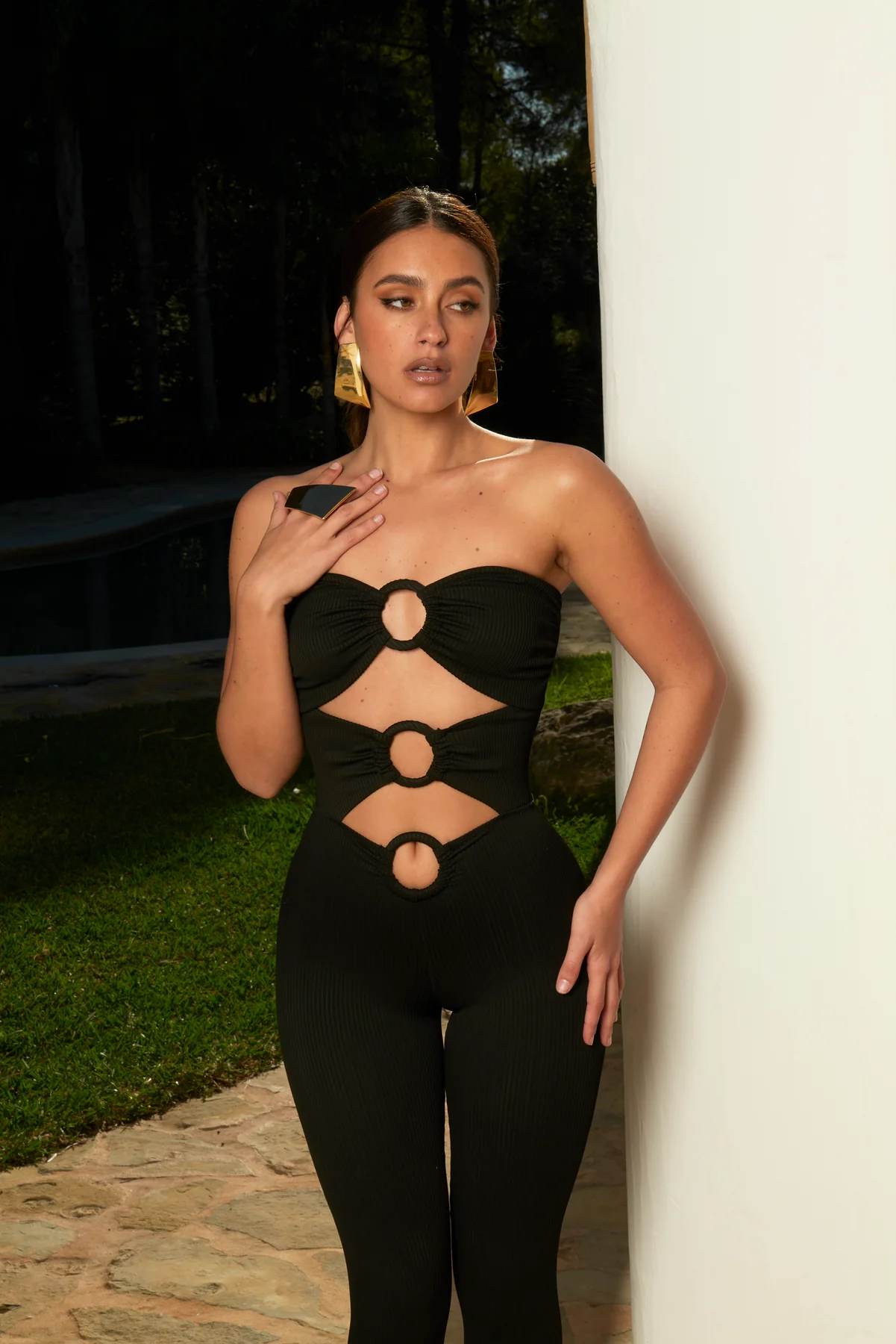 The Anya jumpsuit. An effortlessly sexy and sophisticated piece featuring an alluring 3 ring detail at the front. An ode to the Anya swimsuit, this jumpsuit is perfect for evenings.