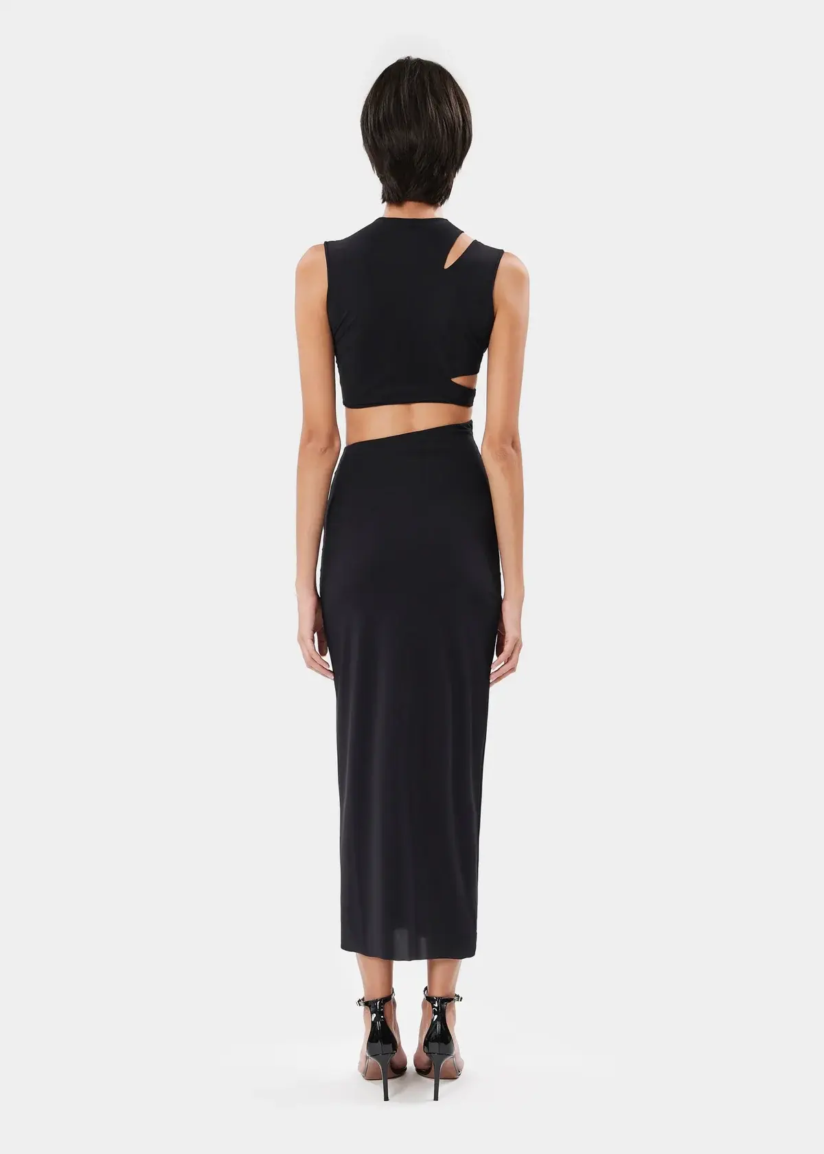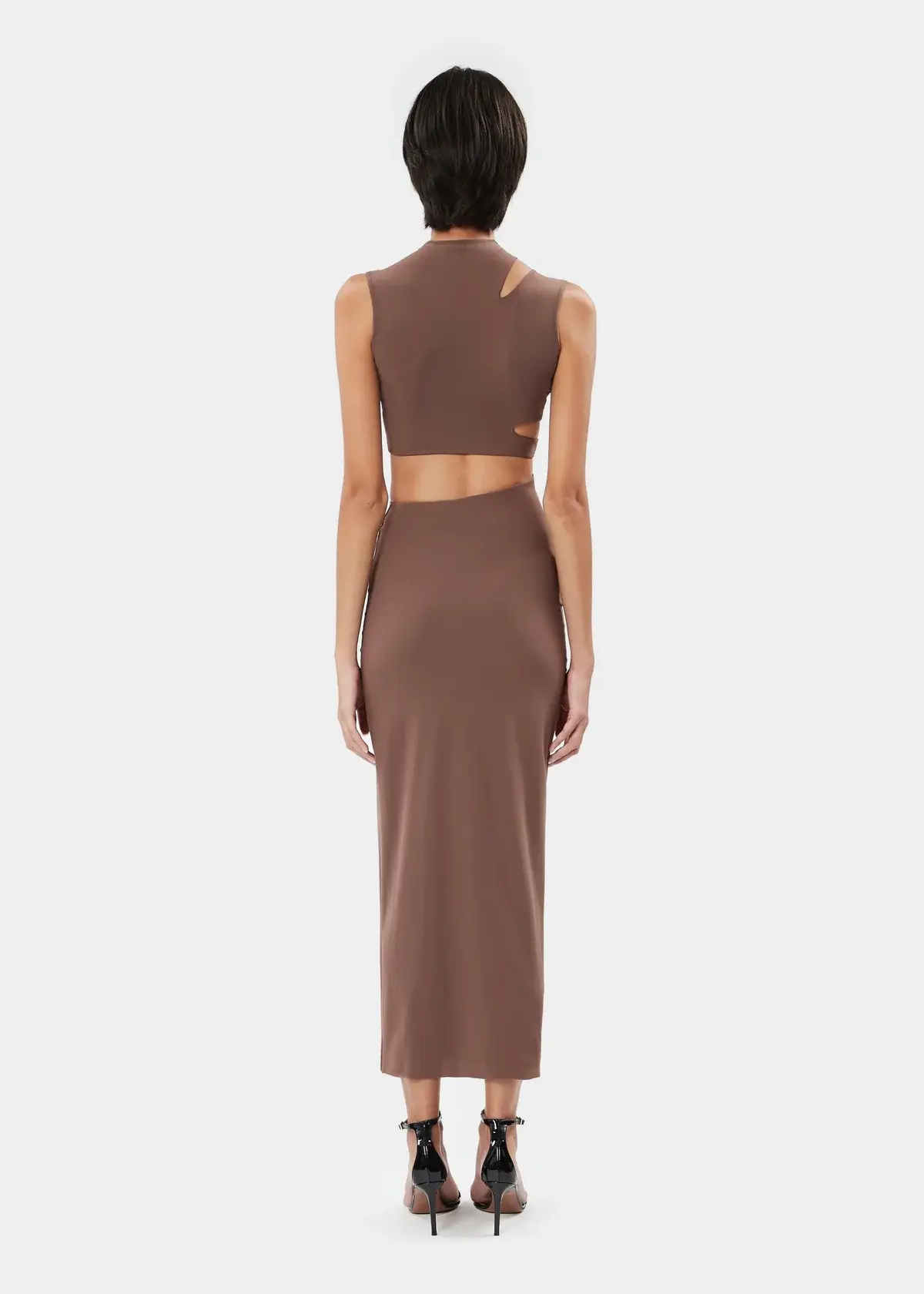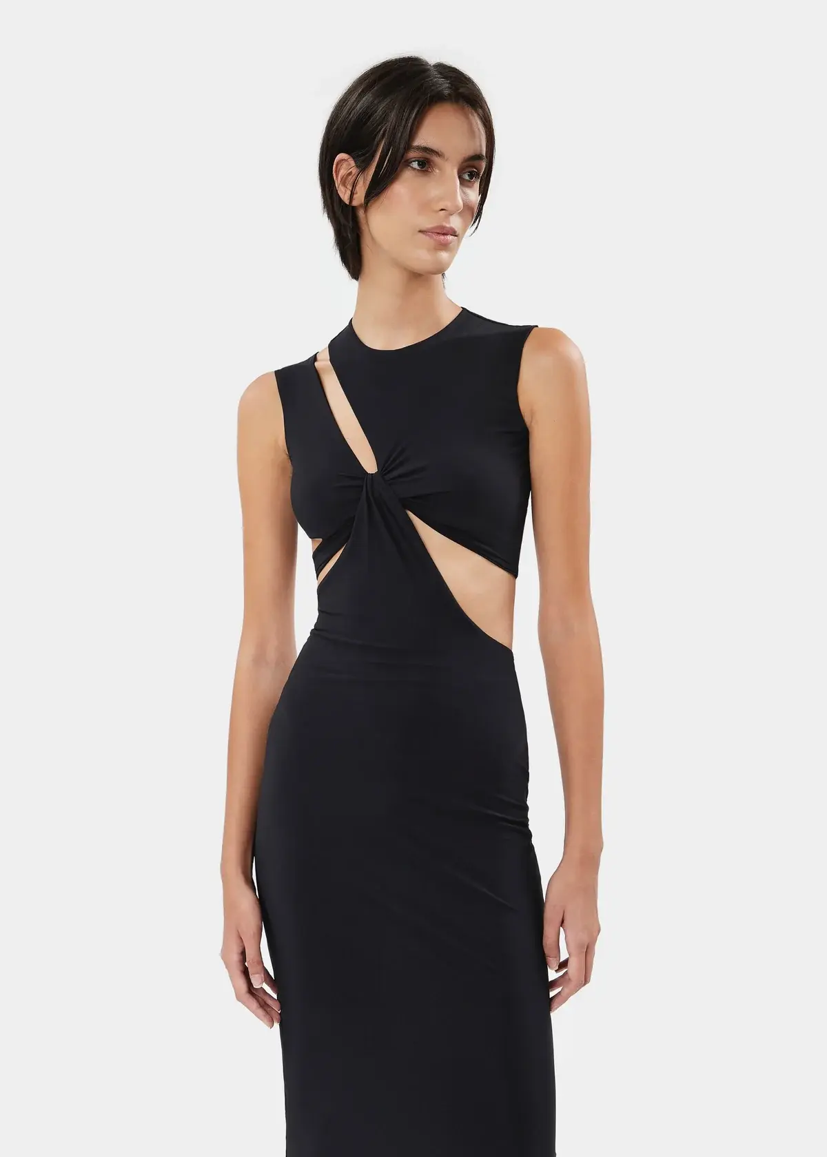 The KYLEE dress is a sleeveless midi style in stretch jersey, featuring asymmetrical knotted cut-outs that add a bold and dynamic twist to the design.