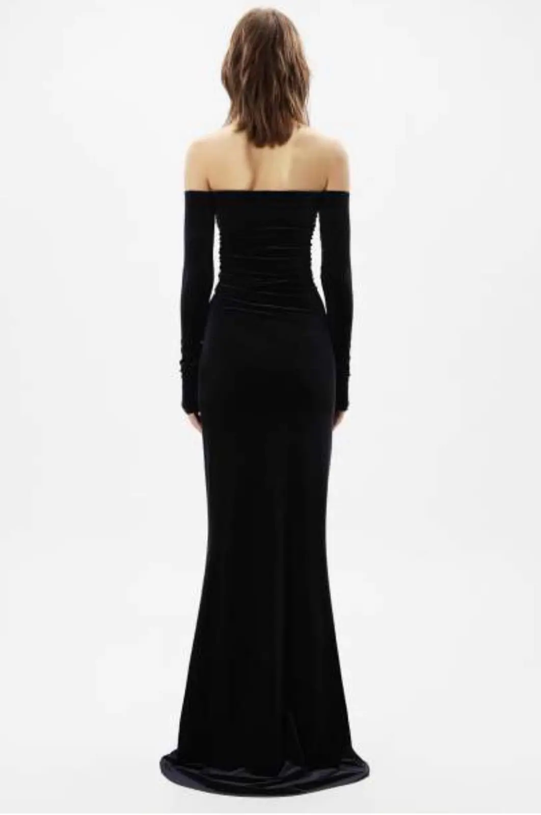 Off-shoulder draped maxi dress in stretch velvet jersey featuring preformed cups, a sweetheart neckline, asymmetrical ruching and separate raw-cut sleeves.