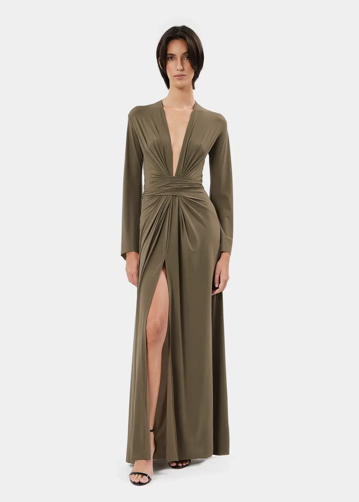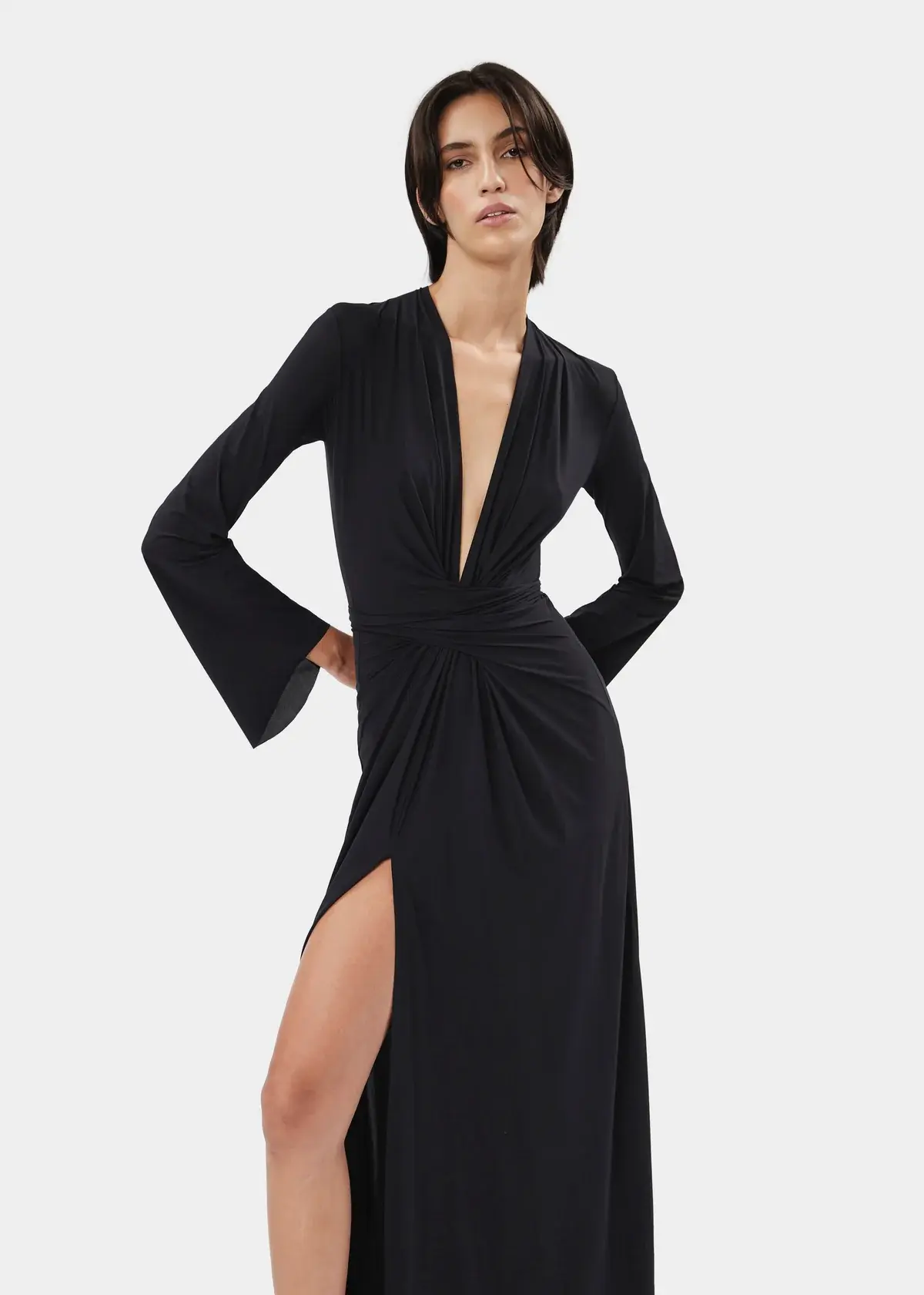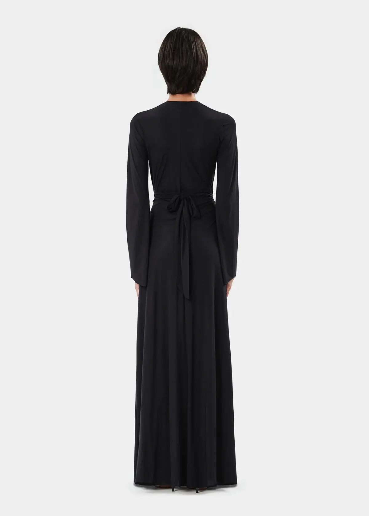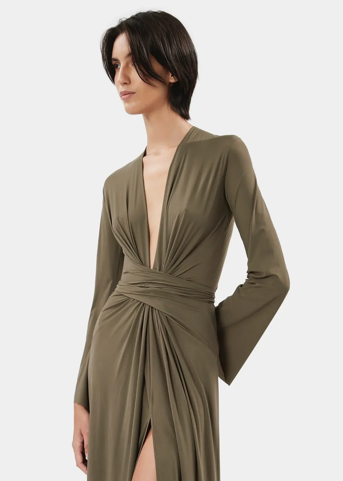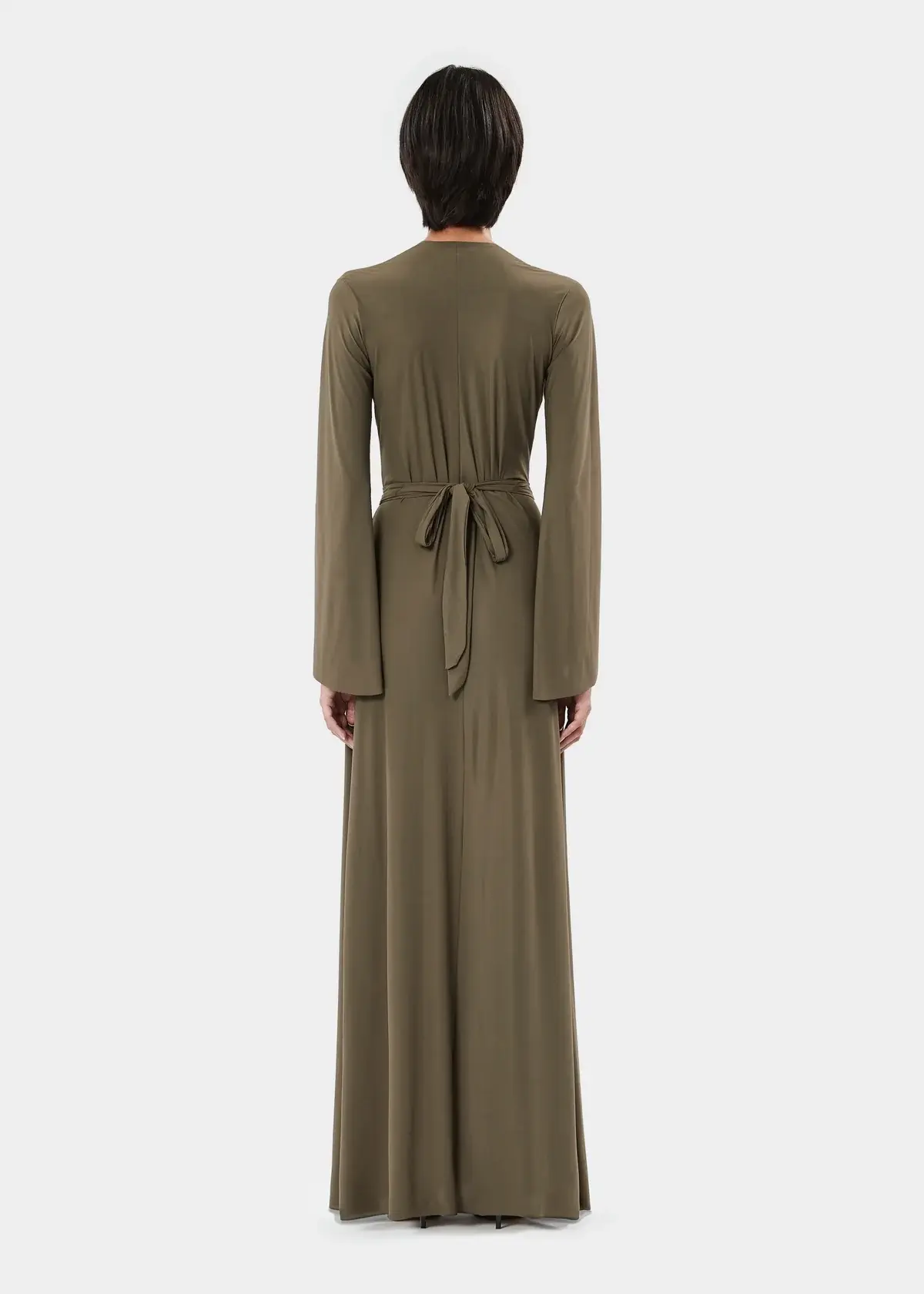 The MARGOT maxi dress features a wrap-effect design in lightweight stretch jersey, with a flared skirt and deep slit. The adjustable waistband allows for a customized fit, while the skirt and flared sleeves are finished with a raw-cut hem for a modern, relaxed look.