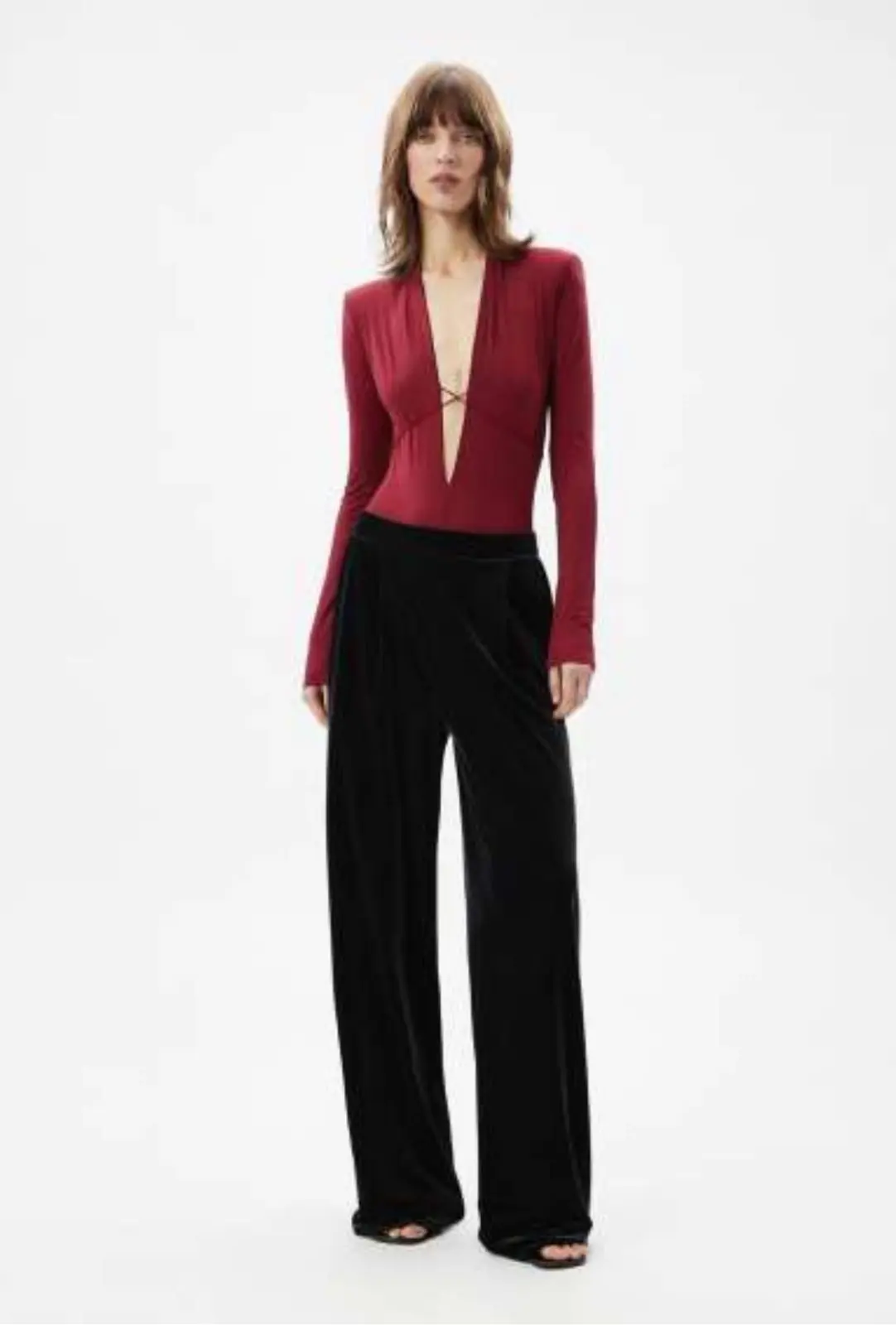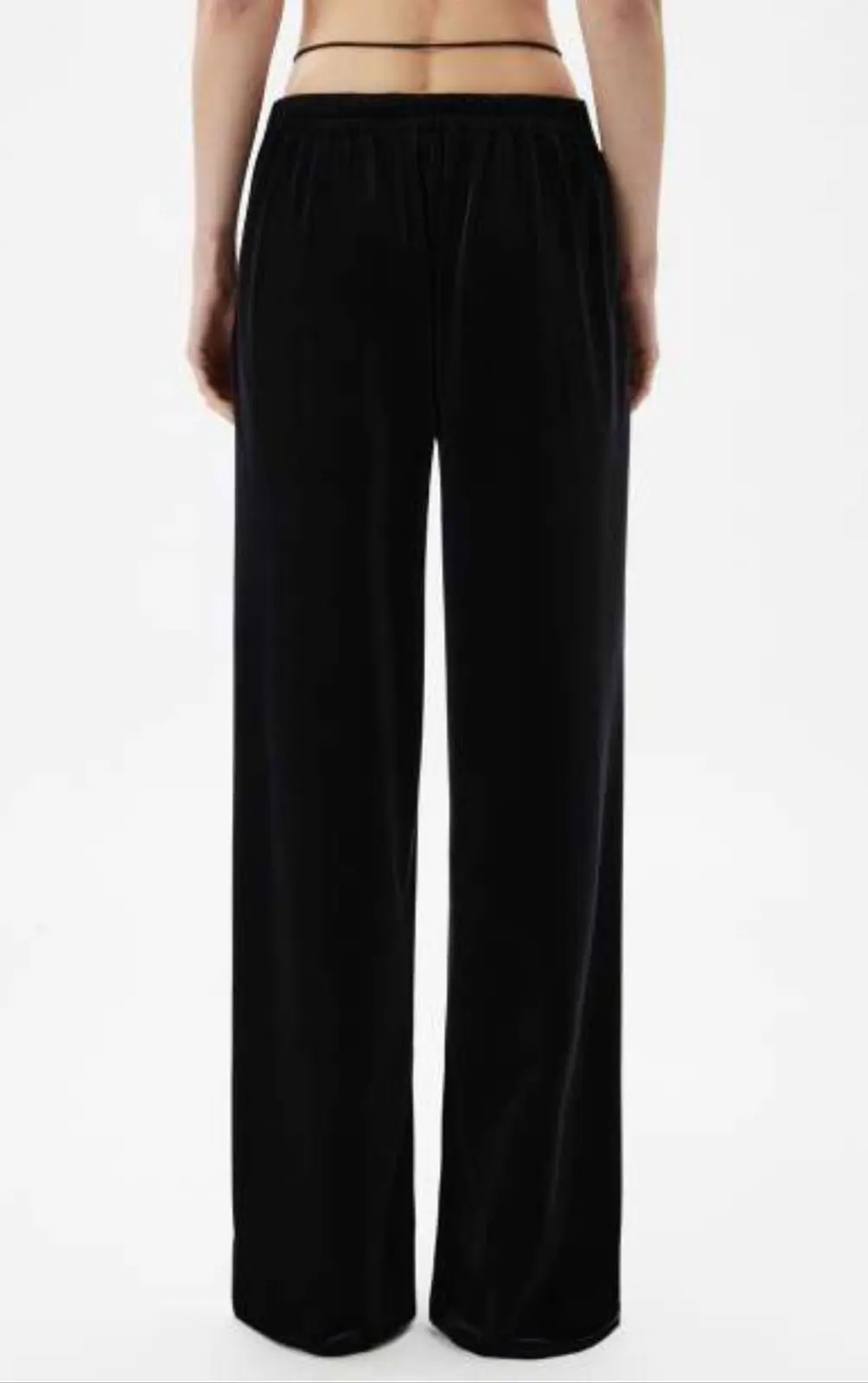 Wide-leg pants in stretch velvet jersey with pleats, slanted hip pockets and raw-cut hem. Decorative lace at the waist. GAL VELVET. Wide-leg pants in stretch velvet jersey with pleats, slanted hip pockets and raw-cut hem. Decorative lace at the waist.