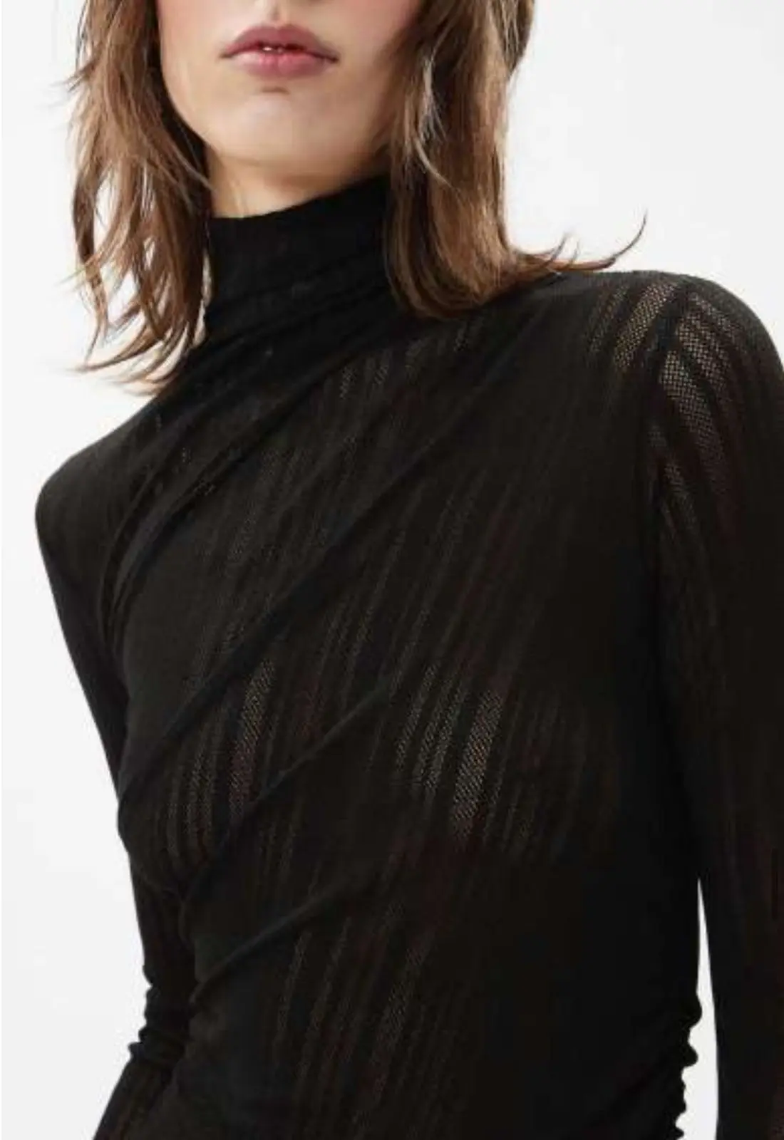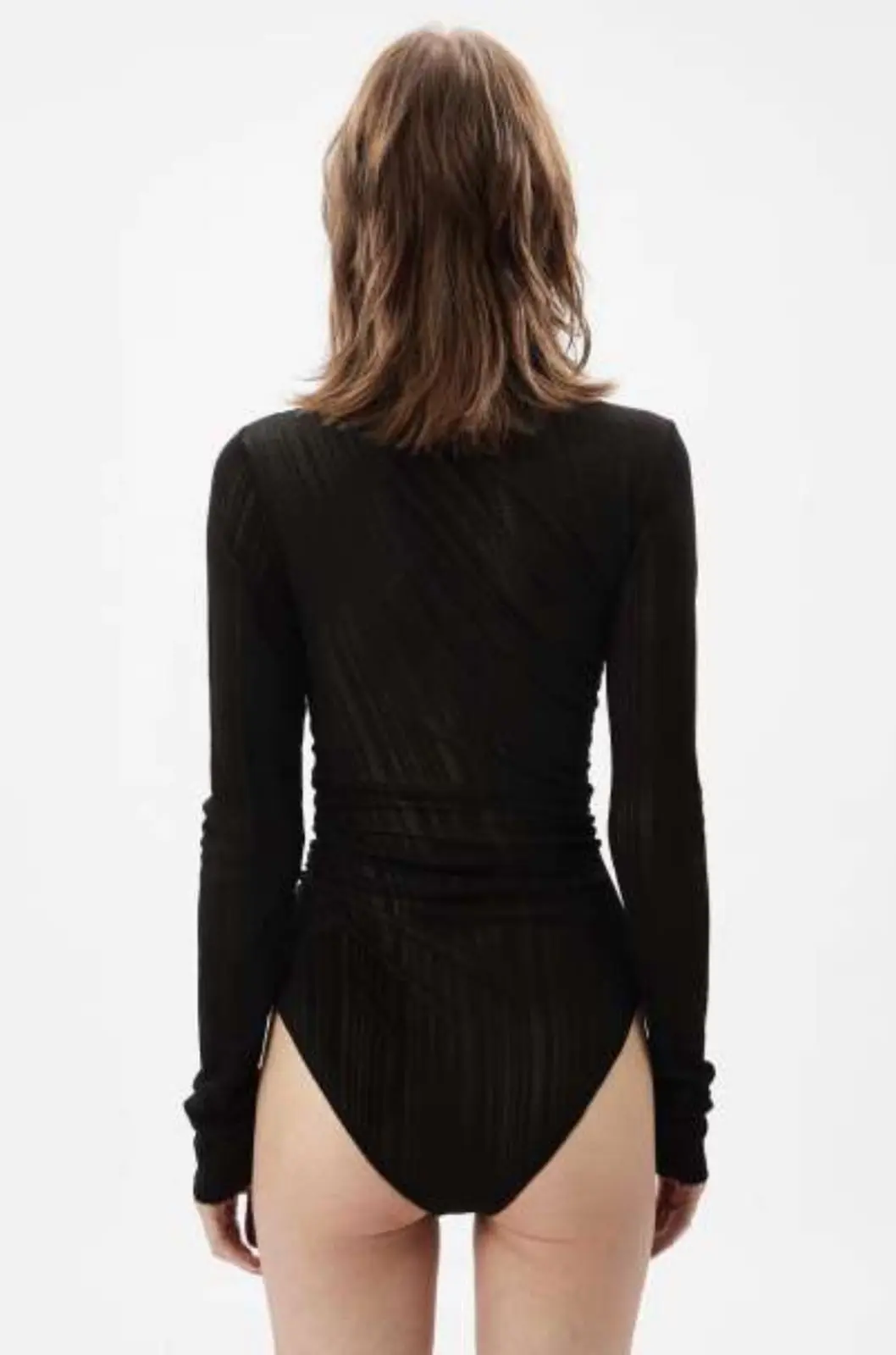 High-neck draped bodysuit in stretch raschel jersey featuring an irregular ribbed see-through effect, asymmetric ruching on the shoulder and side and long sleeves. Medium-coverage briefs, and press-button Closure Jersey - 58% PA 40% VI 2% EA