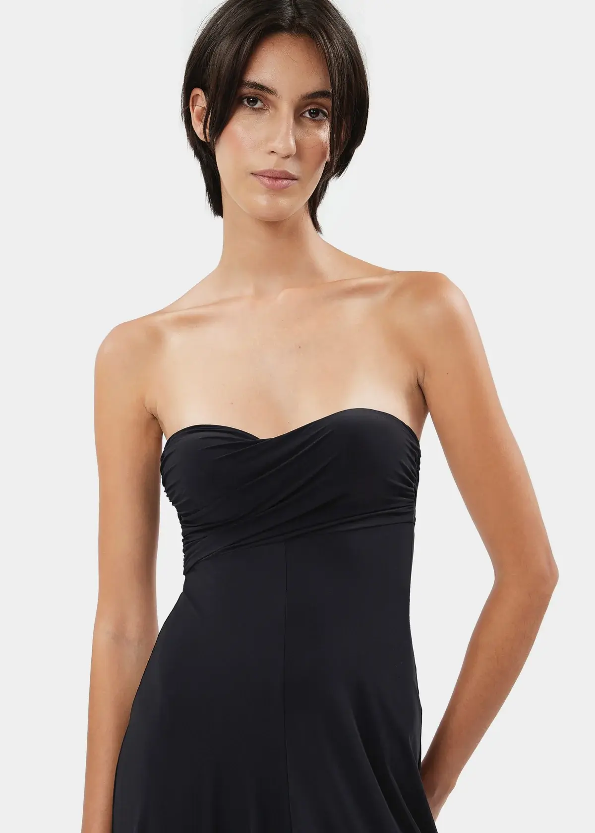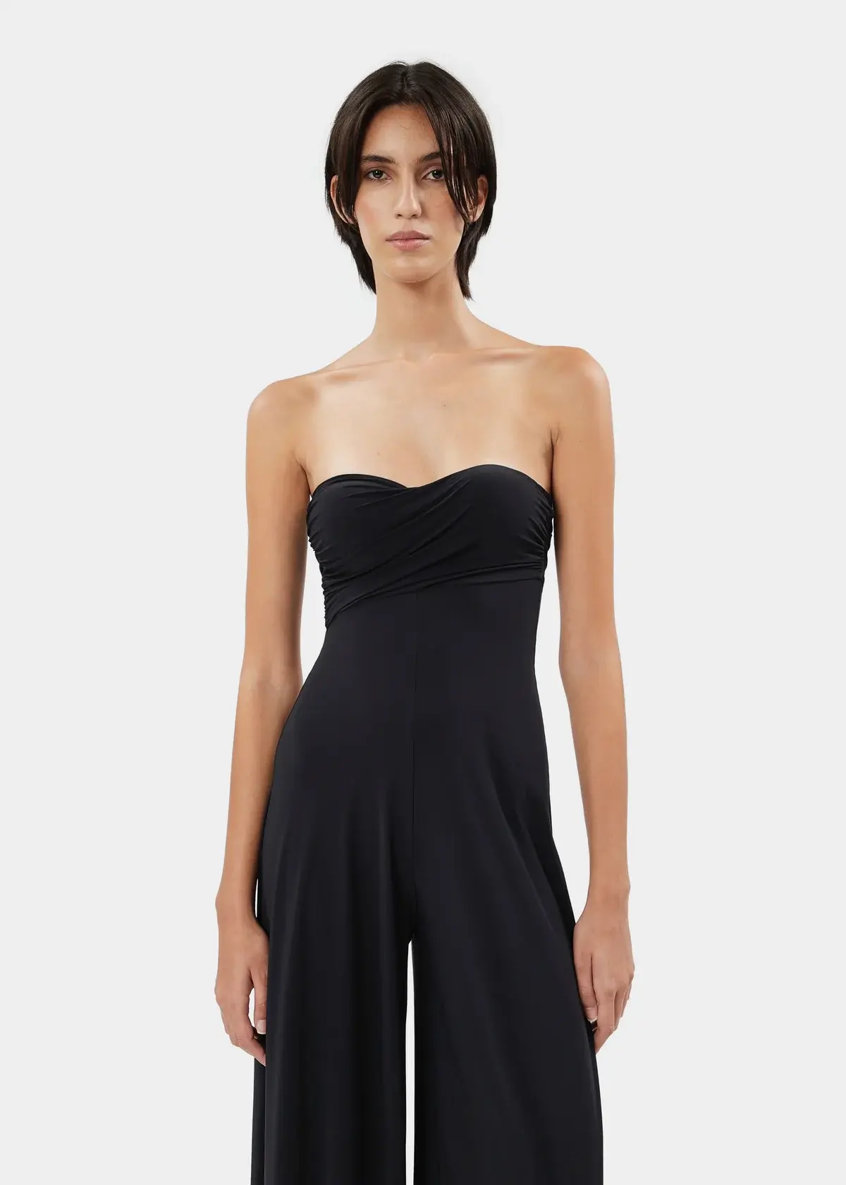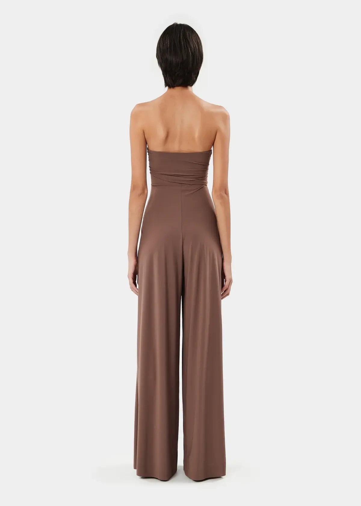 The BIANCA jumpsuit is a strapless wide-leg style in stretch jersey features a sculpted sweetheart neckline and a draped bodice with preformed cups for a flattering fit.