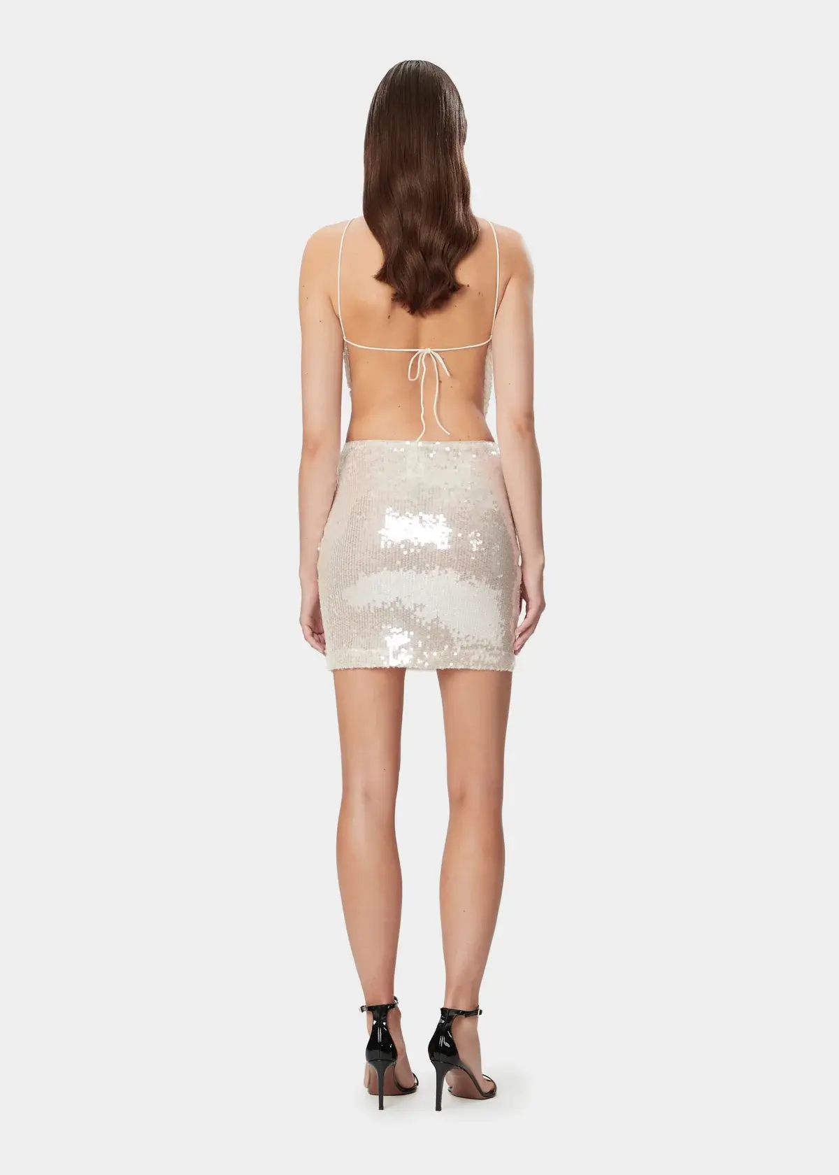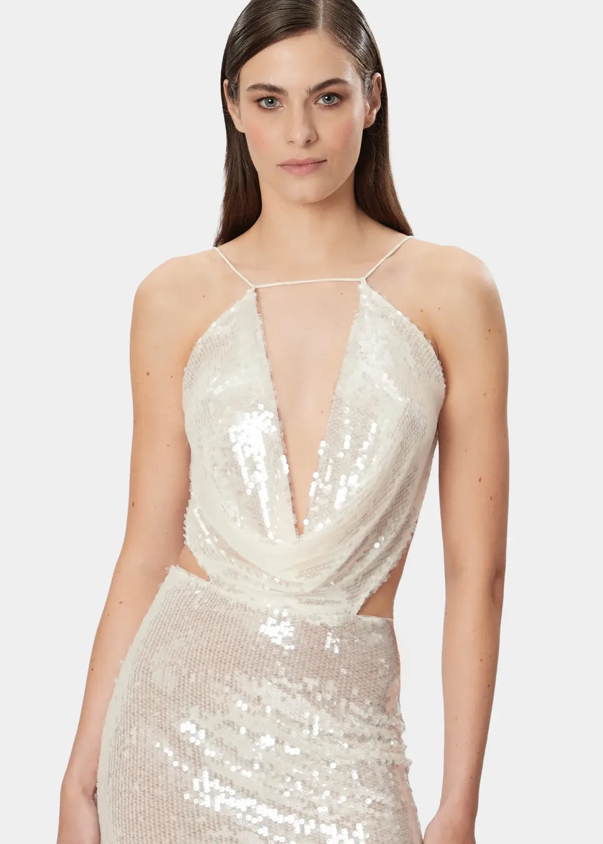 The ESTER SEQUINS is a mini dress crafted from sequined stretch tulle, featuring a draped cowl neckline, an open back, and bold waist cut-outs. A luminous design that blends sensuality and modern sophistication.