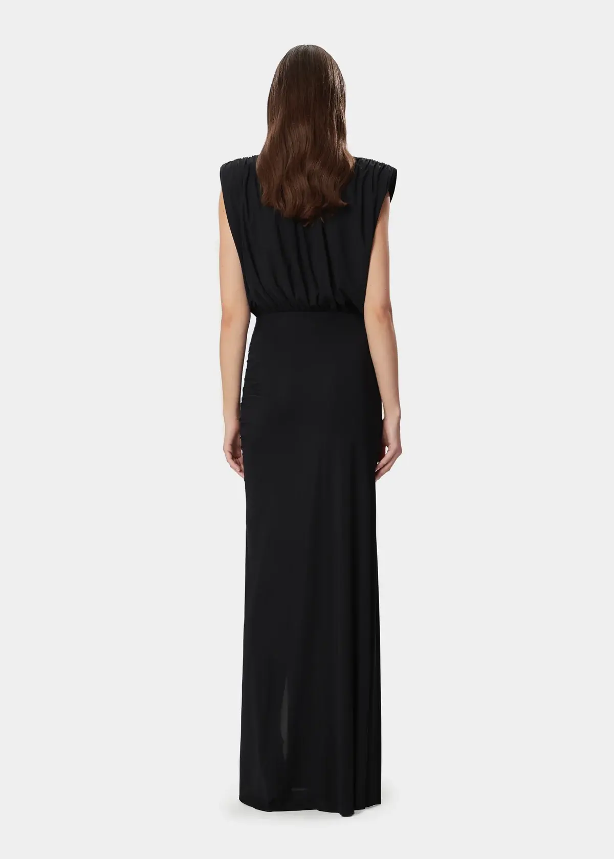 The MEGHAN is a sleeveless maxi dress crafted from lightweight stretch jersey, featuring a draped top with ruched shoulders and soft lined inner pads. The crossover bodice and gathered skirt with a high side slit create a fluid, feminine silhouette, finished with a raw-cut hem for an elegant, contemporary touch.