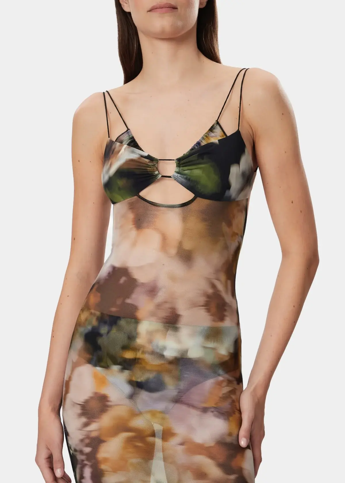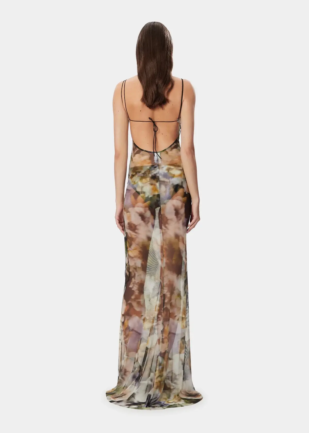 The GRETA SHEER is a slip maxi dress crafted from delicate stretch tulle, featuring a layered stretch jersey bra with refined cut-out details and adjustable shoulder straps. The flared hem flows into a soft back train, creating an ethereal, fluid silhouette. Comes with matching high-waist stretch jersey briefs for a coordinated, elegant look.
