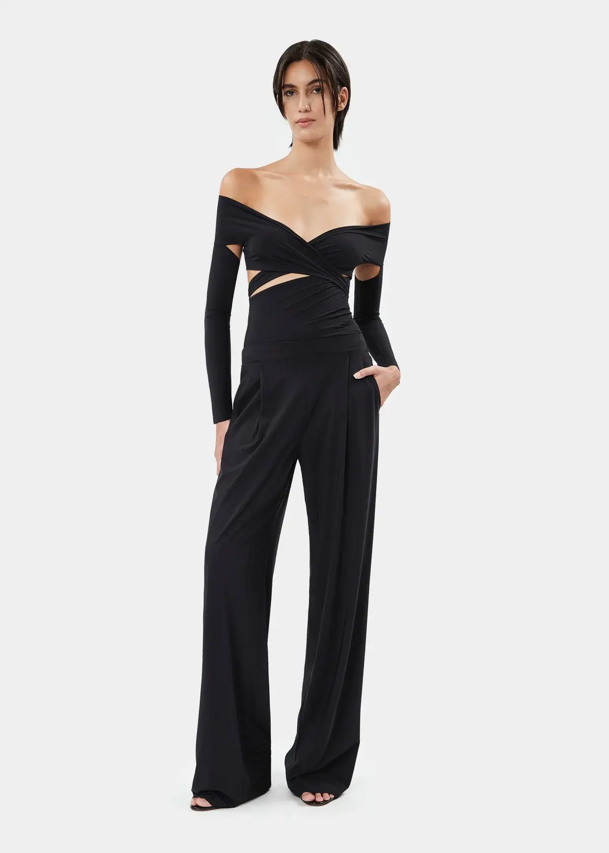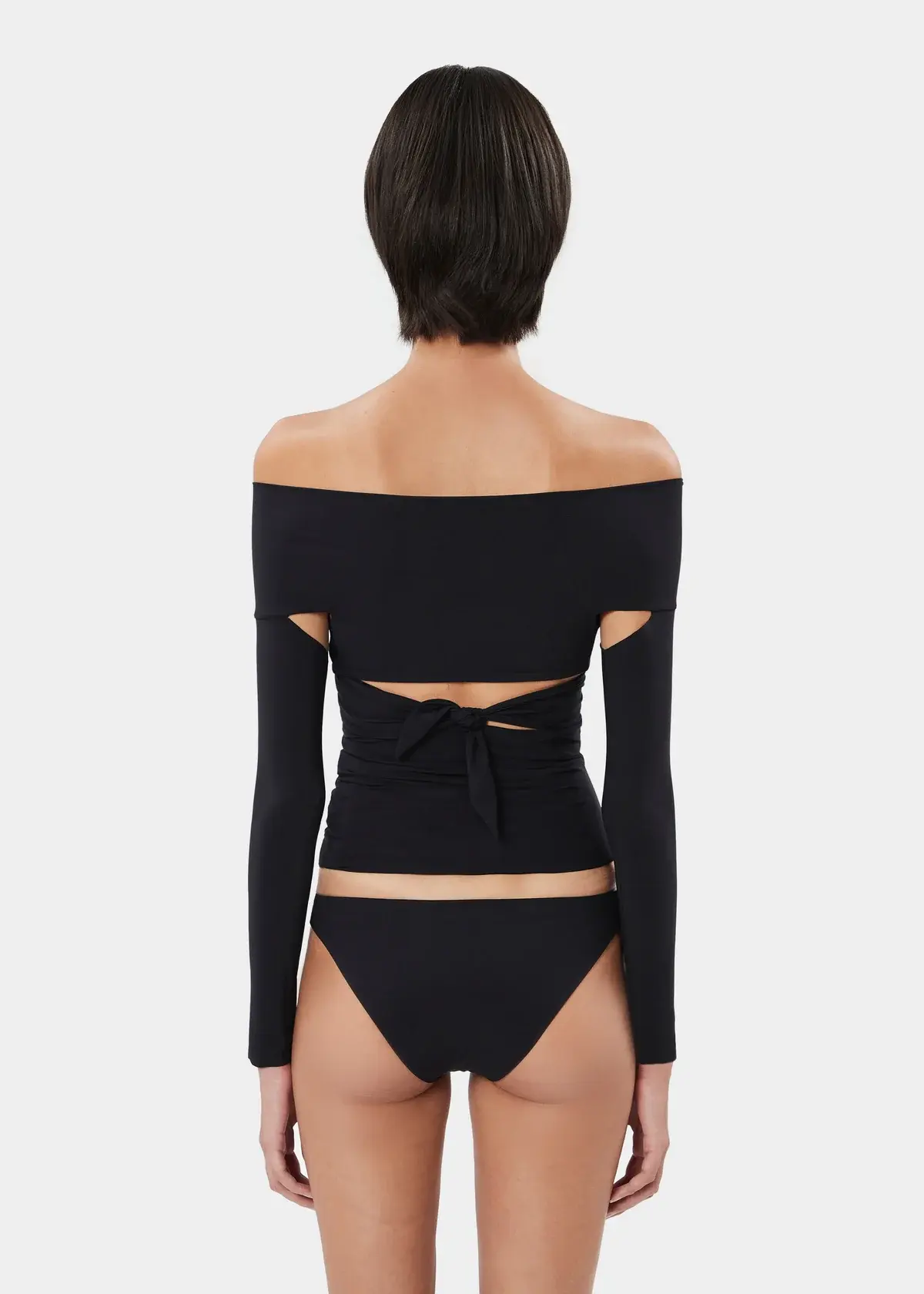 The JOSIE off-shoulder top in stretch jersey features long bands that can be wrapped and knotted for a customizable look. The waist band is detachable for added versatility. The bottom slip is not included.