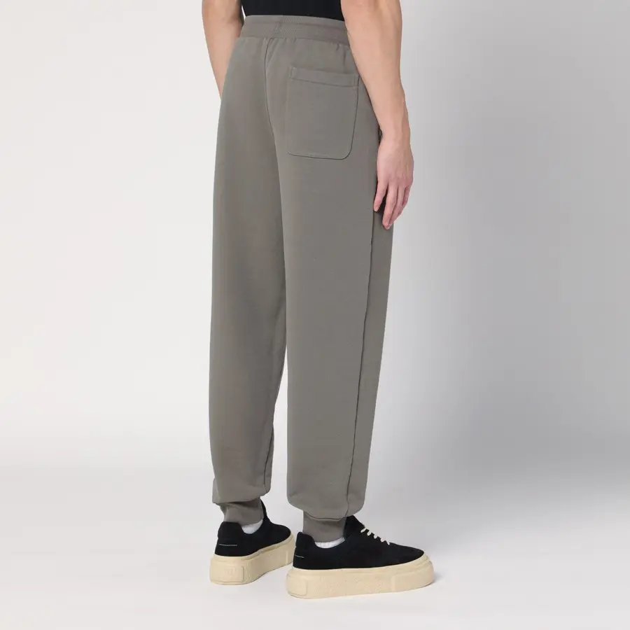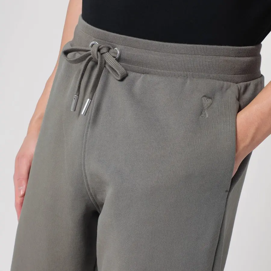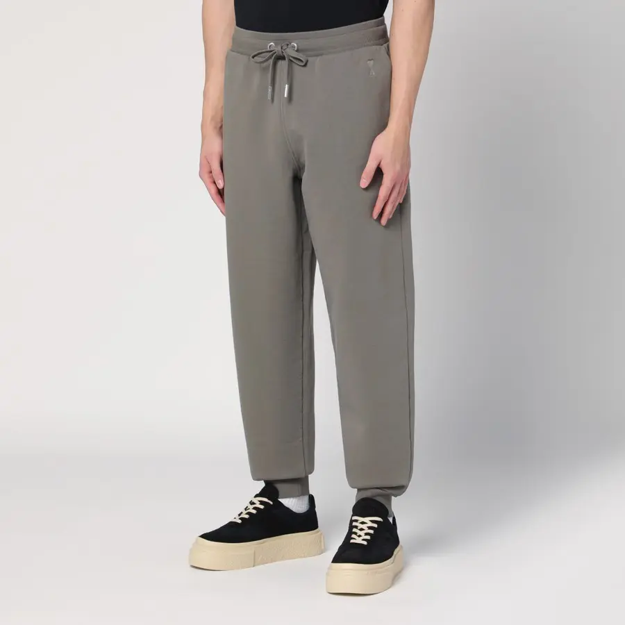 Ami Paris gray organic cotton jogging pants, characterized by a ribbed elasticized waistband with drawstring, side welt pockets, Ami De Coeur embroidery, and ribbed elasticized ankle cuffs.