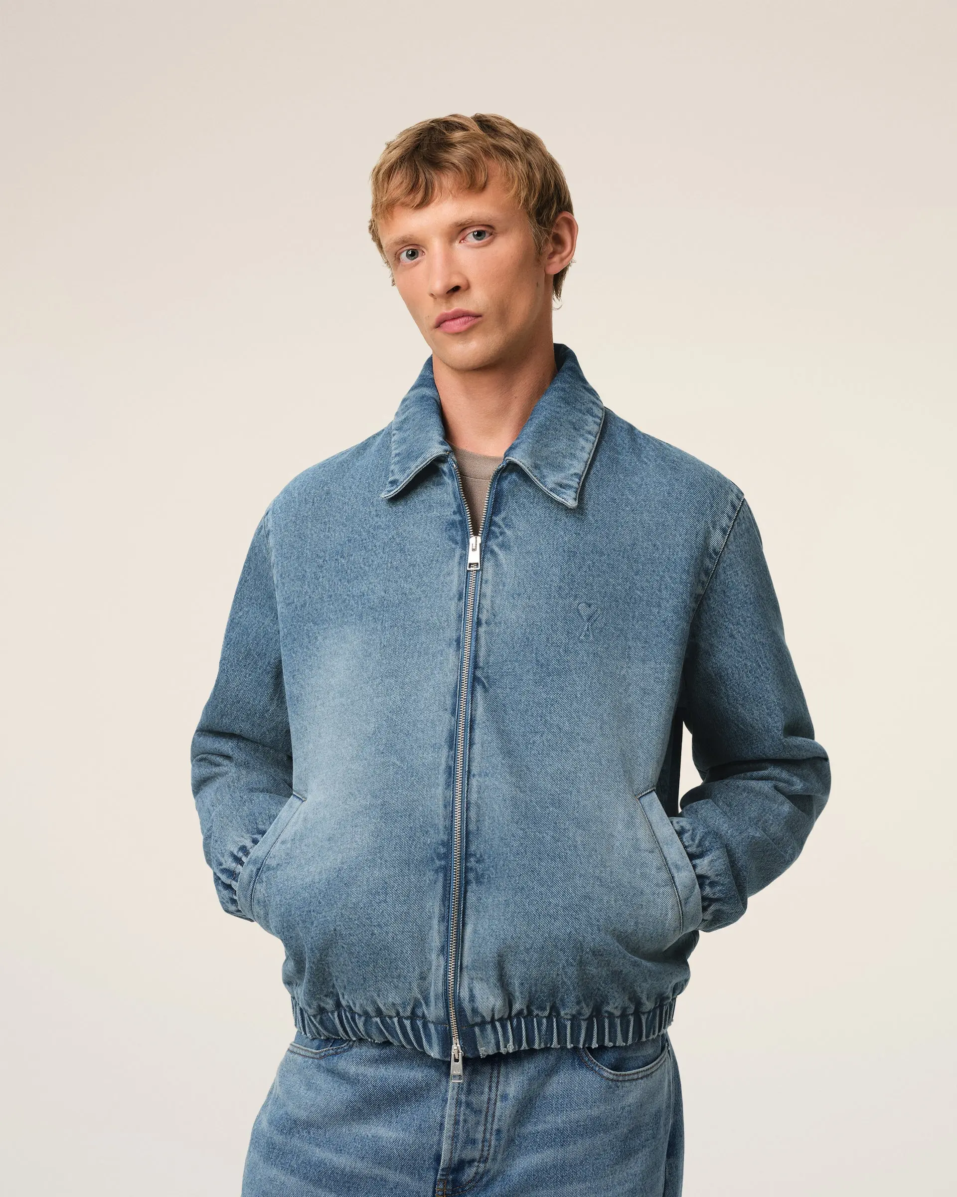Zipped jacket in used indigo denim.