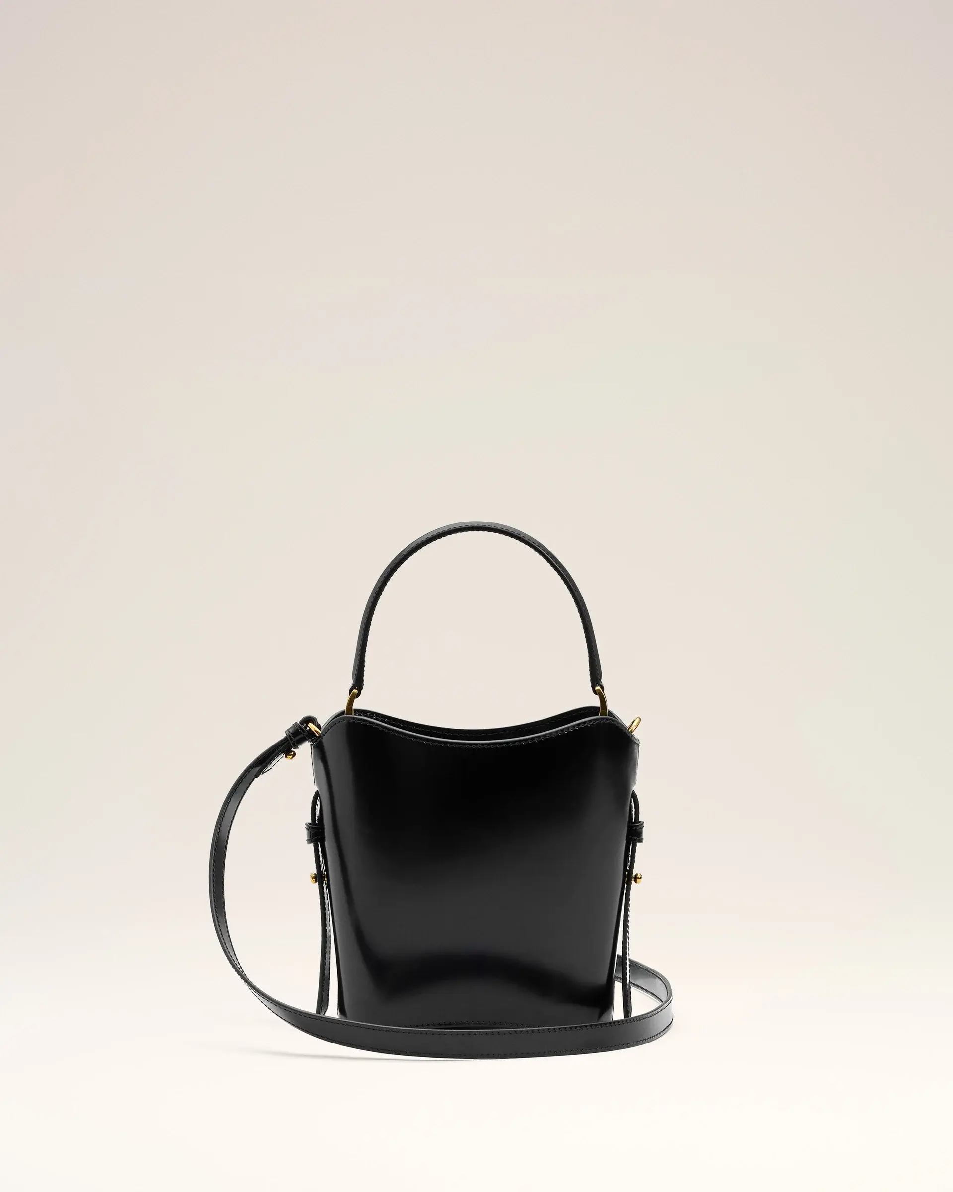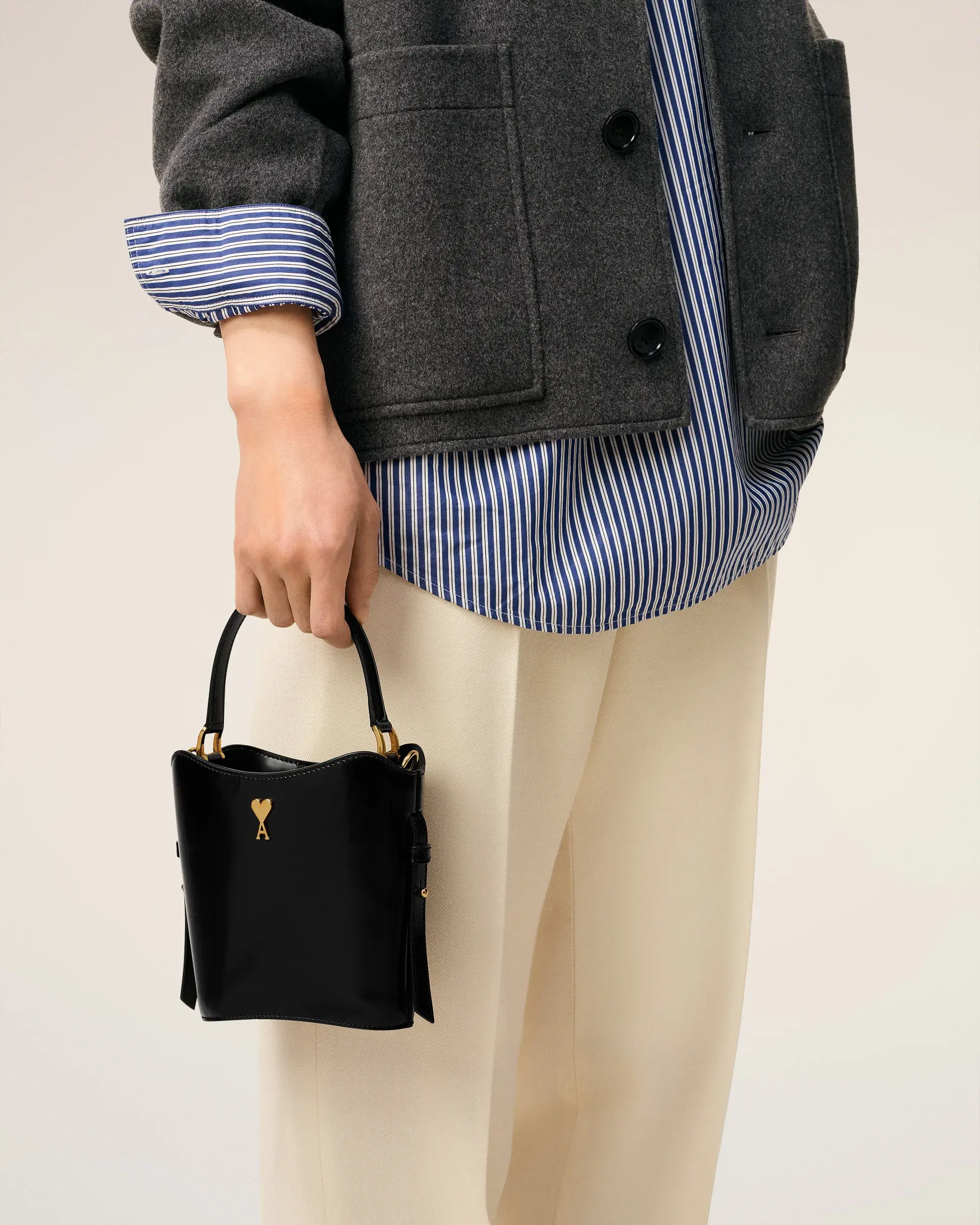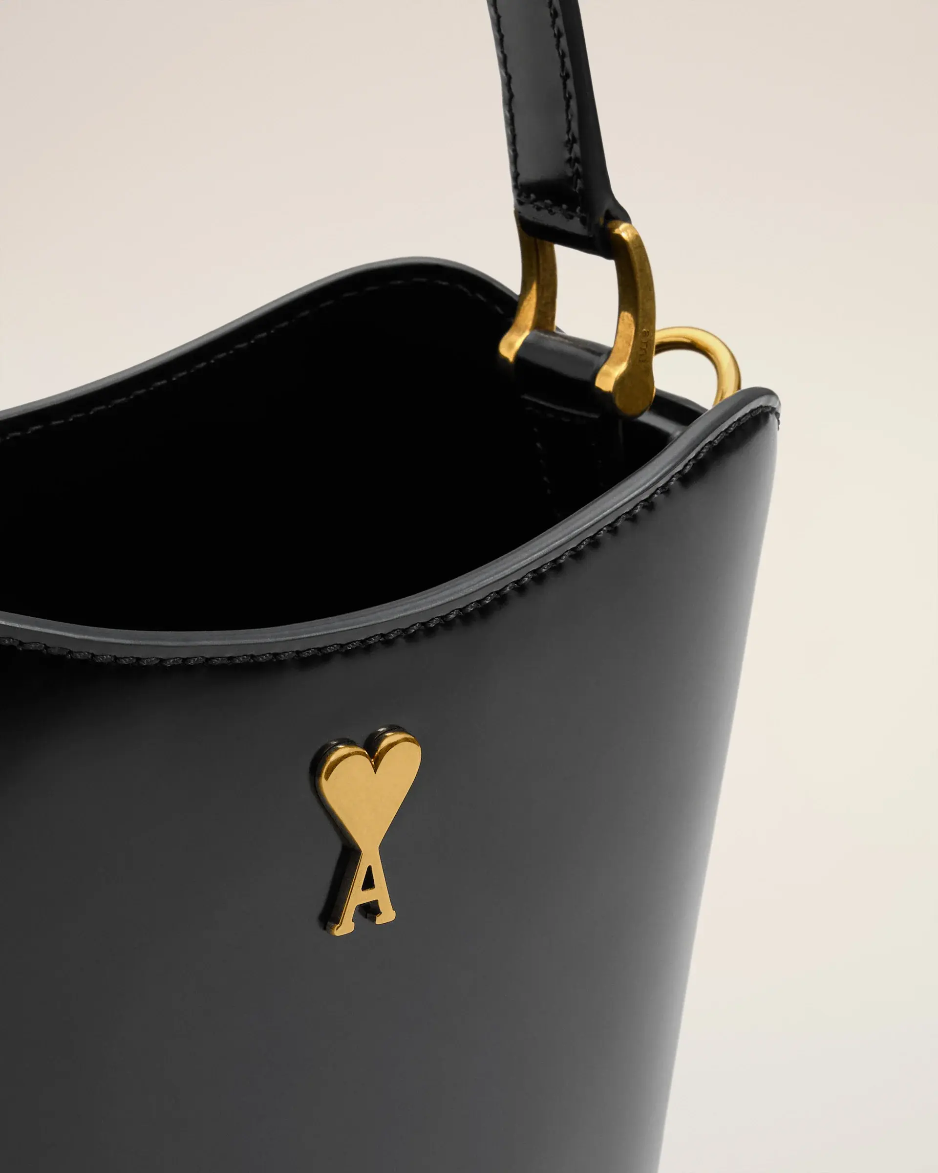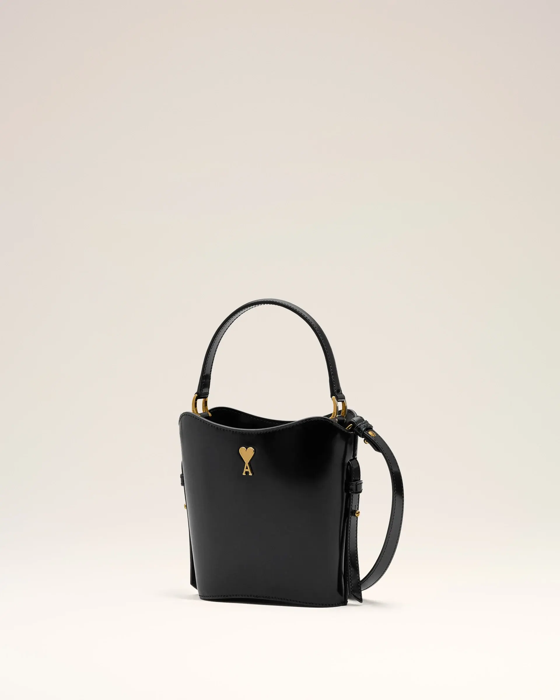 Unisex product Calfskin Adjustable leather strap, hand, shoulder or crossbody carry Metal hardware in vibrated brass color One central compartment with lambskin drawstring pouch Suede lambskin lining Ami de Coeur stud Size: 14 x 17 x 5 cm, width at the top 17 cm Made in Morocco (with love)