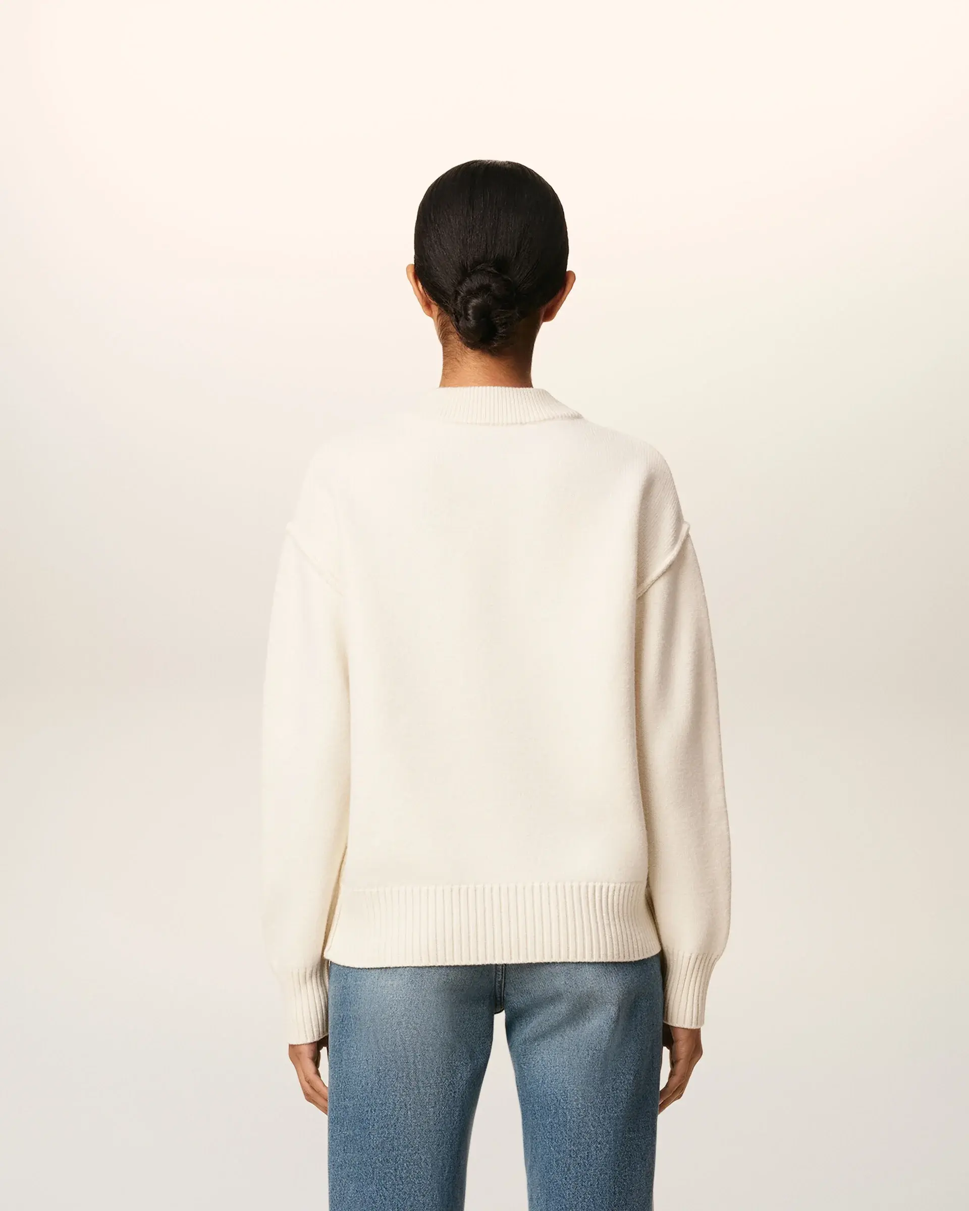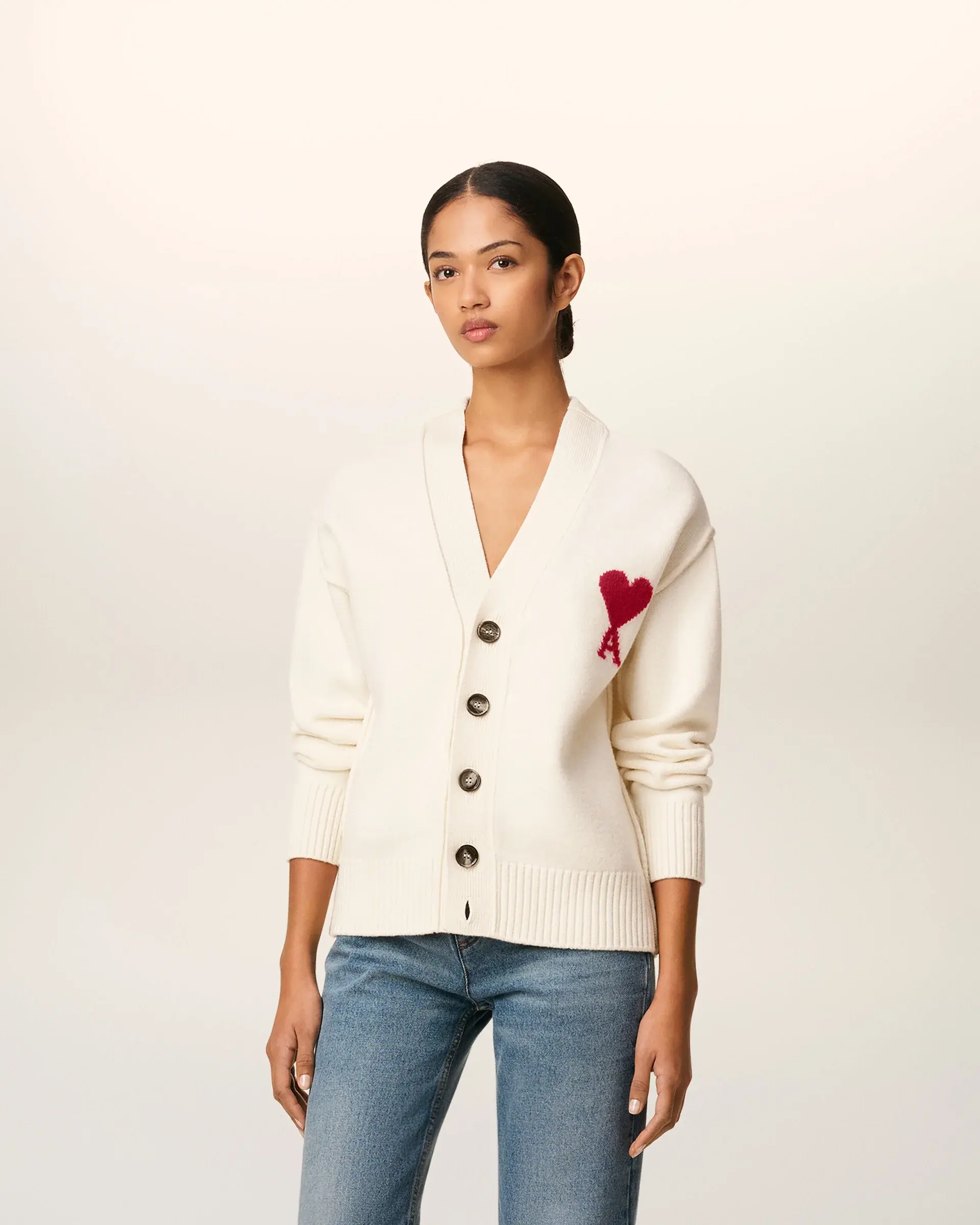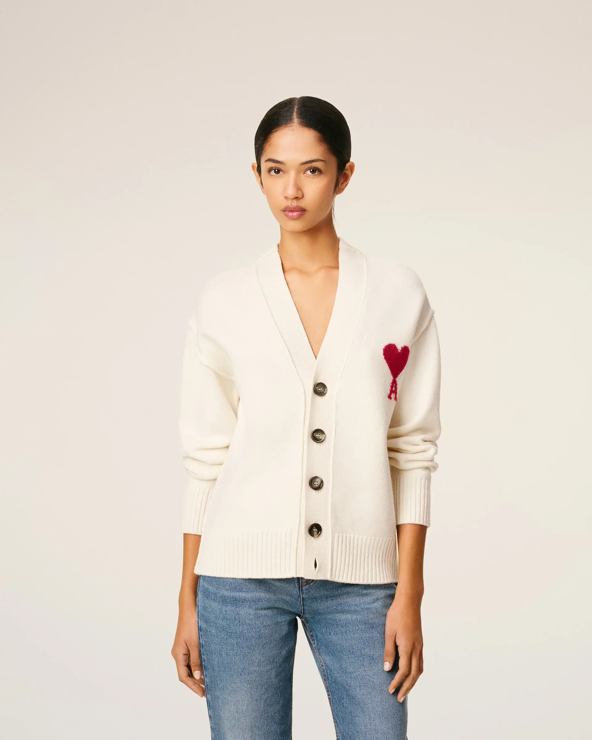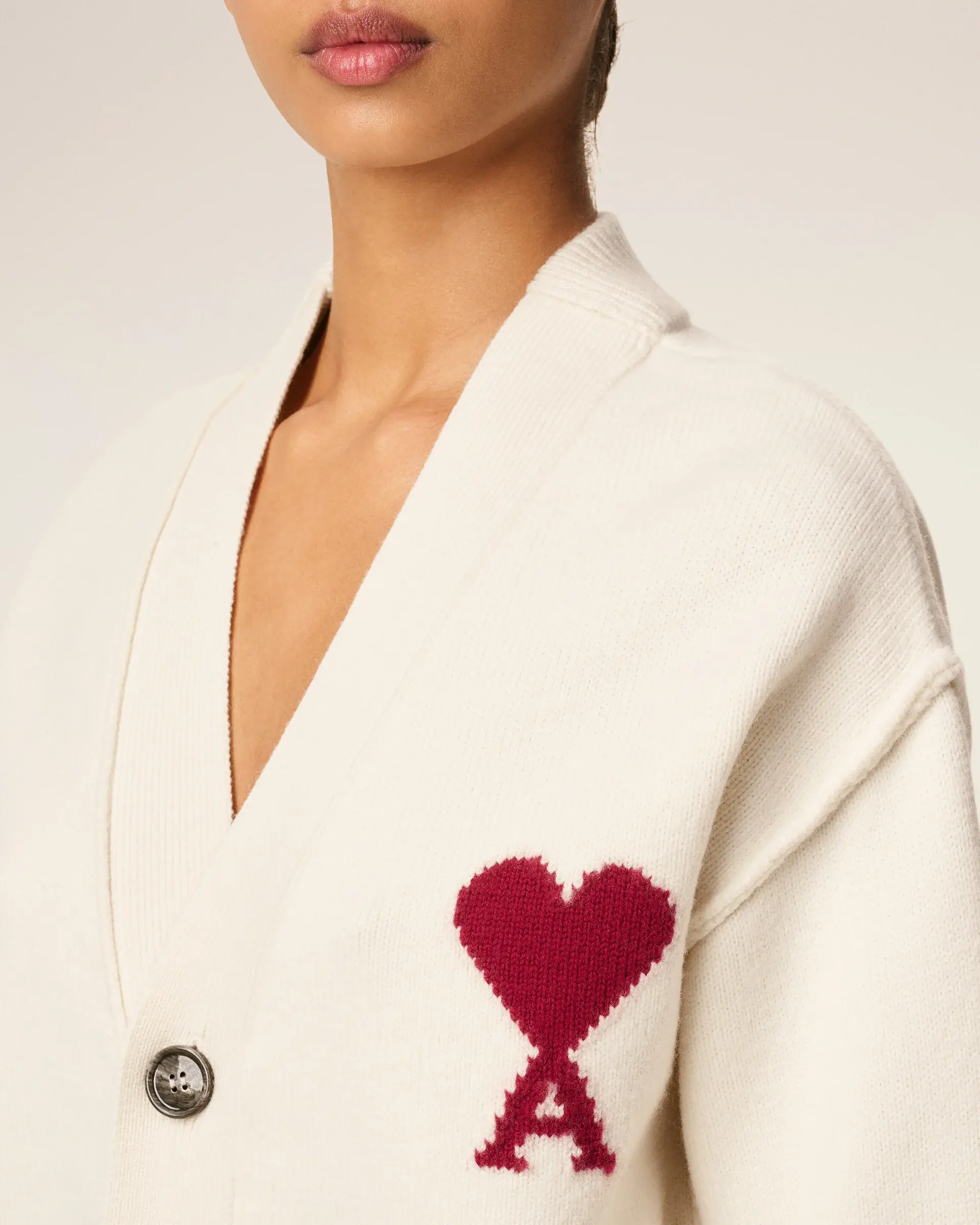 Unisex product "ami" engraved horn buttons Intarsia knitted Ami de Coeur on the chest Inside out seams Jersey stitch 64 cm center back length (size M) 58 cm center back length (size XS) Made in Portugal (with love)