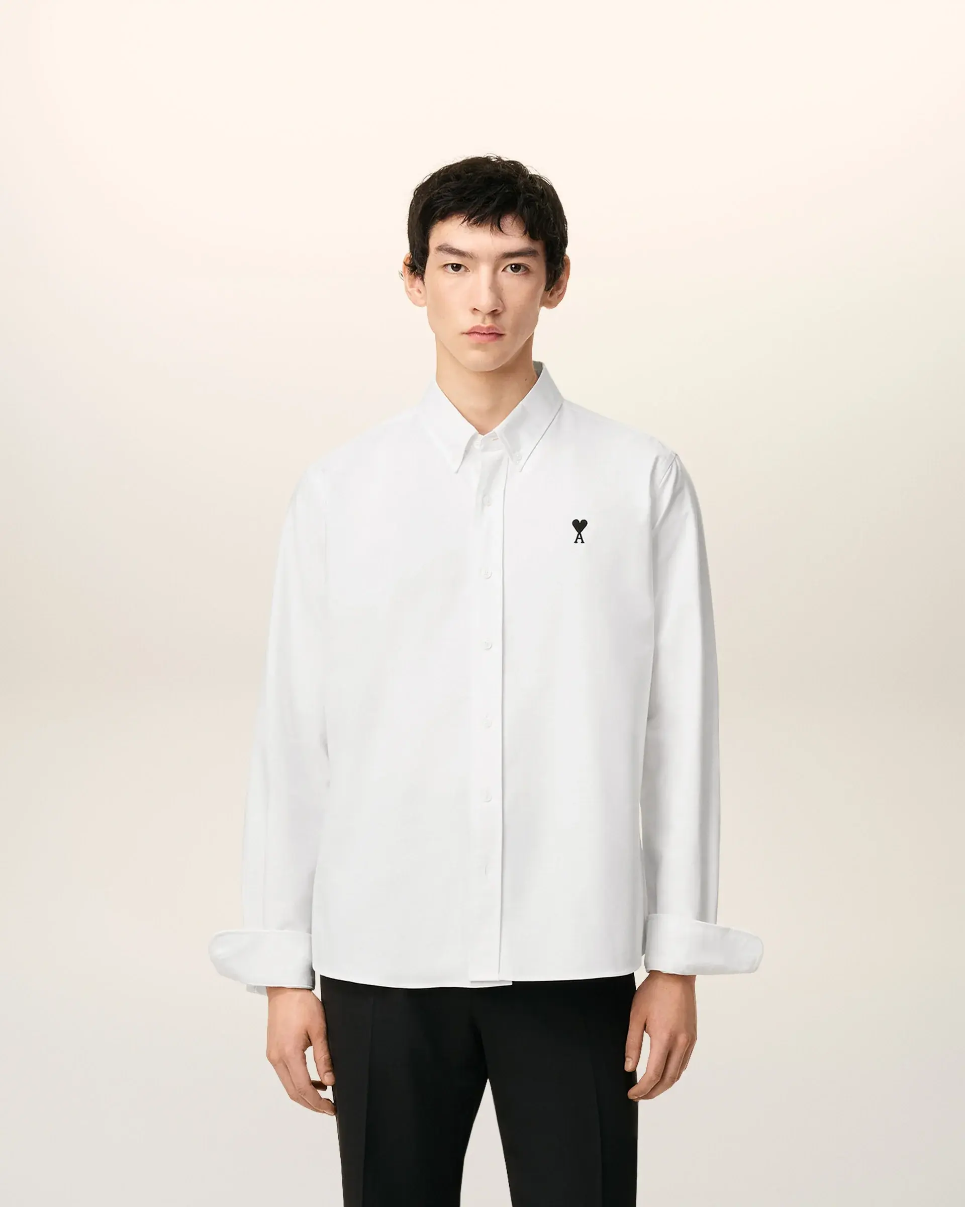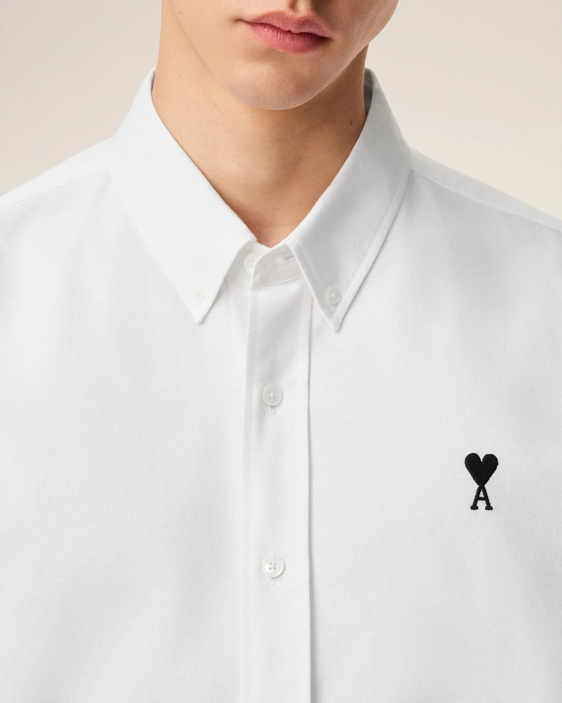 Classic fit Button down collar Buttoned tab on front and cuffs Mother of pearl buttons Black Ami de Coeur chest embroidery 77 cm center back length (size 40) Made in Bulgaria (with love)