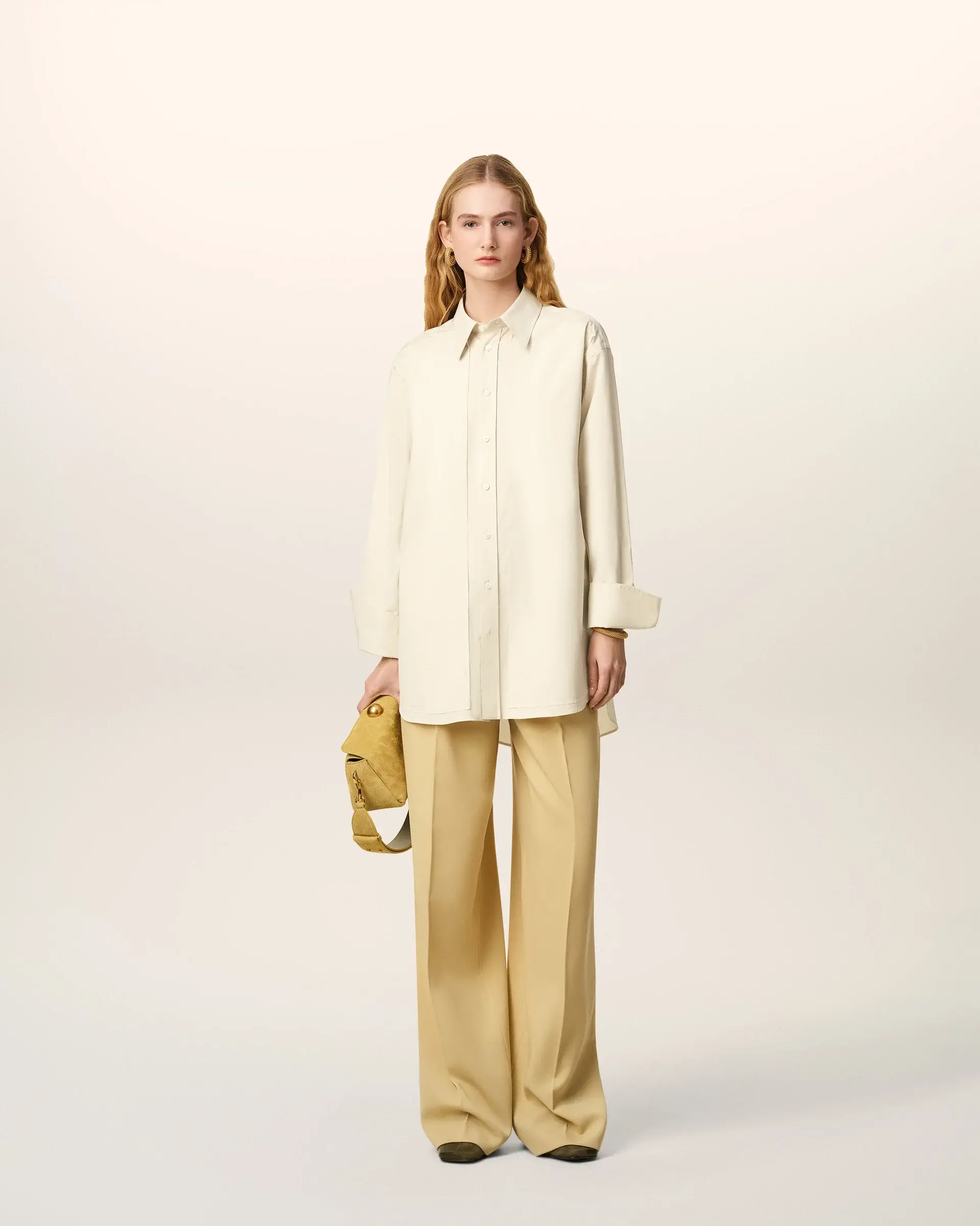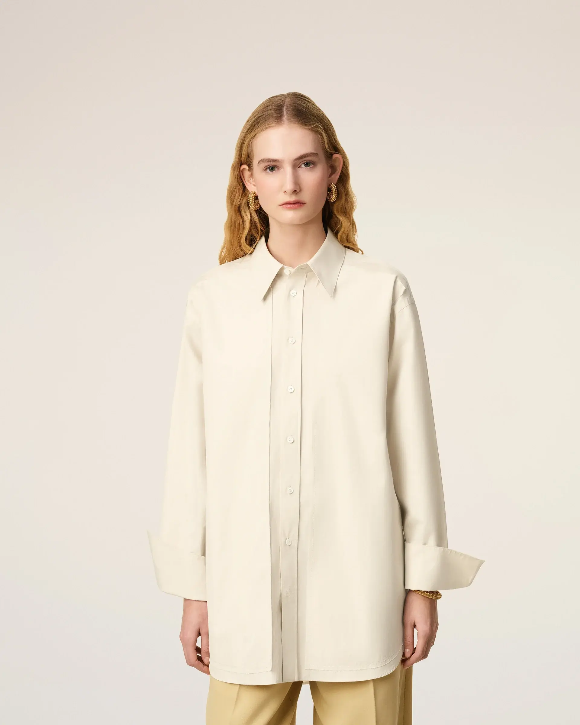 Long sleeves shirt with raw edged fabric applications in cotton poplin.