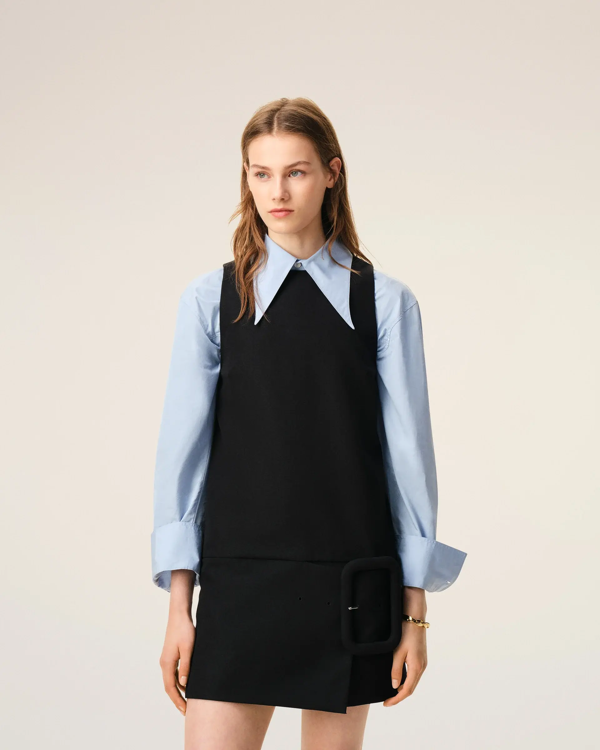 Short wool canvas dress with large buckle at waistband.