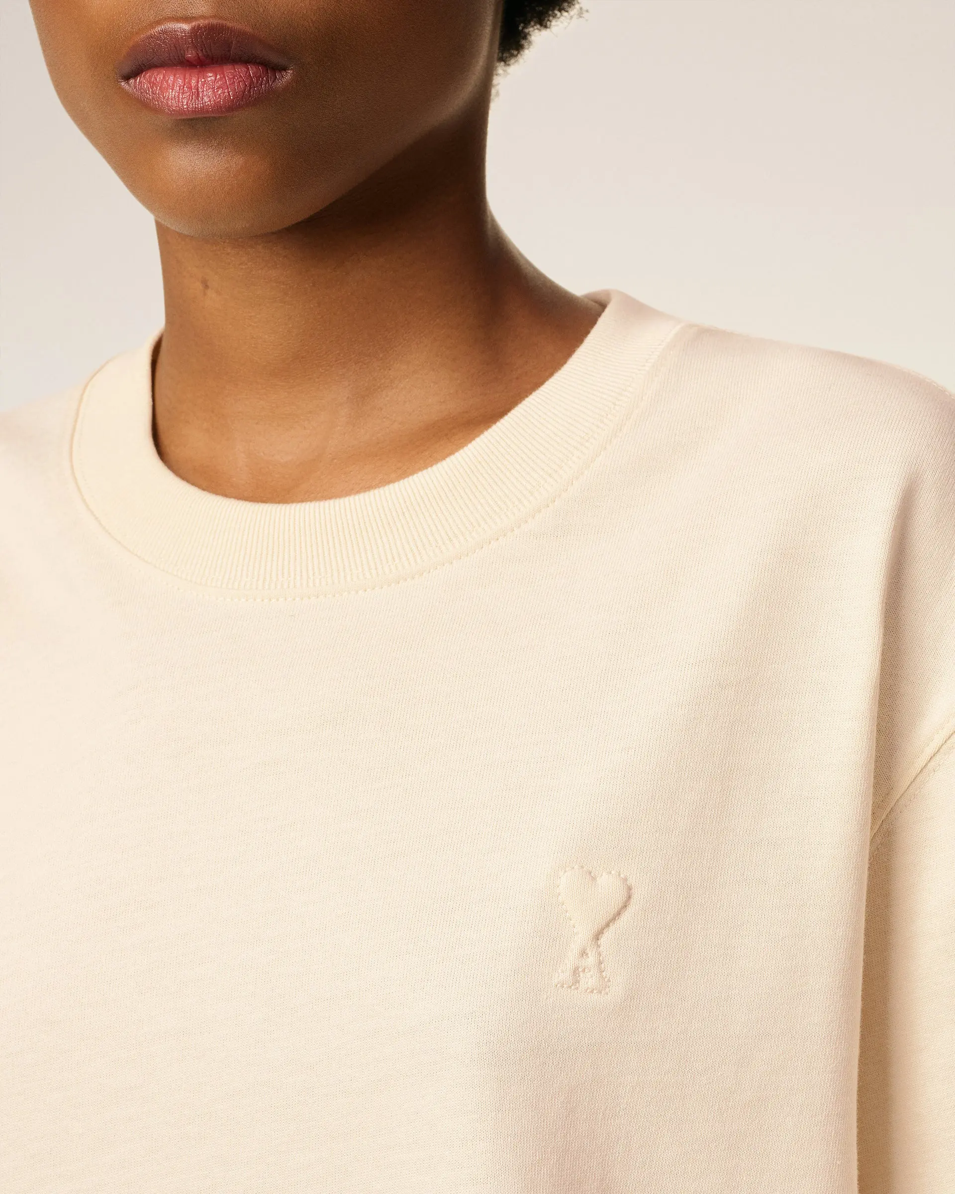 Tonal "ami" embroidery under back neckline