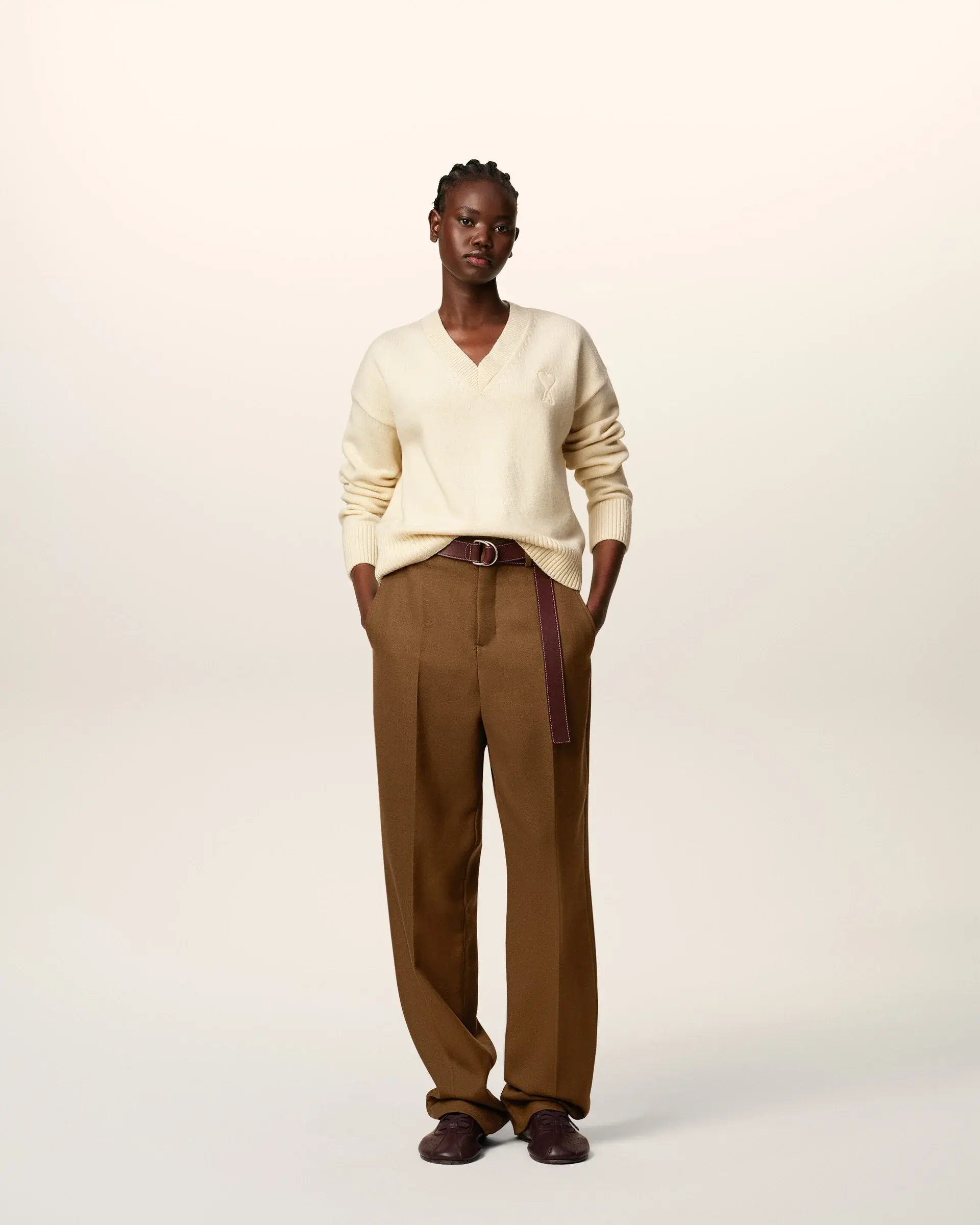 Unisex product V neck Ami de Coeur embossed embroidery on the chest Jersey stitch 62 cm center back length (size M) 56 cm center back length (size XS) Made in Italy (with love)