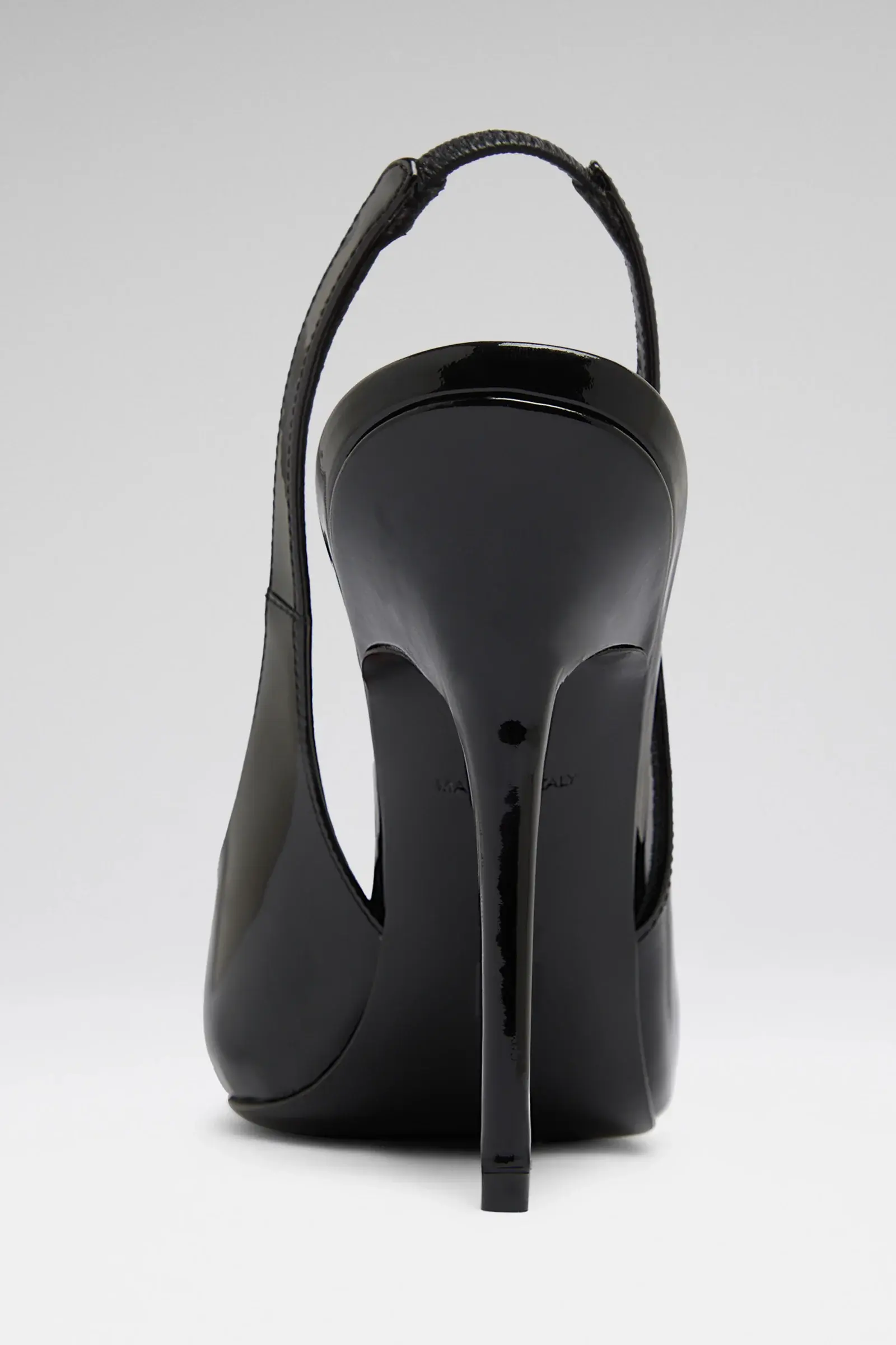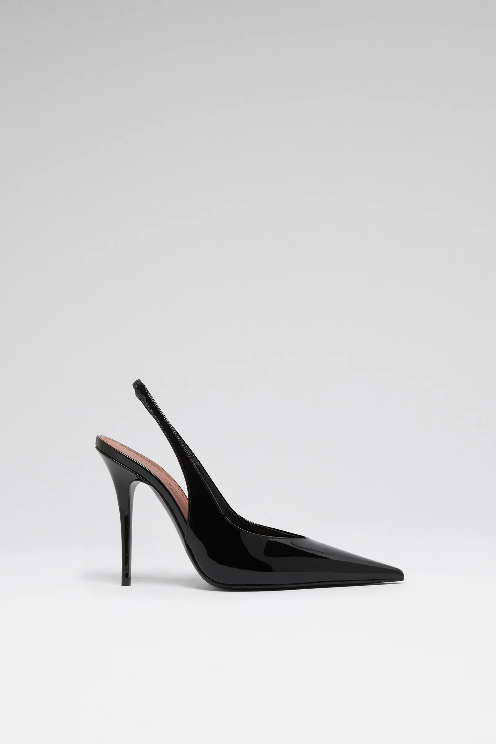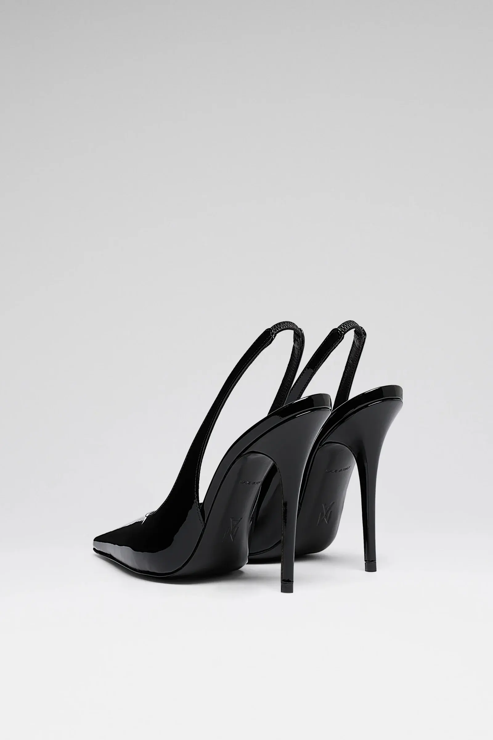 Anok Sling 105 Black Patent • 105mm Stiletto Heel • Pointed toe • Fits true to size Composition • Upper: 100% Laminated Calfskin • Lining: 100% Kid Lining • Sole: 90% Calfskin 10% TPU Origin Made in Italy