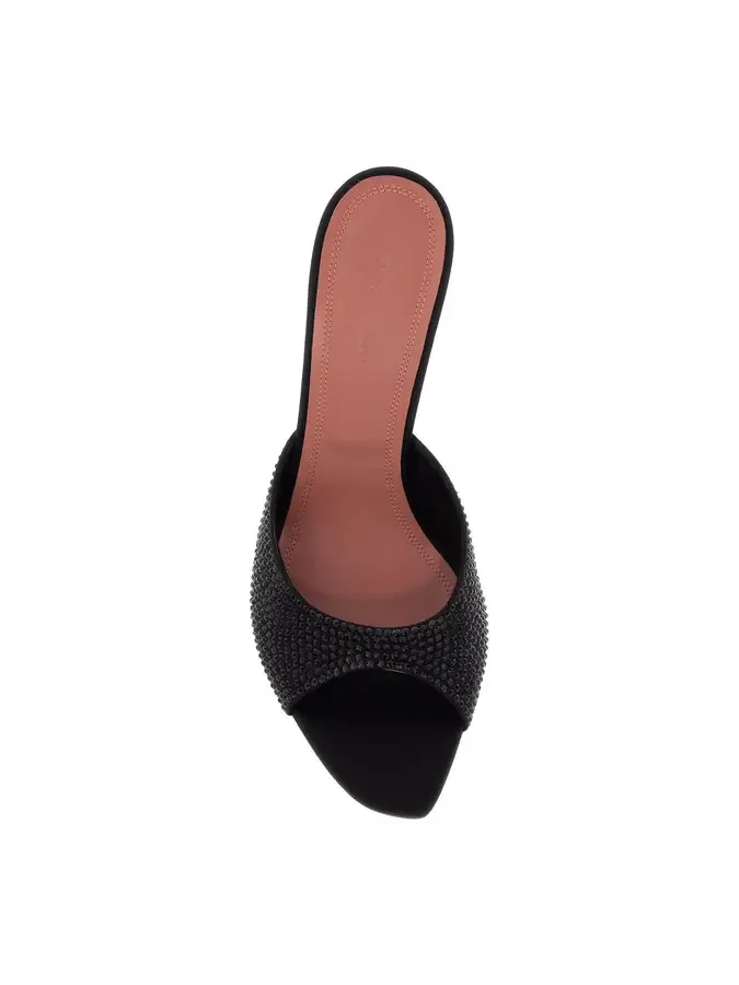 Amina Muaddi Alexa Satin Crystal Mules showcase luxurious silk satin adorned with a micro crystal band. Featuring a slightly squared toe and a covered heel, these mules combine a leather insole and sole with rubber inlay for comfort and durability, making them a chic wardrobe staple.