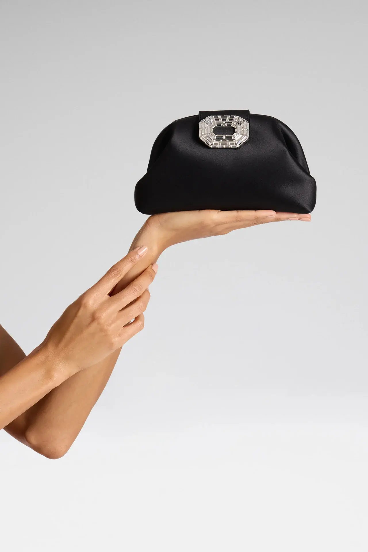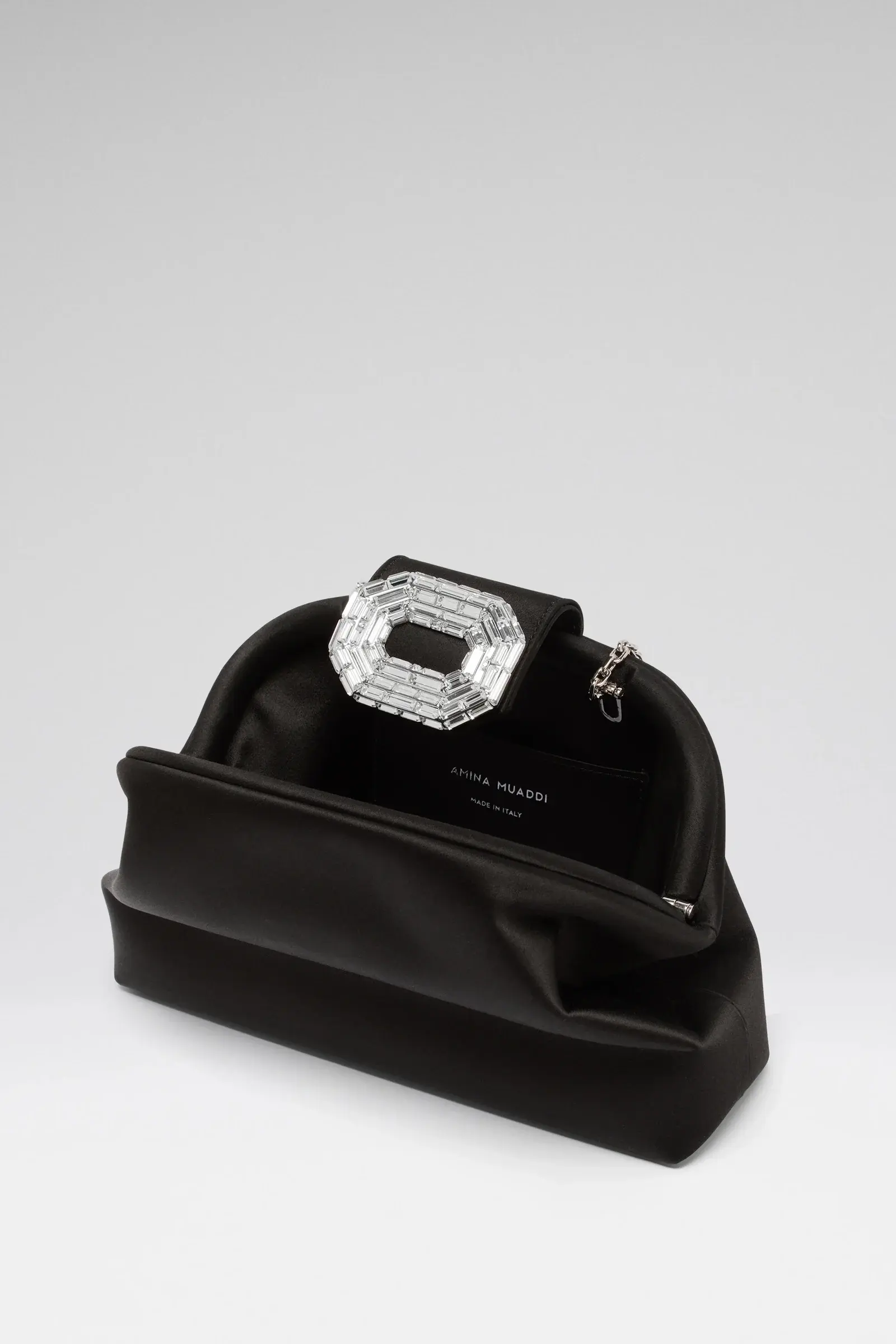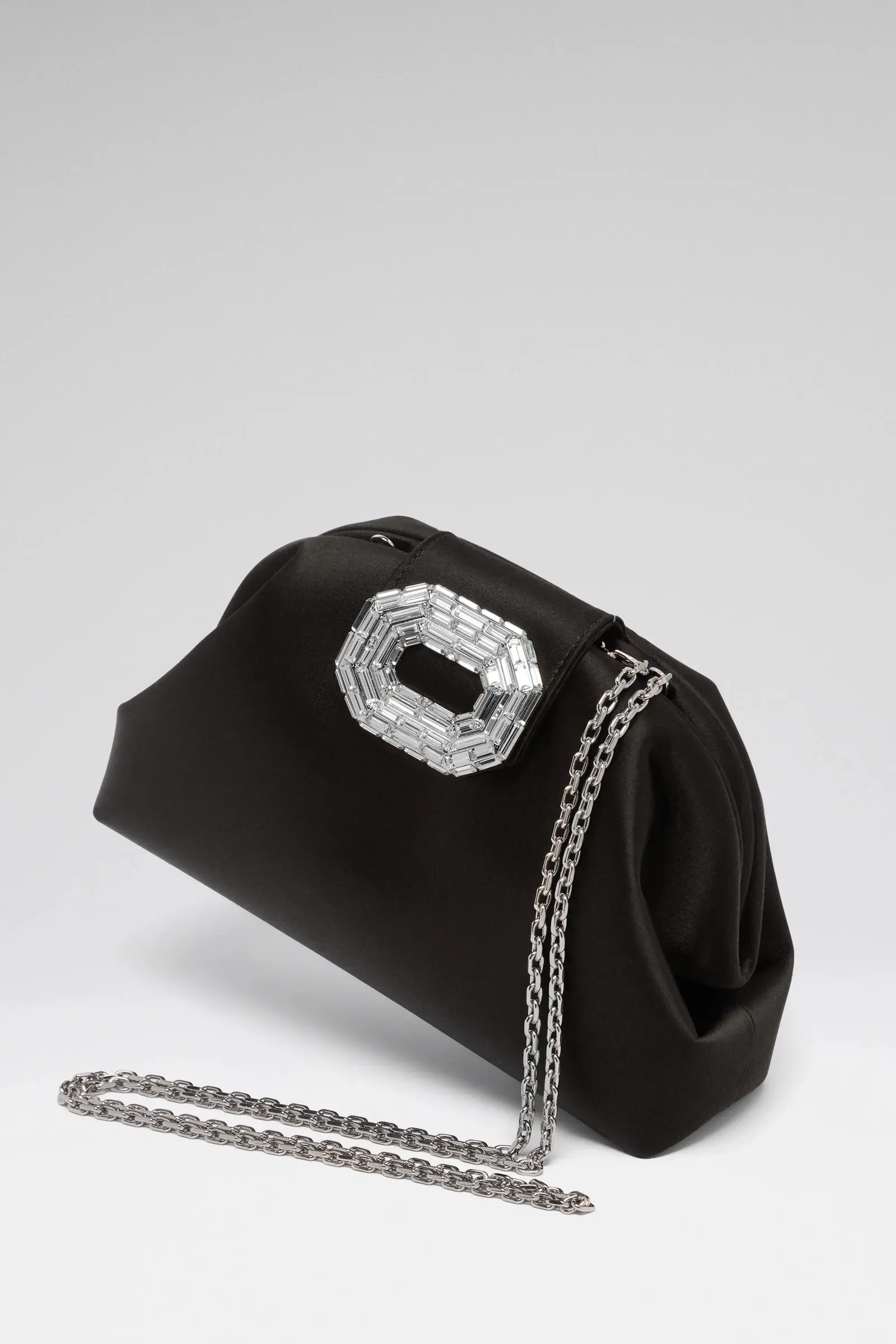 Camelia Clutch Black Satin • L 21cm x W 9cm x H 11cm • Signature Buckle Strap • Internal flat pocket • Magnetic closure • Cross Body Chain With Foldable Links • Dust Bag and Box Included Composition • External: 90% Satin and 10% Crystals • Internal: 100% Satin • Hardware: 100% Brass Origin Made in Italy