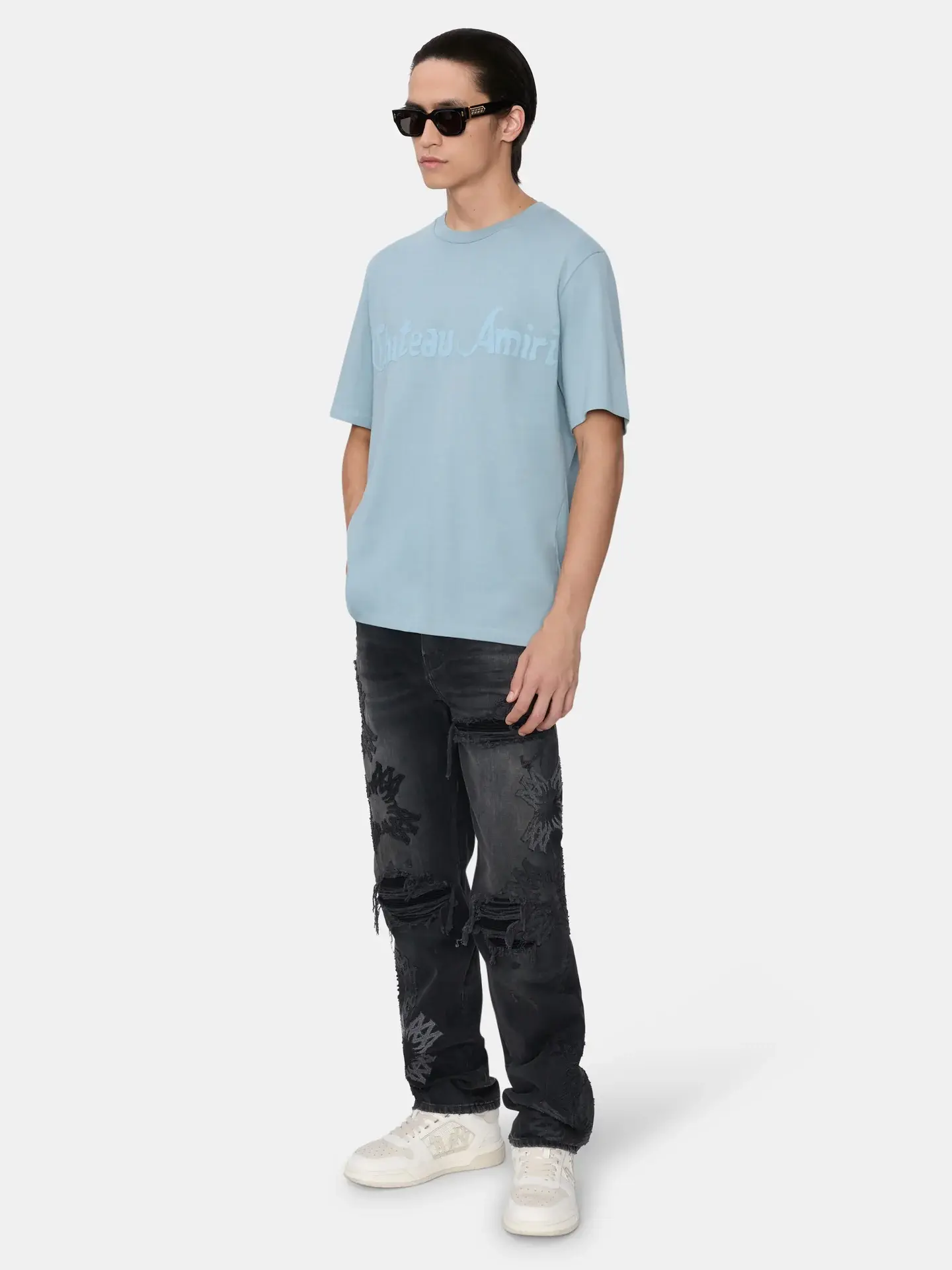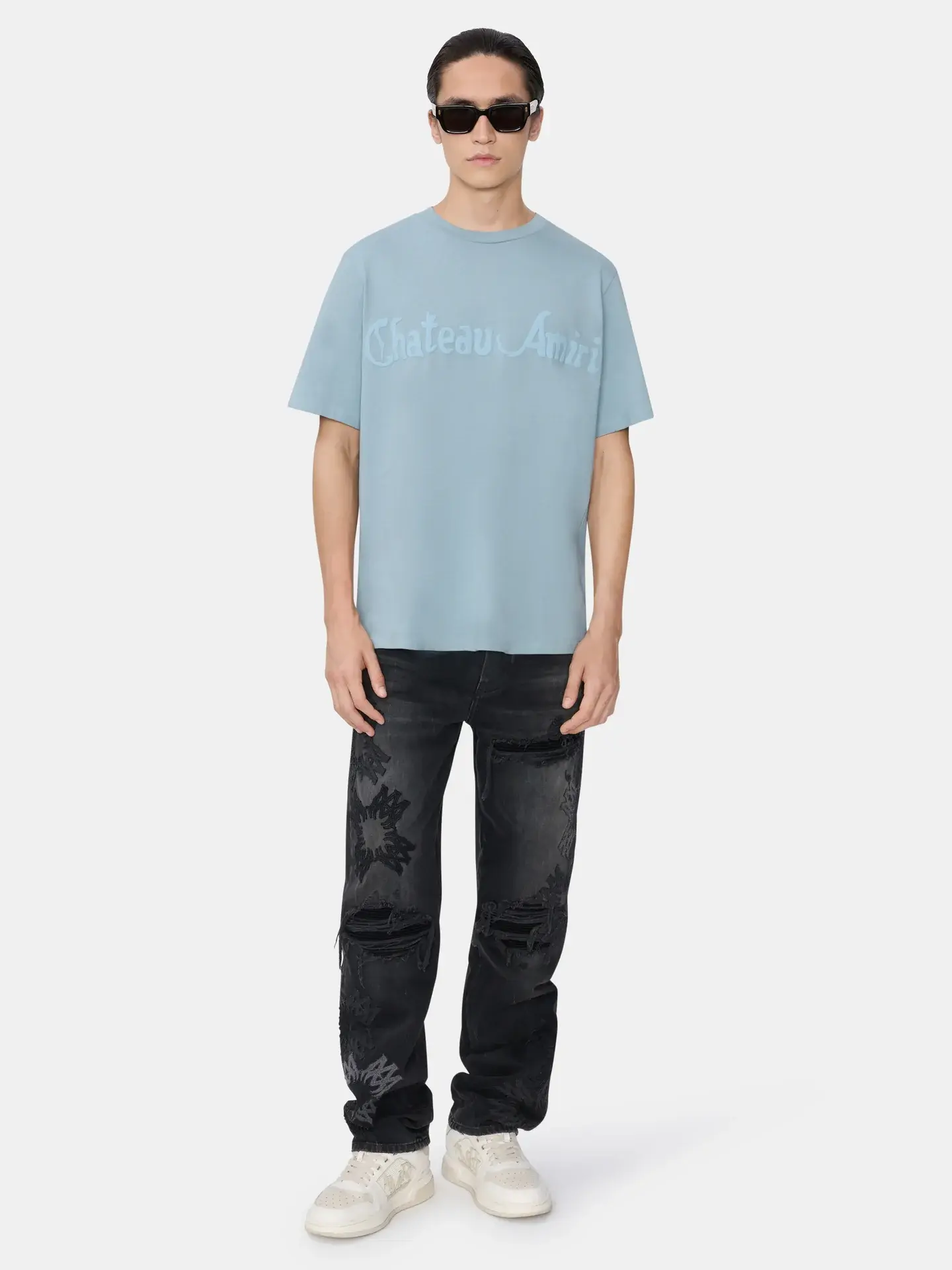 Spring-Summer 2026 introduces Chateau AMIRI, an imagined premier hotel inspired by iconic Hollywood hideaways. The Chateau AMIRI Tonal Tee in cotton is illustrated with a seasonal logo in subtle monochrome.