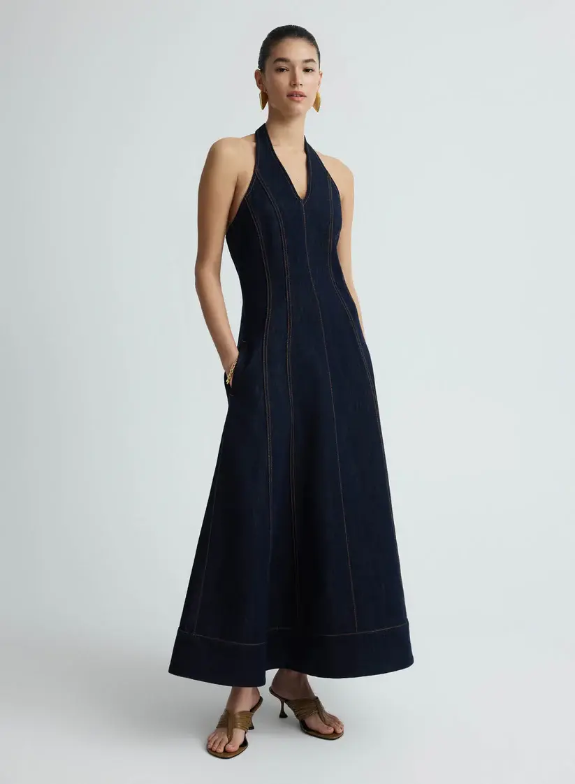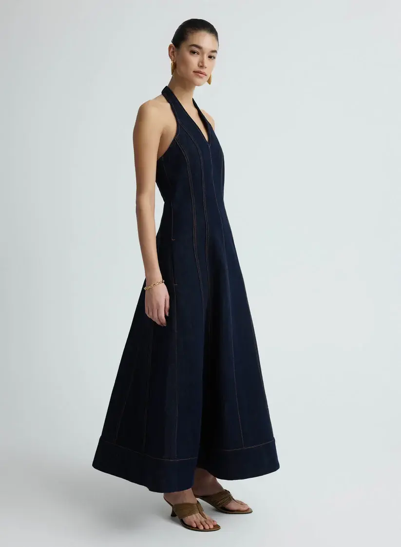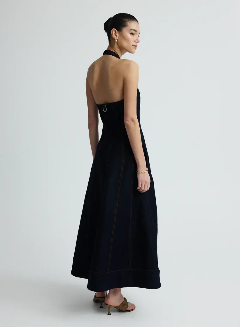 The Knox Dress in Dark Indigo is a halter midi dress, featuring a deep V-neckline and panelled seams that contour the body before falling into a full-length A-line skirt. Contrast stitching adds definition to its structured lines, while discreet pockets lend everyday ease.