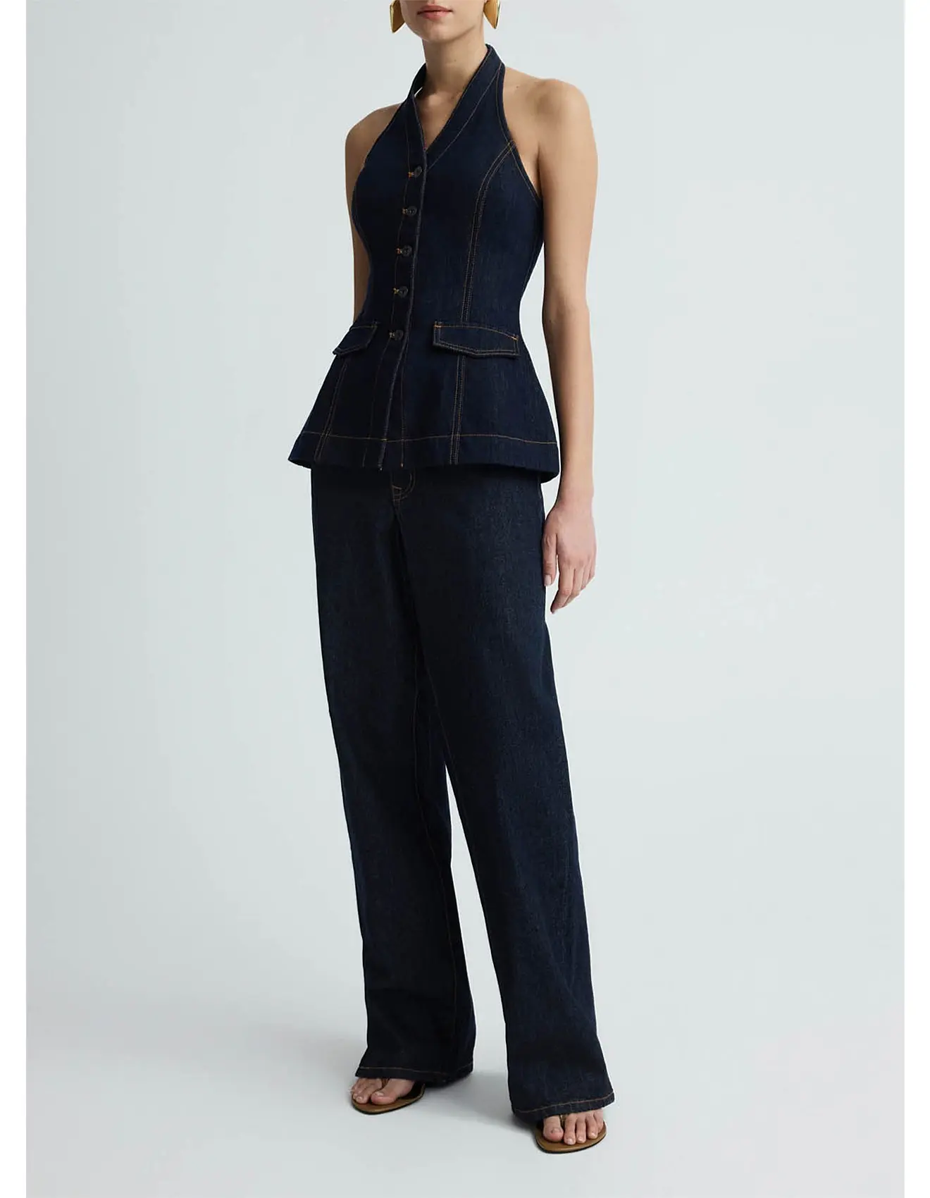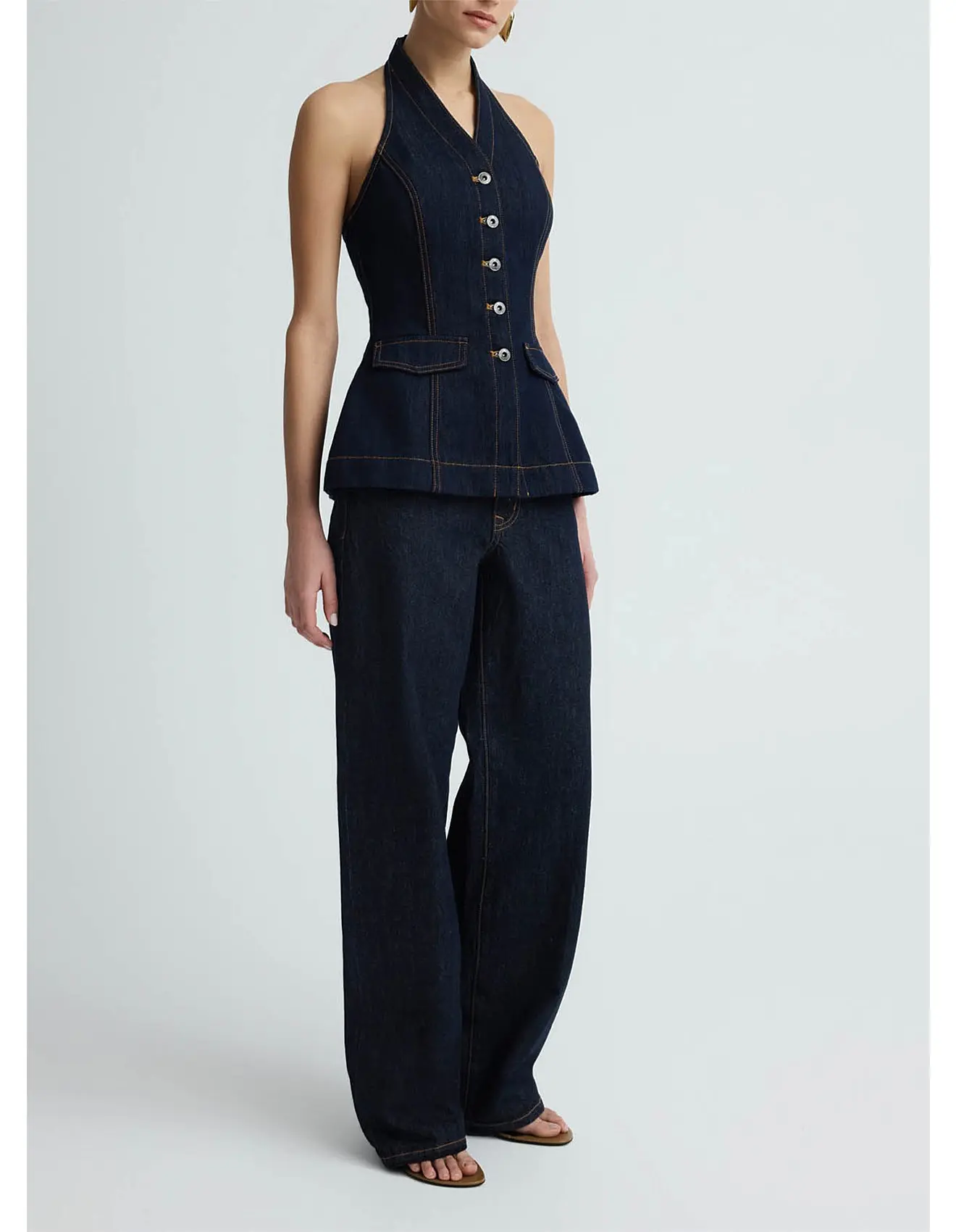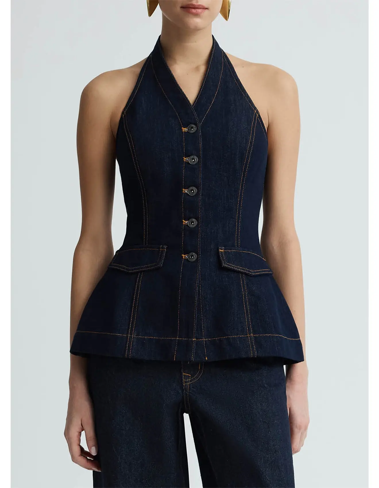The Rhea Top in Dark Indigo is a halter-style silhouette featuring a button-down front, sharp tailoring lines and flap pocket detailing at the waist. Designed with contrast stitching to highlight its structured shape. Pair with the Finn Jeans for the full set.