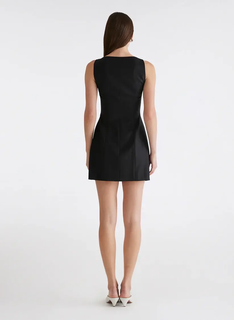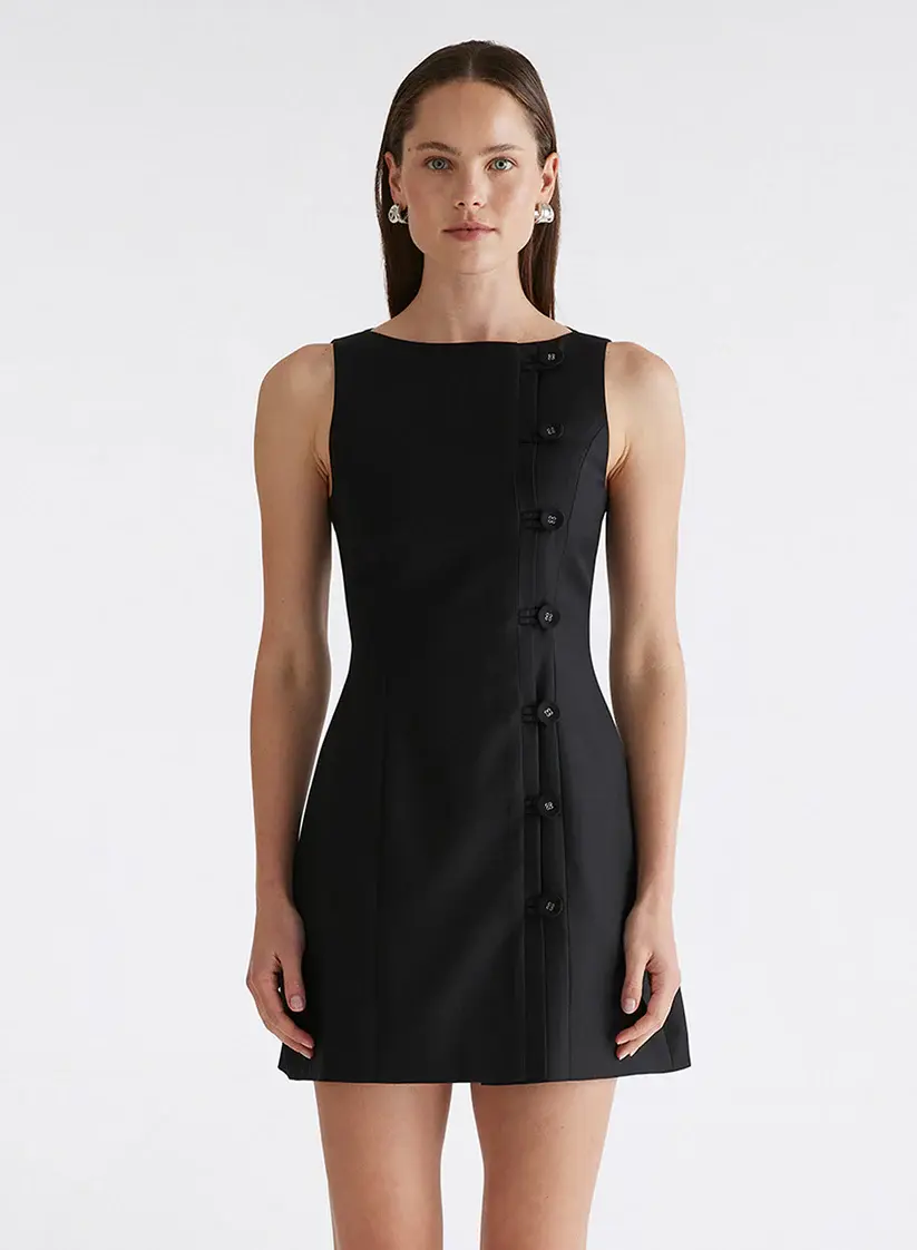 The Olympia Dress in Black is cut in a seasonless lightweight wool blend made for endless wardrobe rotation. A sleeveless tailored mini dress completed with a high round neckline, and waist defining lines. Detailed with a side, self covered button closure and complete lining. Style with flats for daytime lunches or heels for evening events.